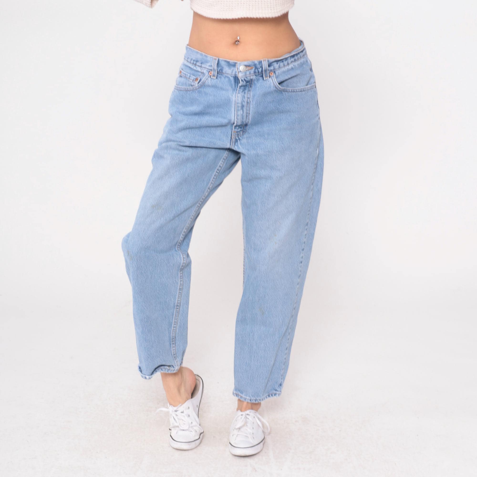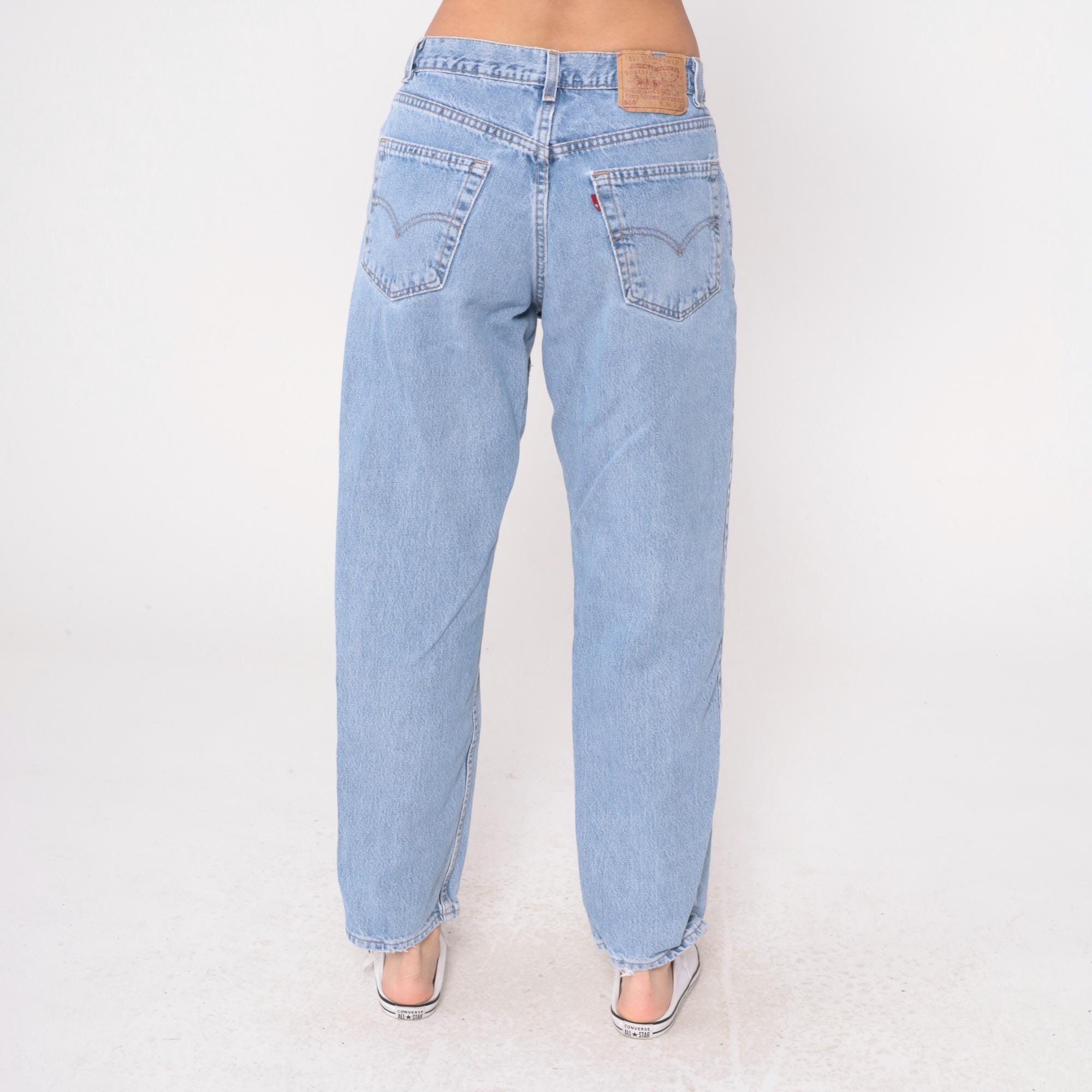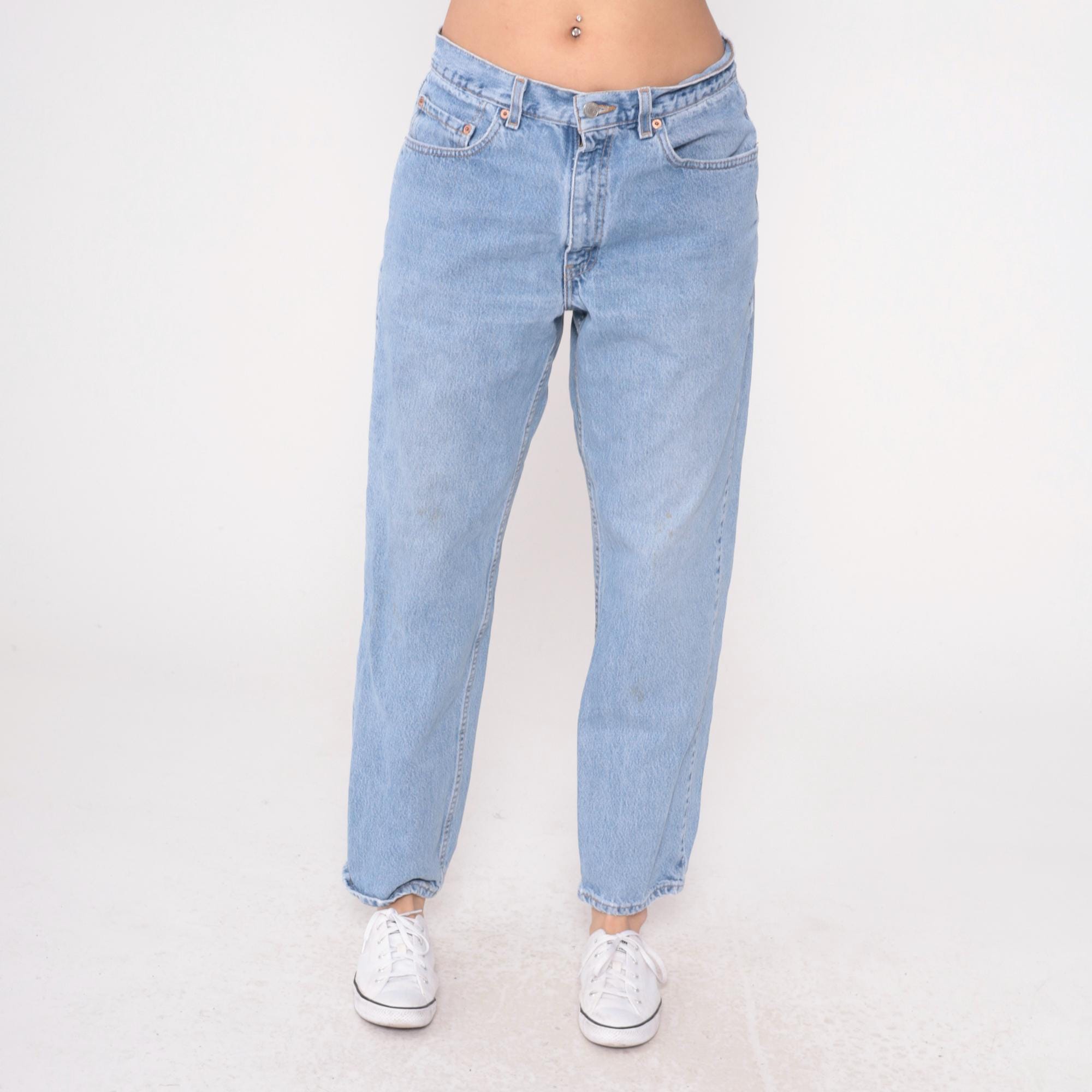 90s light blue jeans from Levi's 550 with relaxed fit and straight leg. Button fly closure, classic five-pocket styling with signature arcuate stitching on back pockets.
