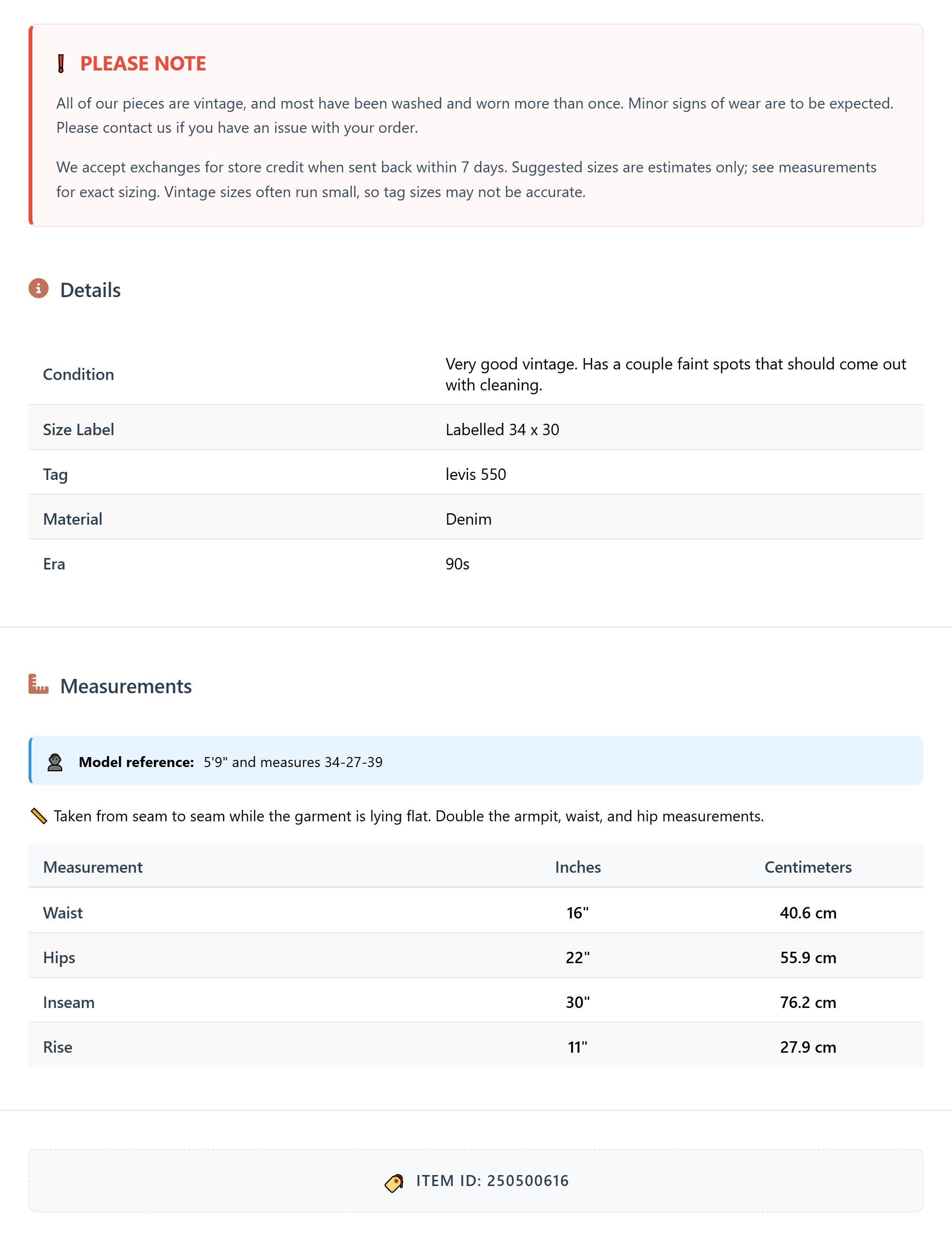 Vintage denim was usually made without any stretch, unlike modern jeans. Check the measurements to ensure proper fit, and remember to give yourself a little wiggle room in the waist and hips, depending on your preferred fit.