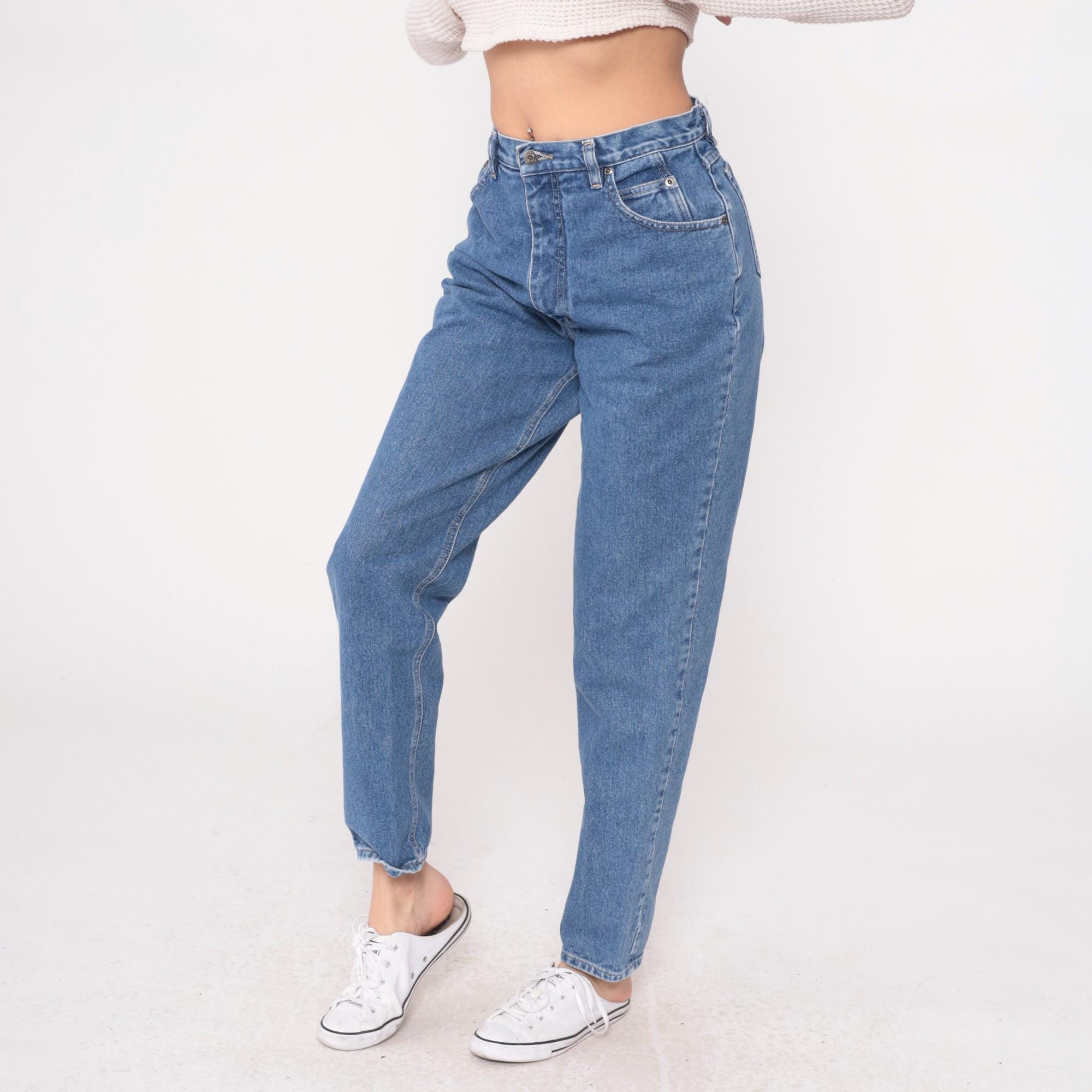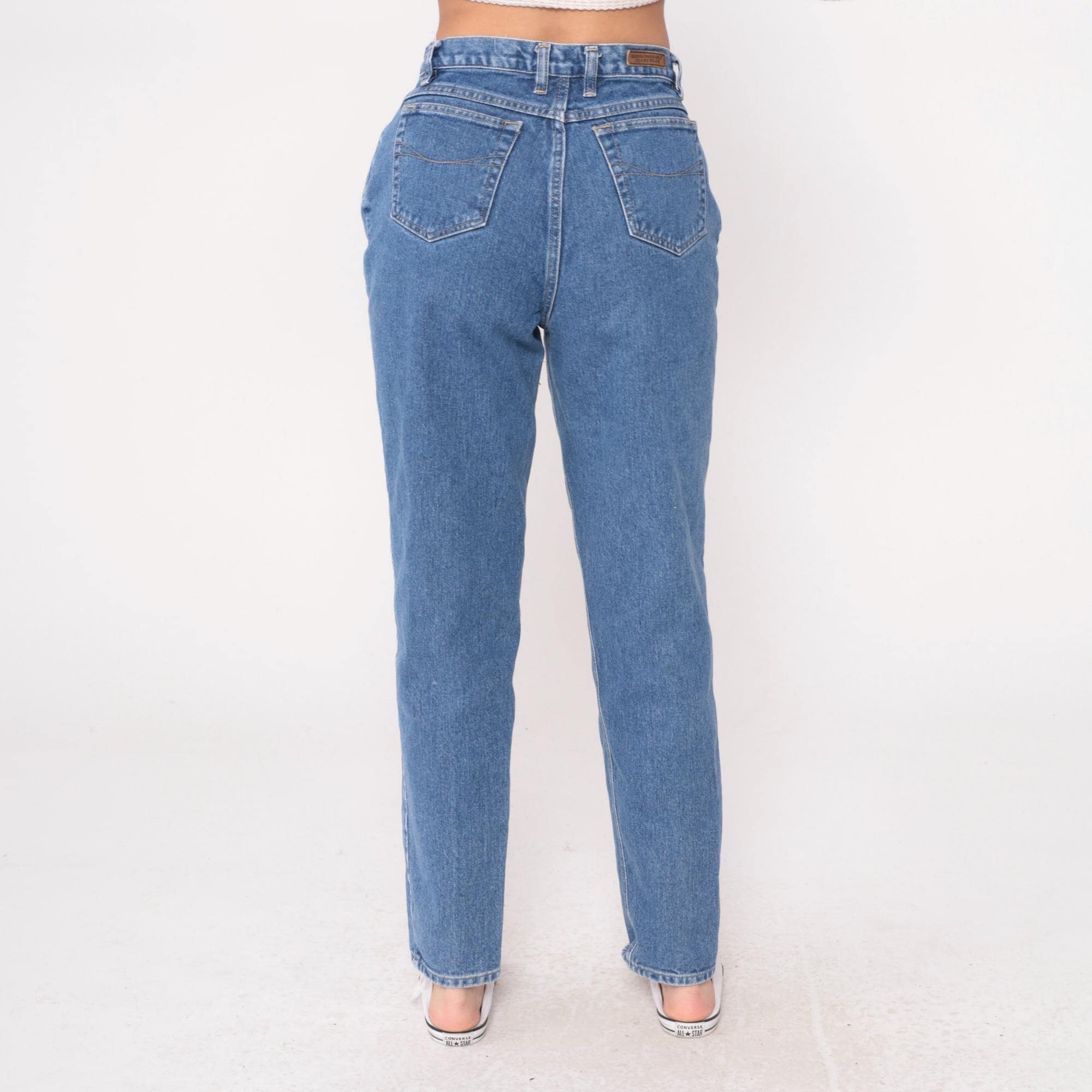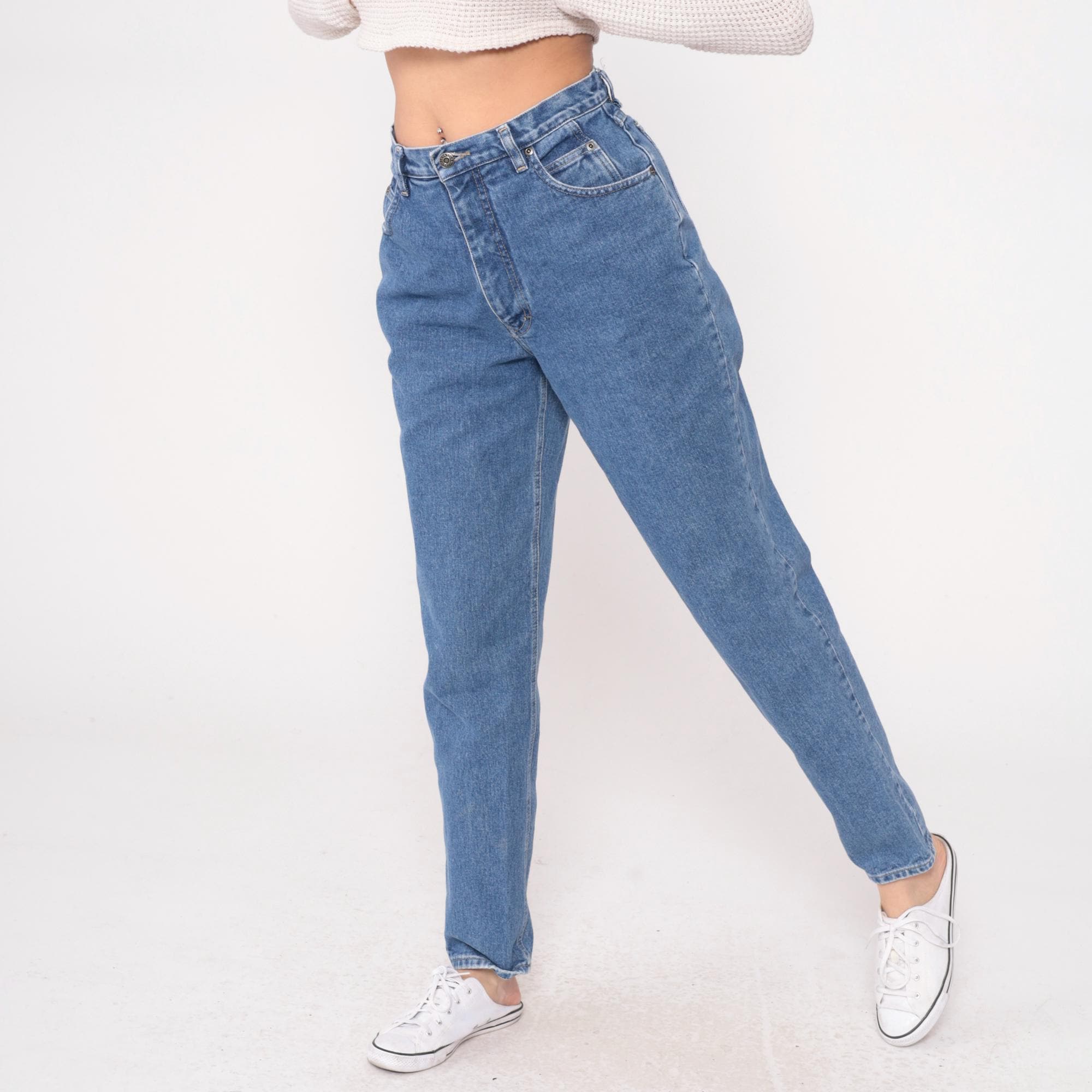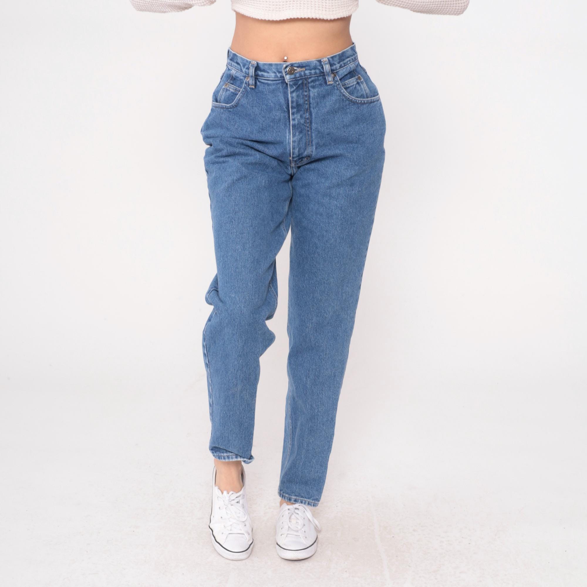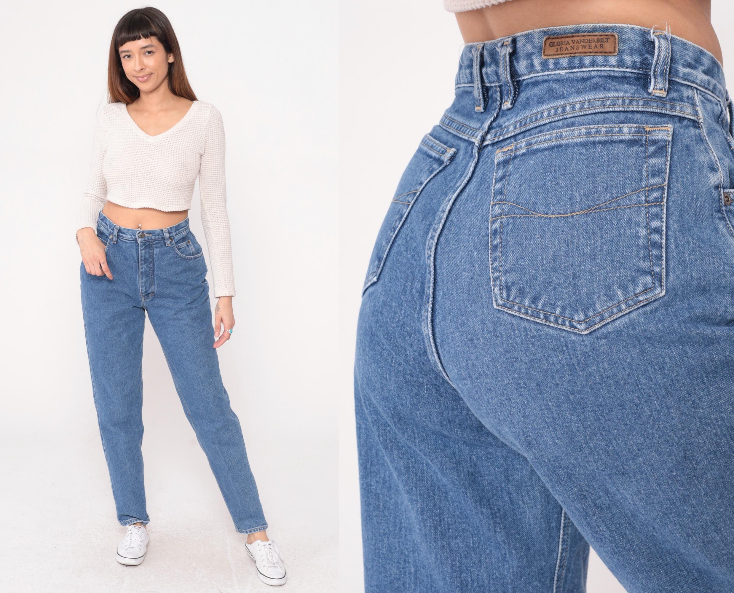 90s medium wash blue jeans from Gloria Vanderbilt with high-waisted fit and straight leg silhouette. Five-pocket styling with button fly closure. Ankle-length inseam with raw hem finish.