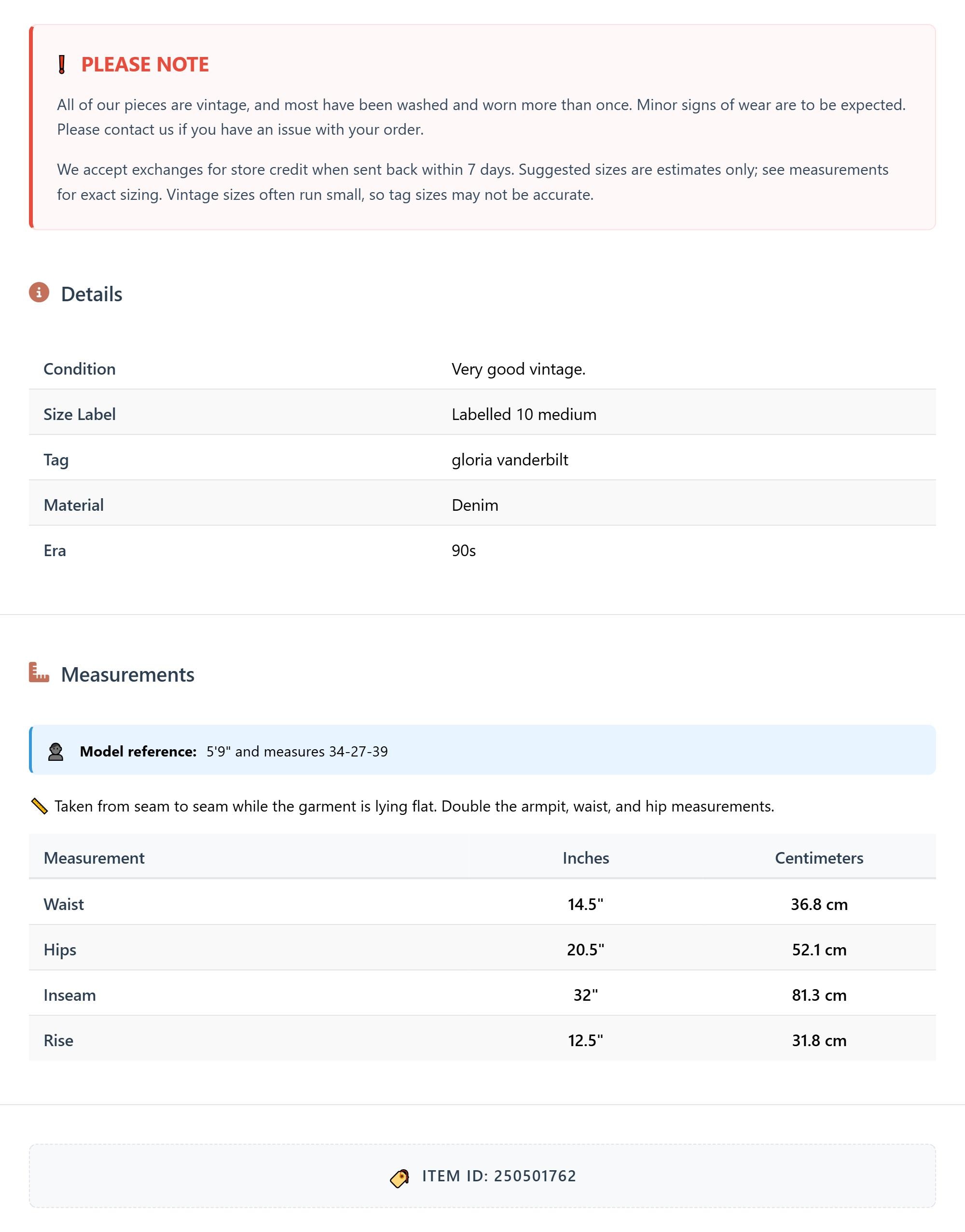 Vintage denim was usually made without any stretch, unlike modern jeans. Check the measurements to ensure proper fit, and remember to give yourself a little wiggle room in the waist and hips, depending on your preferred fit.