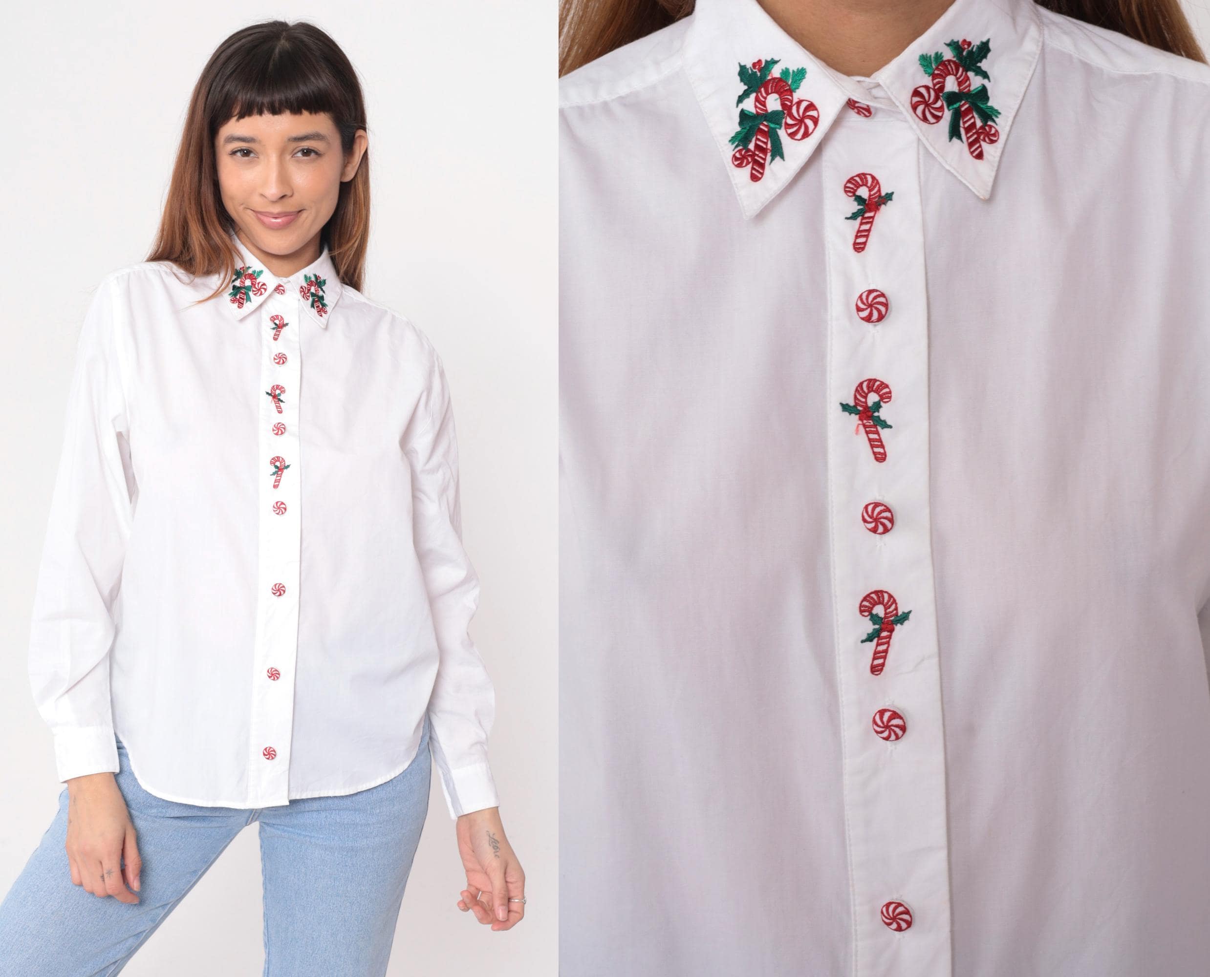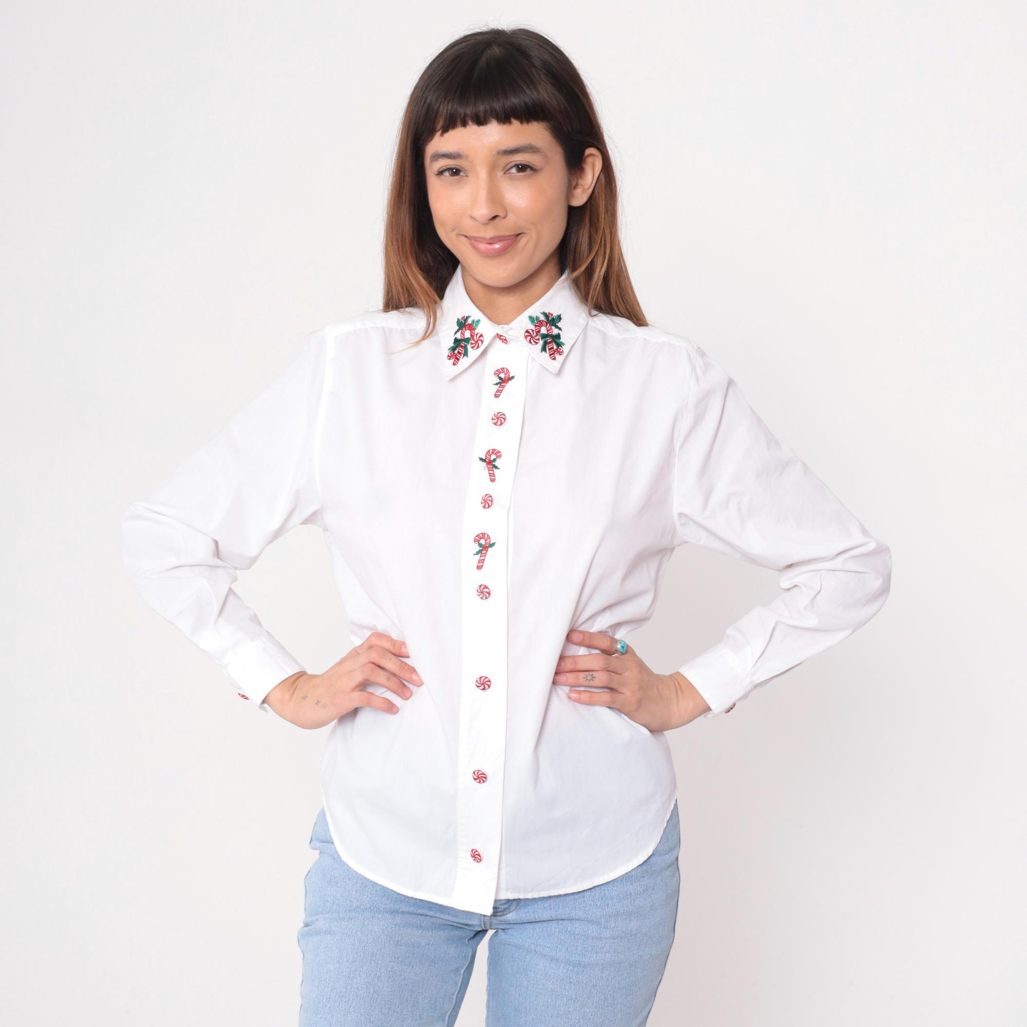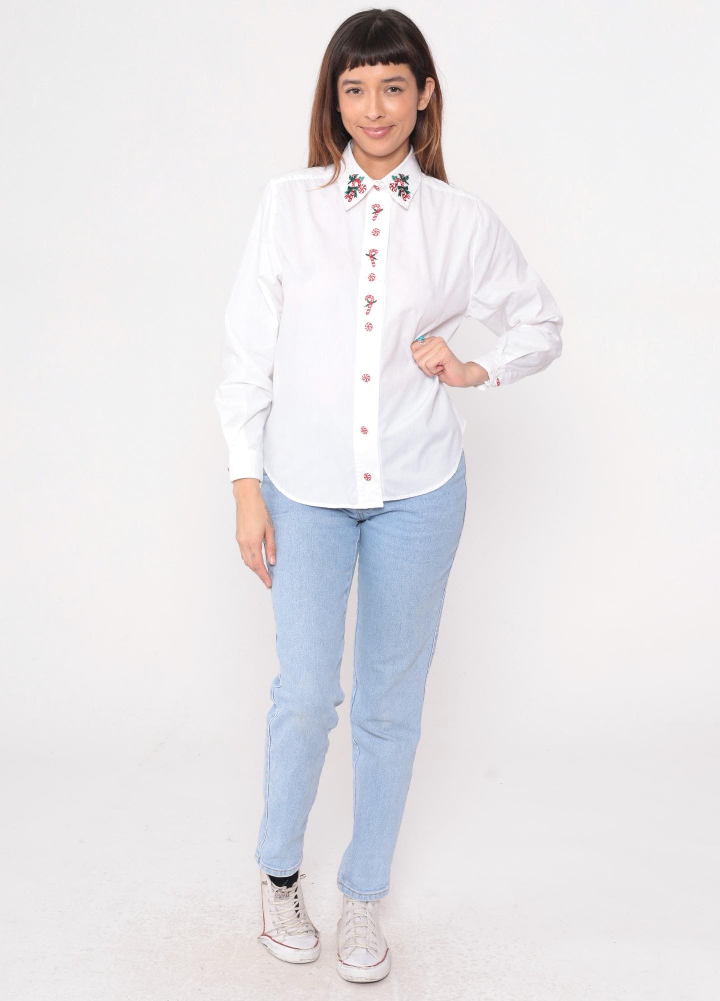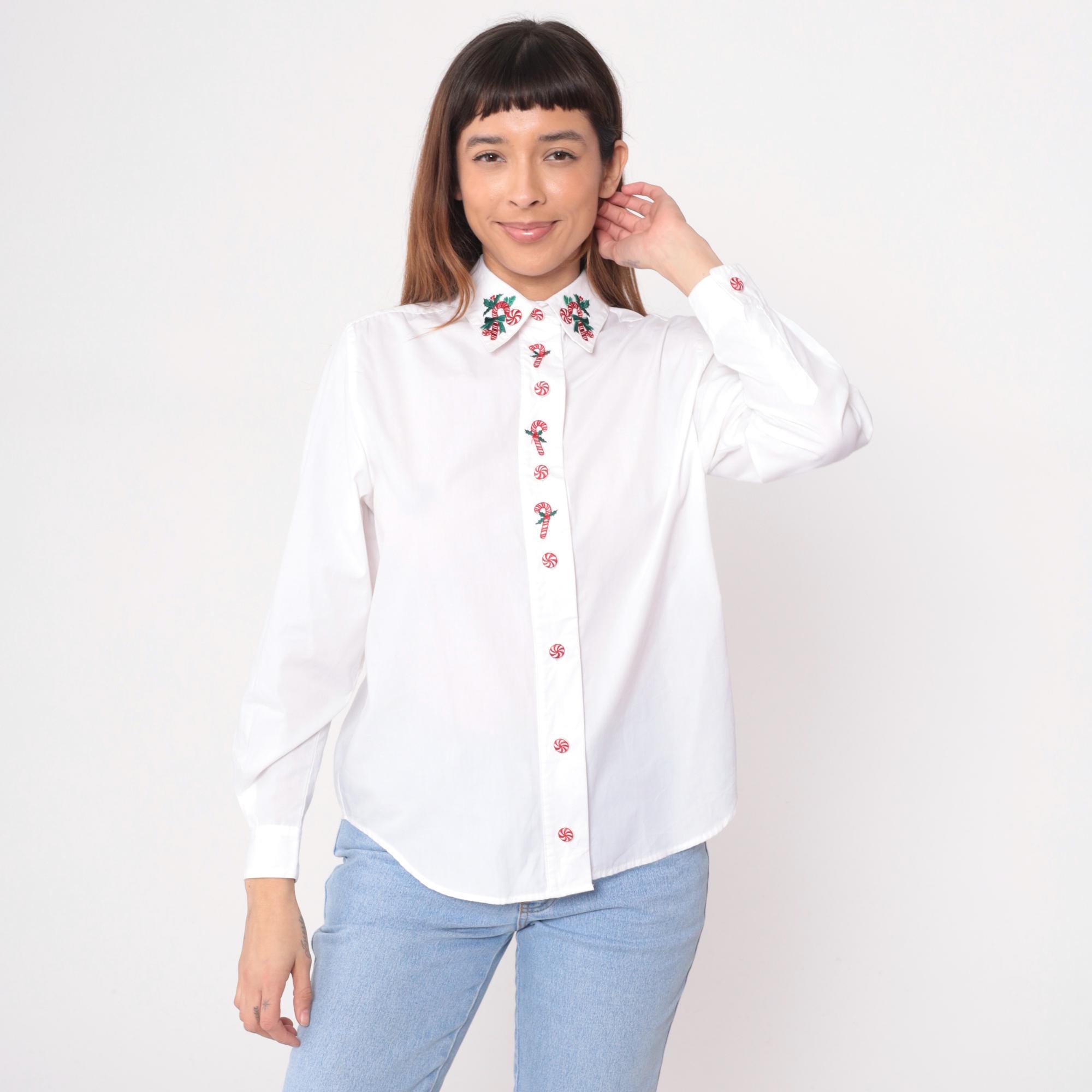 80s white button-up shirt from Karen Scott with candy cane and peppermint embroidery on collar and down the button placket. Long sleeves with button cuffs, pointed collar, full button front closure.