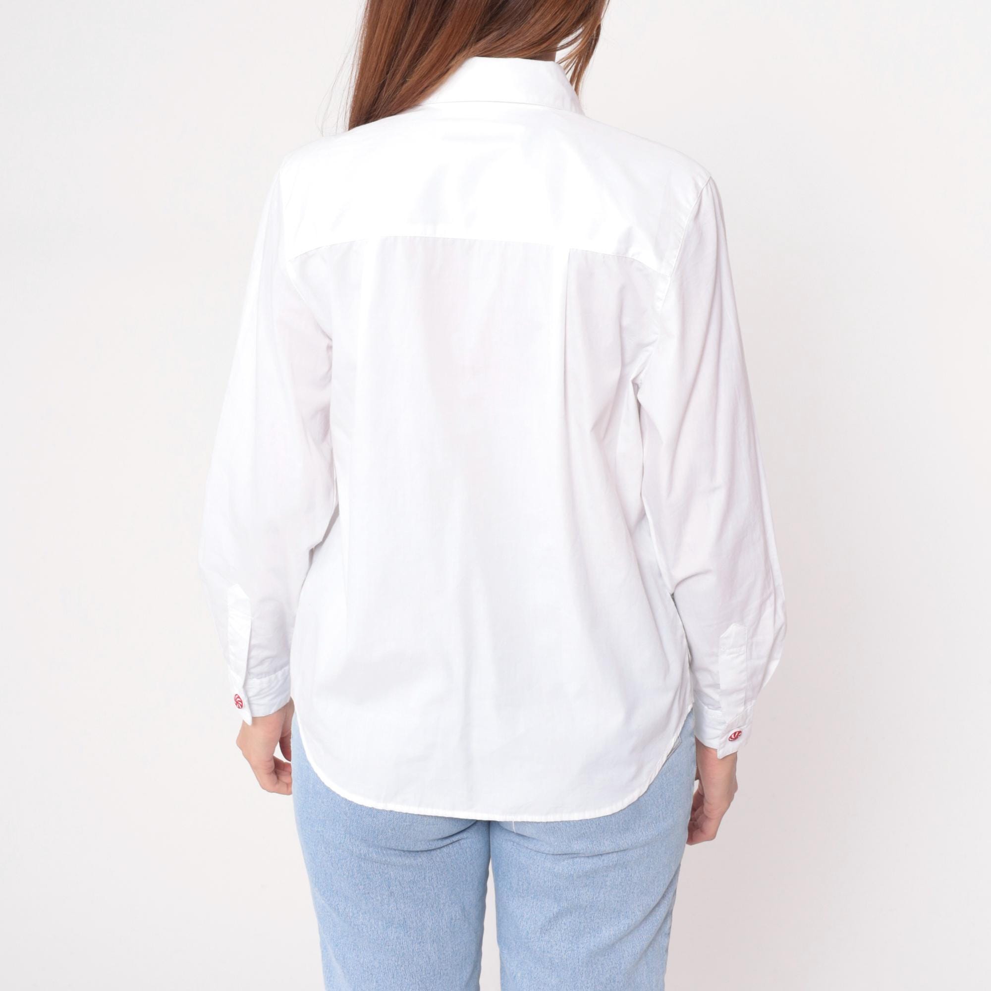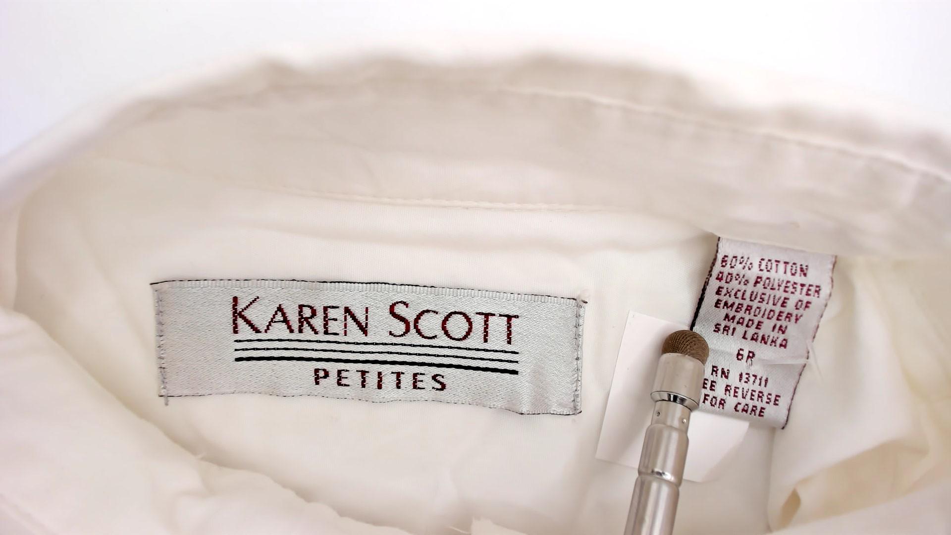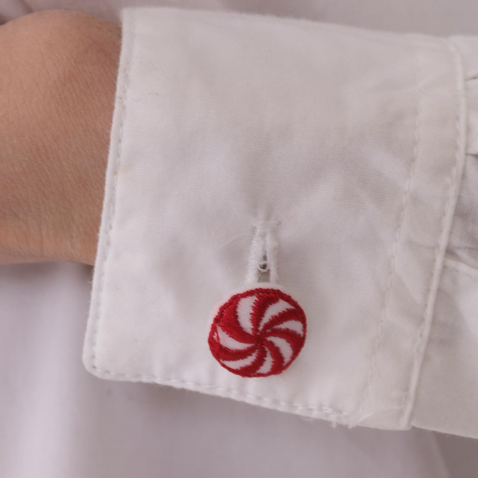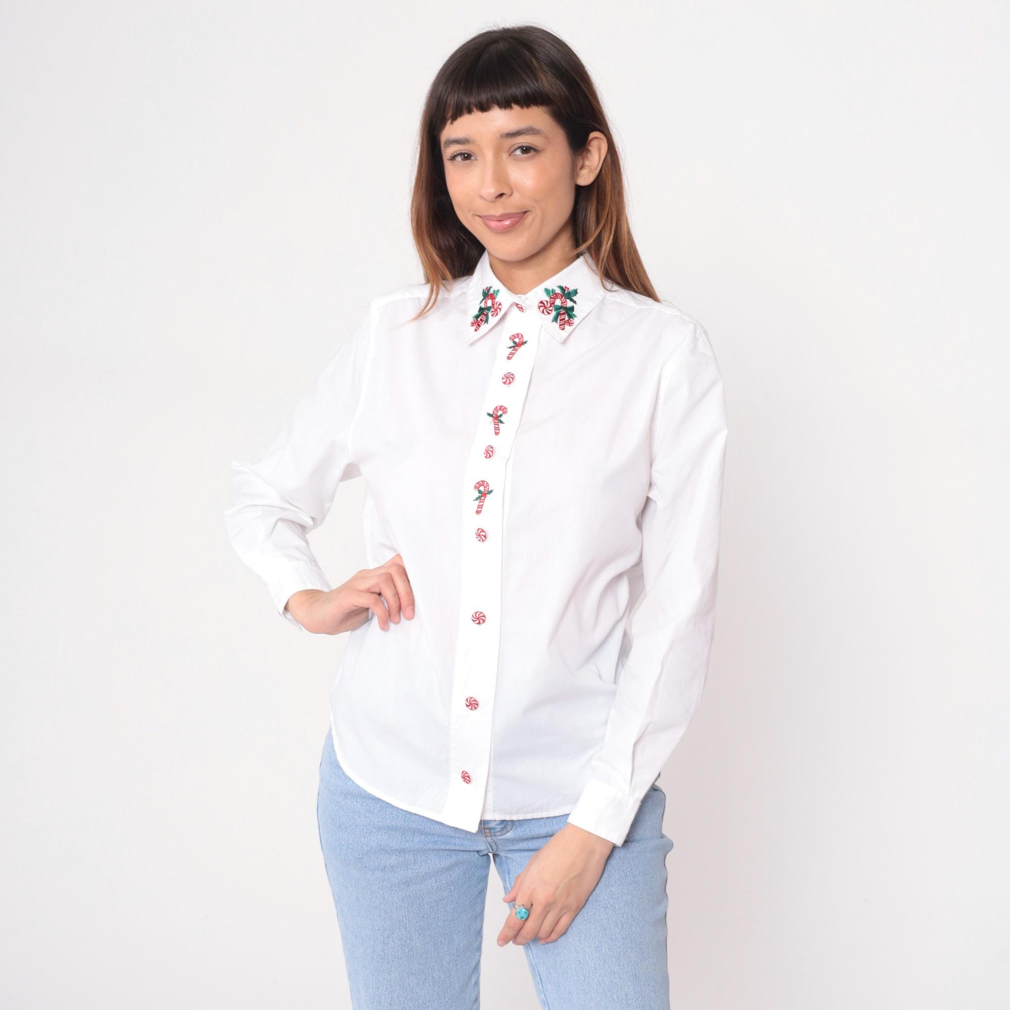 80s white button-up shirt from Karen Scott with candy cane and peppermint embroidery on collar and down the button placket. Long sleeves with button cuffs, pointed collar, full button front closure.