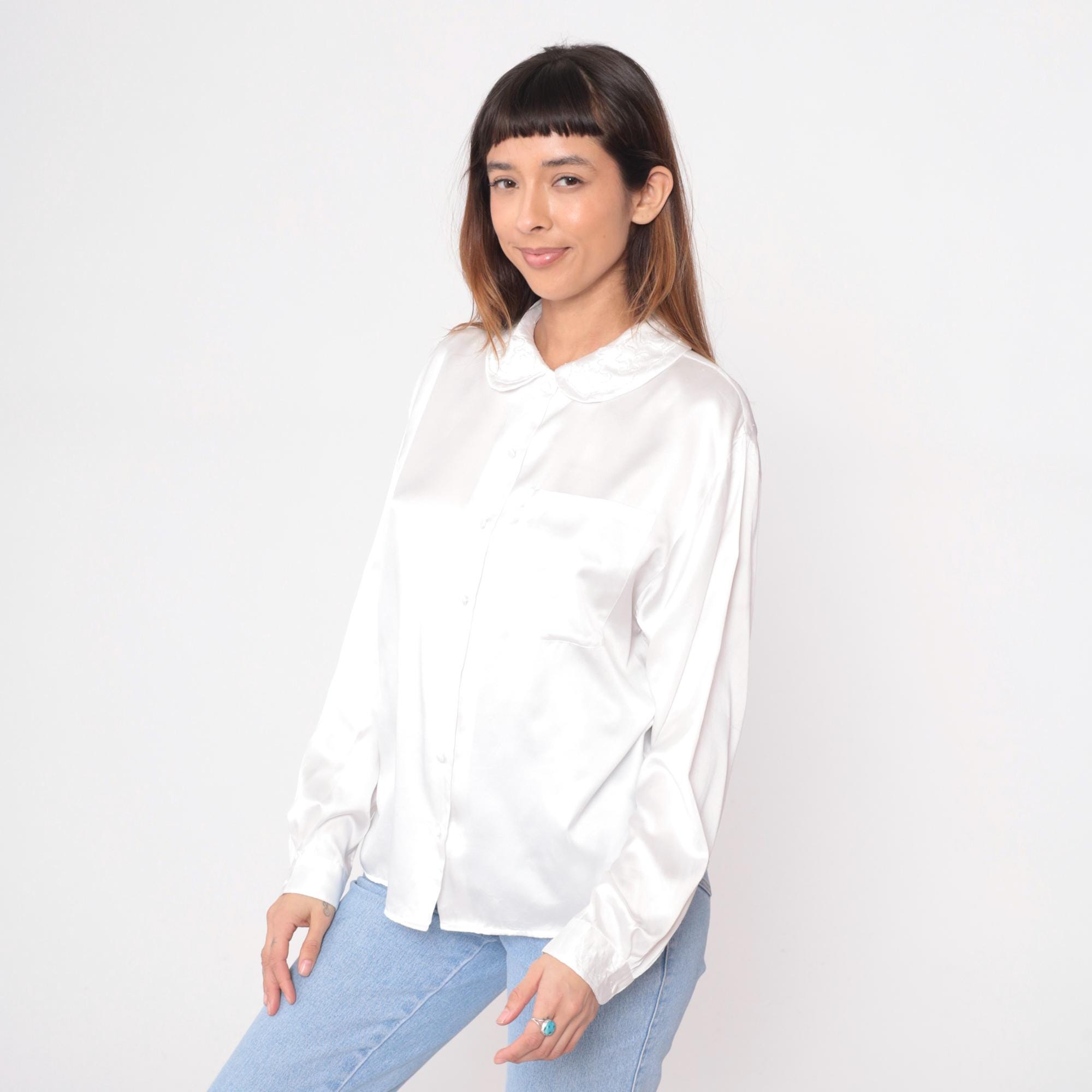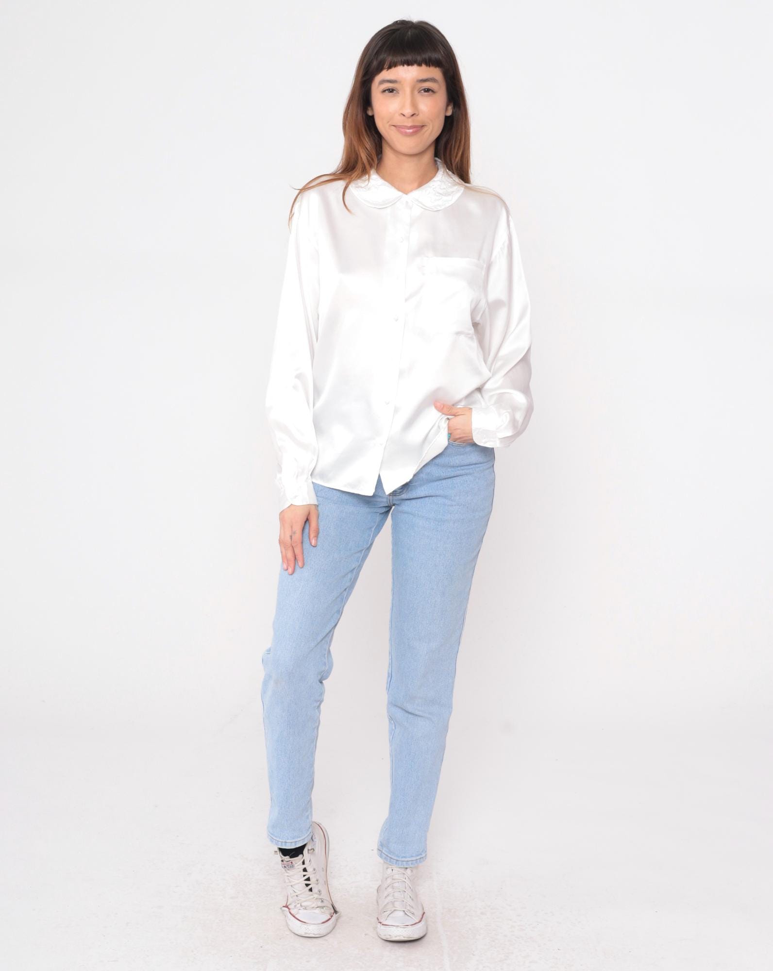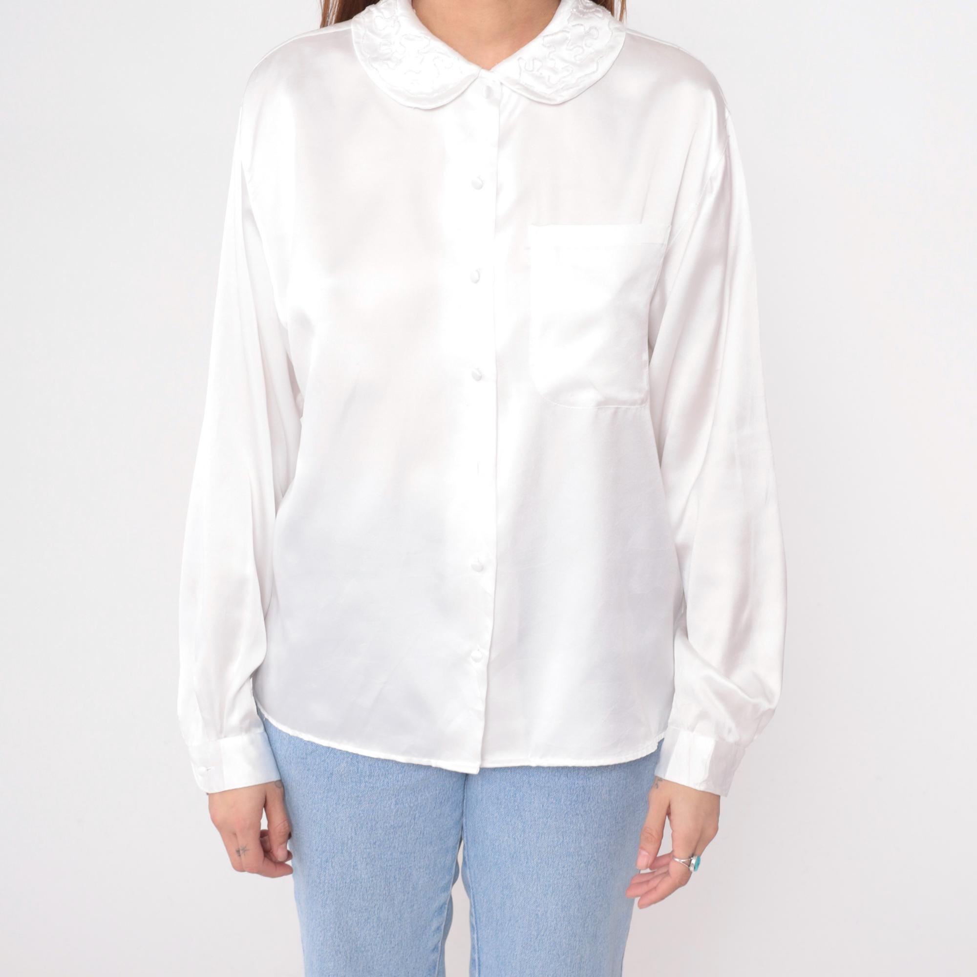 90s white button-up shirt from Charlotte van Horne with Peter Pan collar embroidered in a floral pattern. Long sleeves, front button closure, single chest pocket.