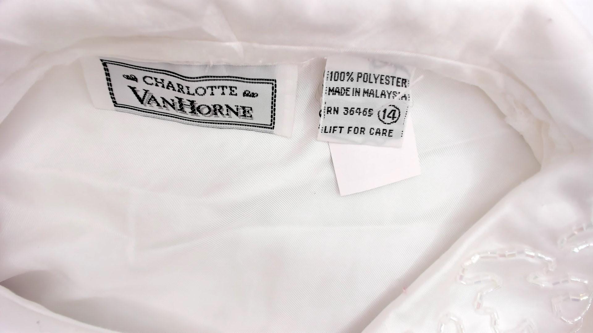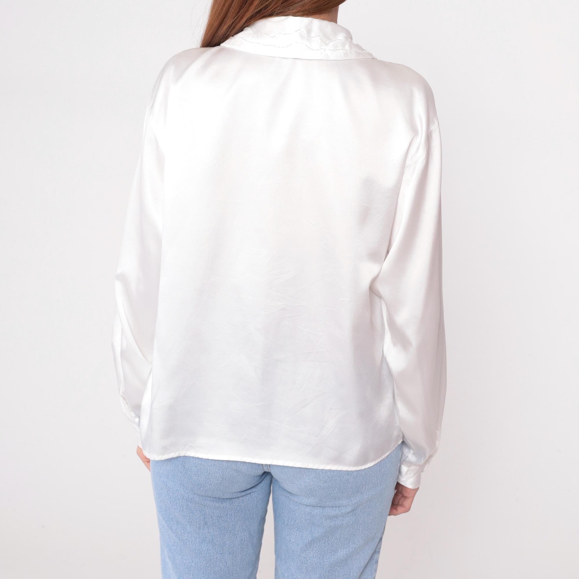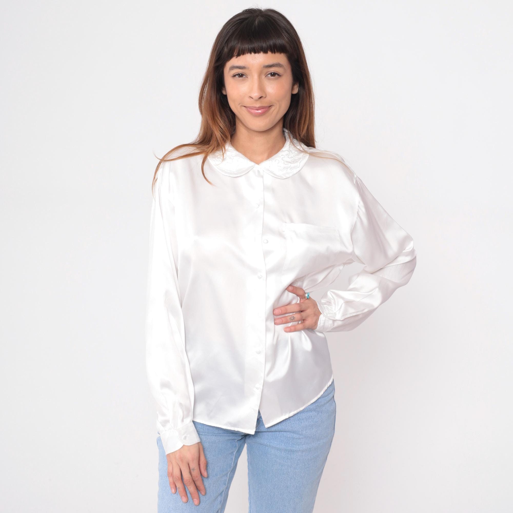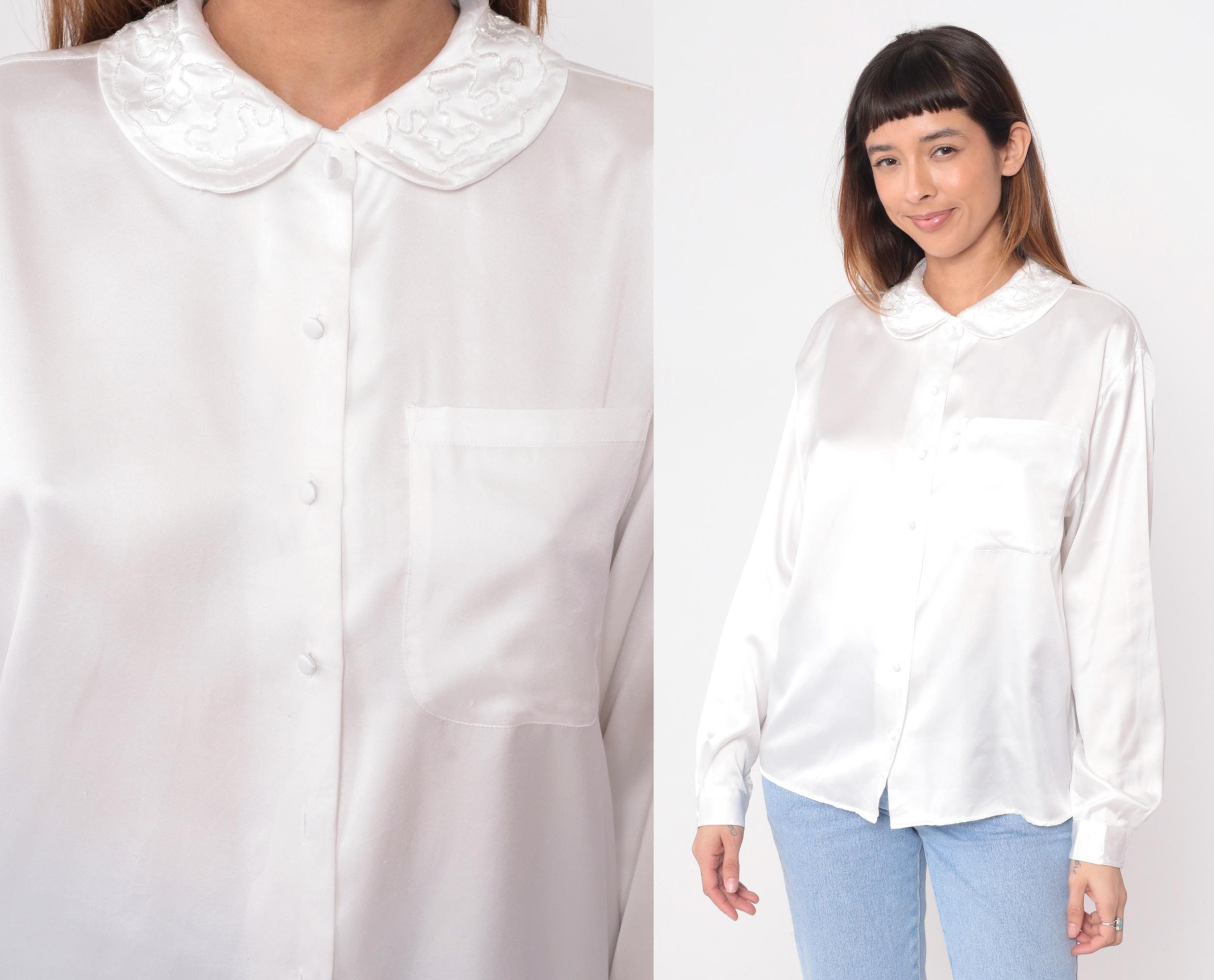 90s white button-up shirt from Charlotte van Horne with Peter Pan collar embroidered in a floral pattern. Long sleeves, front button closure, single chest pocket.