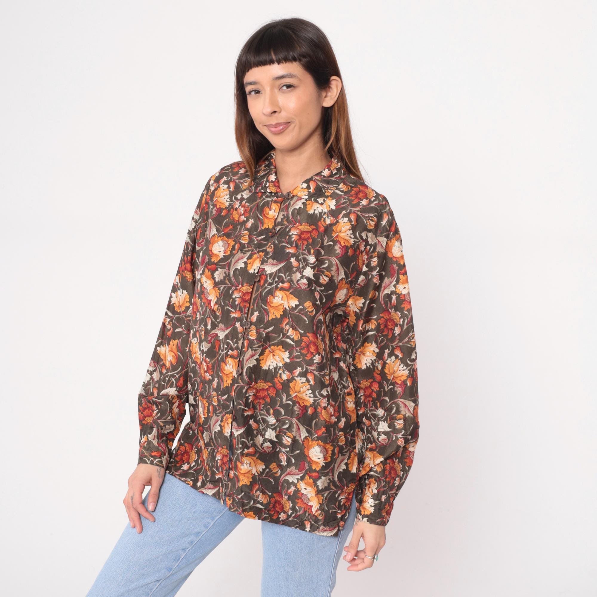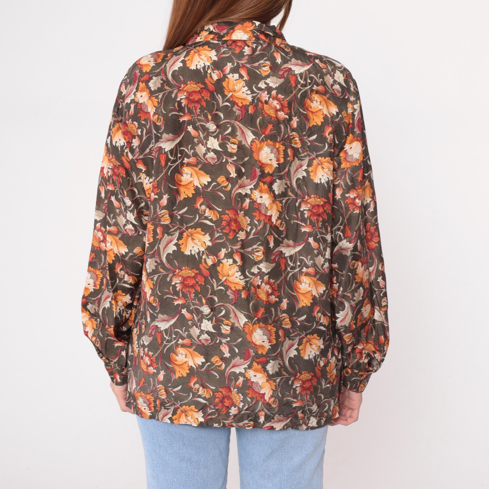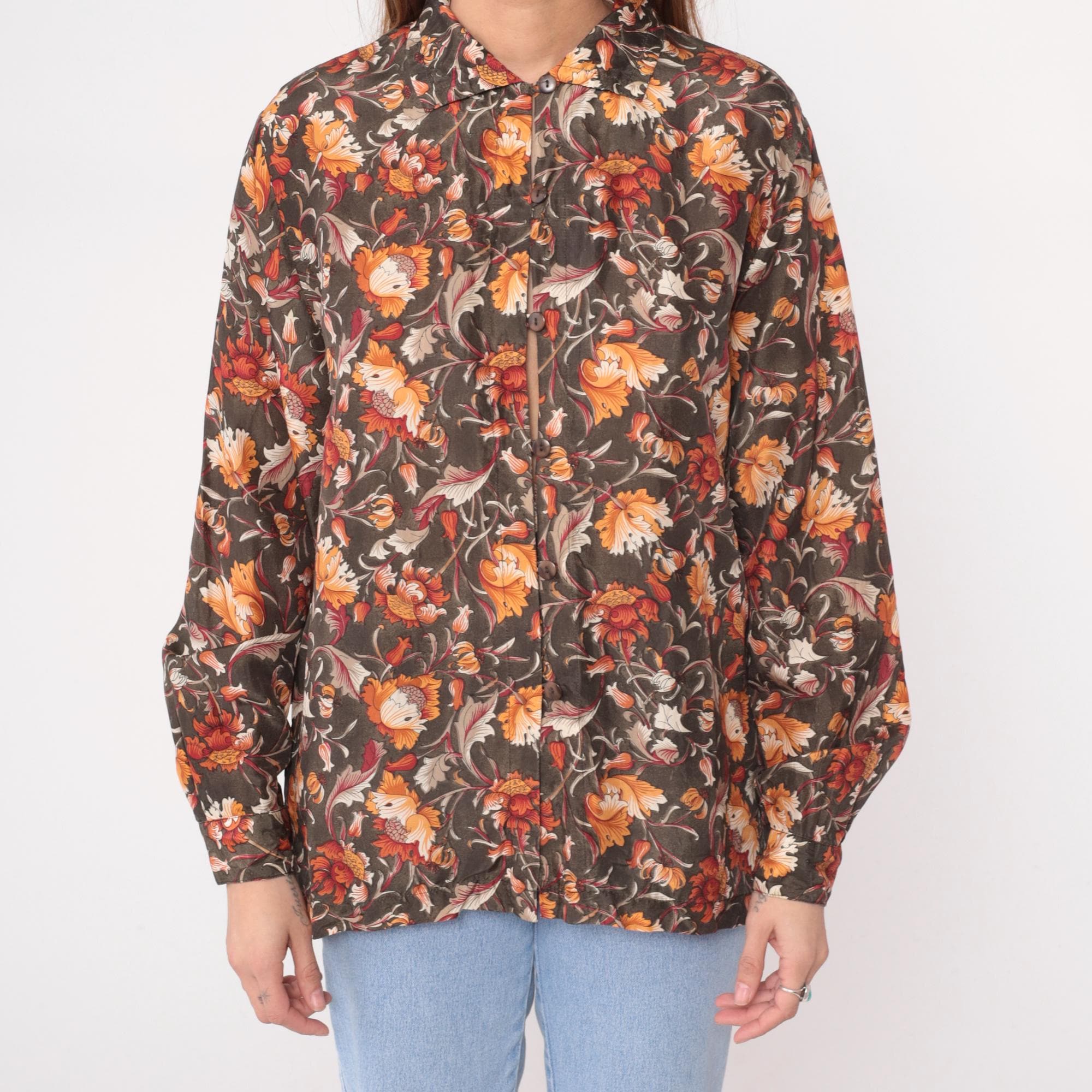 90s brown floral silk shirt with orange, rust, burgundy, and cream flowers across dark olive-brown base fabric. Button front closure, pointed collar, long sleeves with button cuffs.