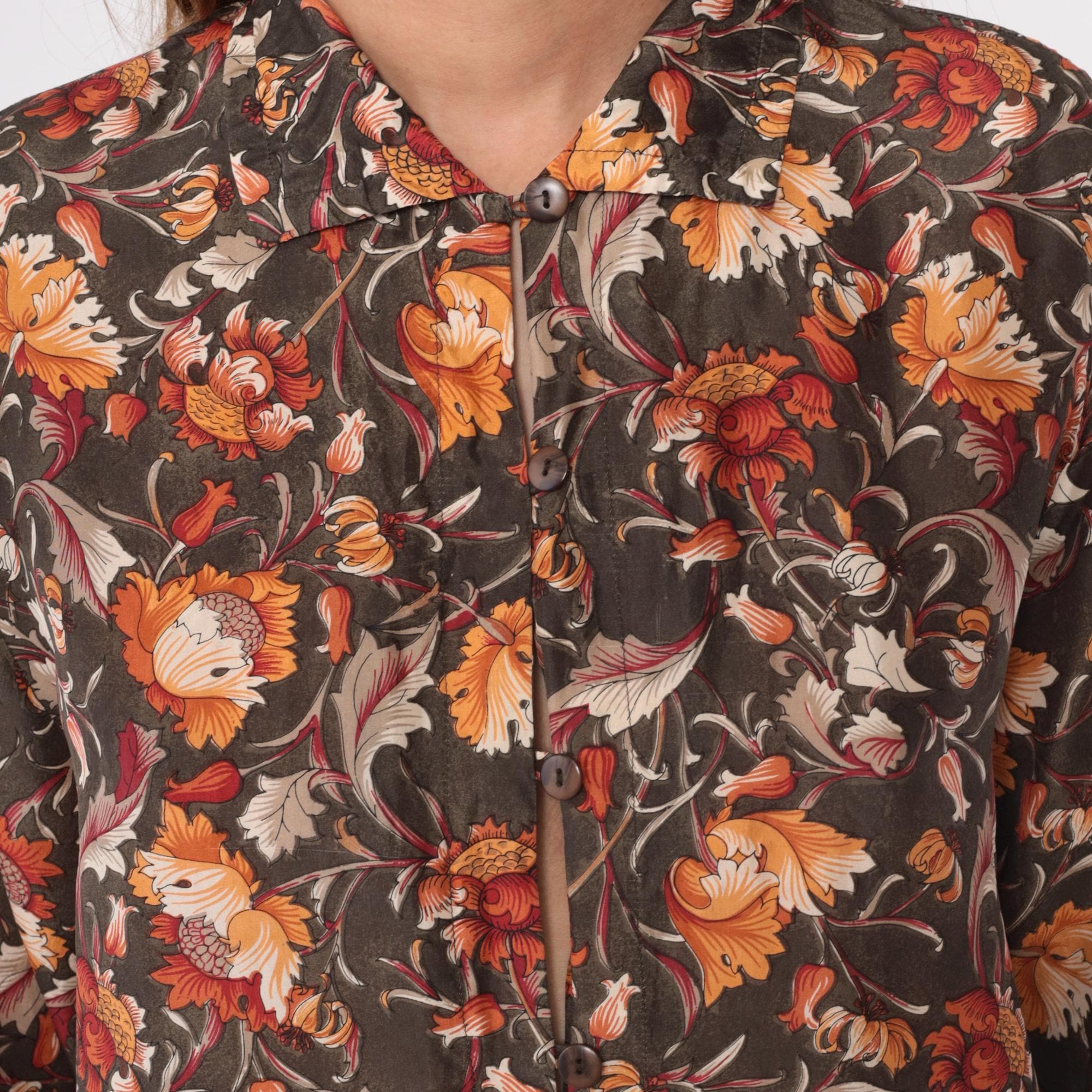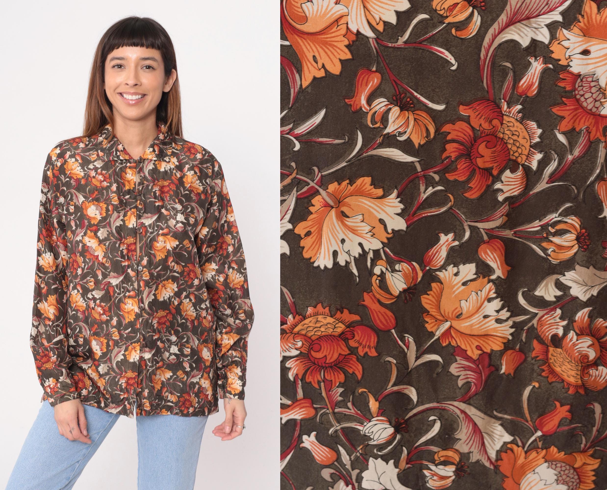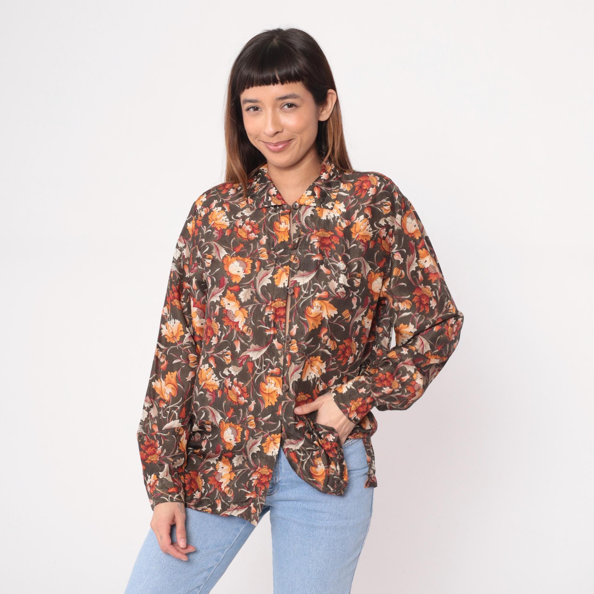 90s brown floral silk shirt with orange, rust, burgundy, and cream flowers across dark olive-brown base fabric. Button front closure, pointed collar, long sleeves with button cuffs.