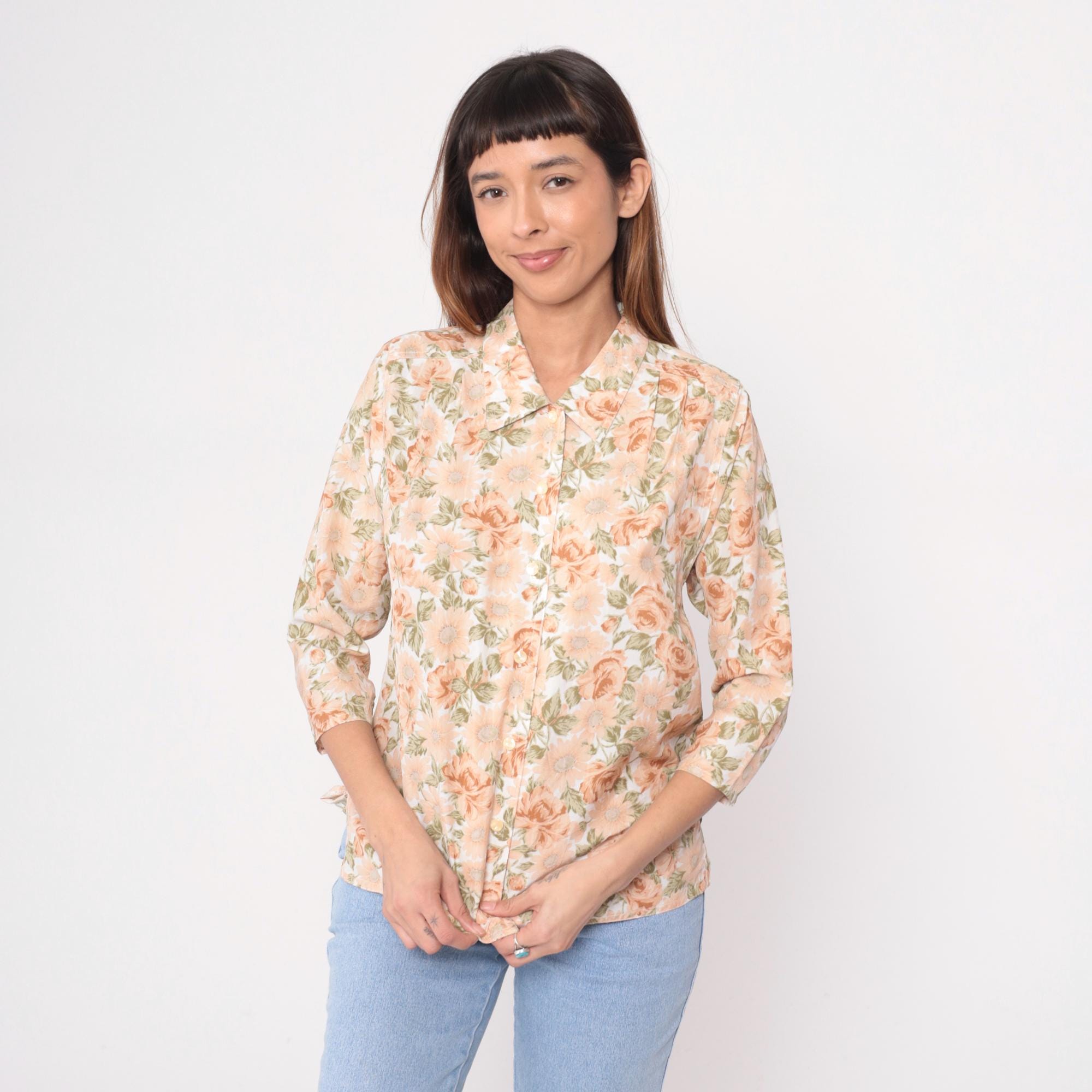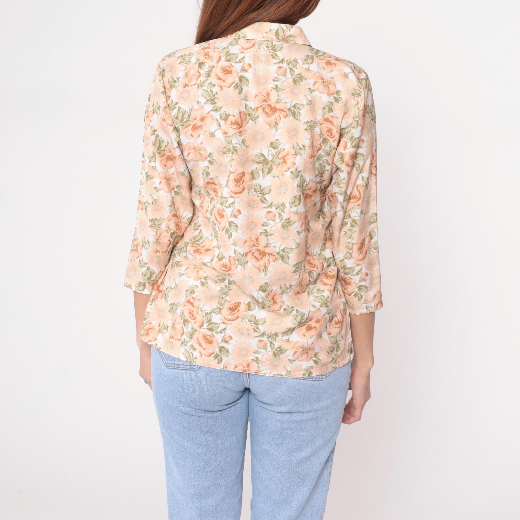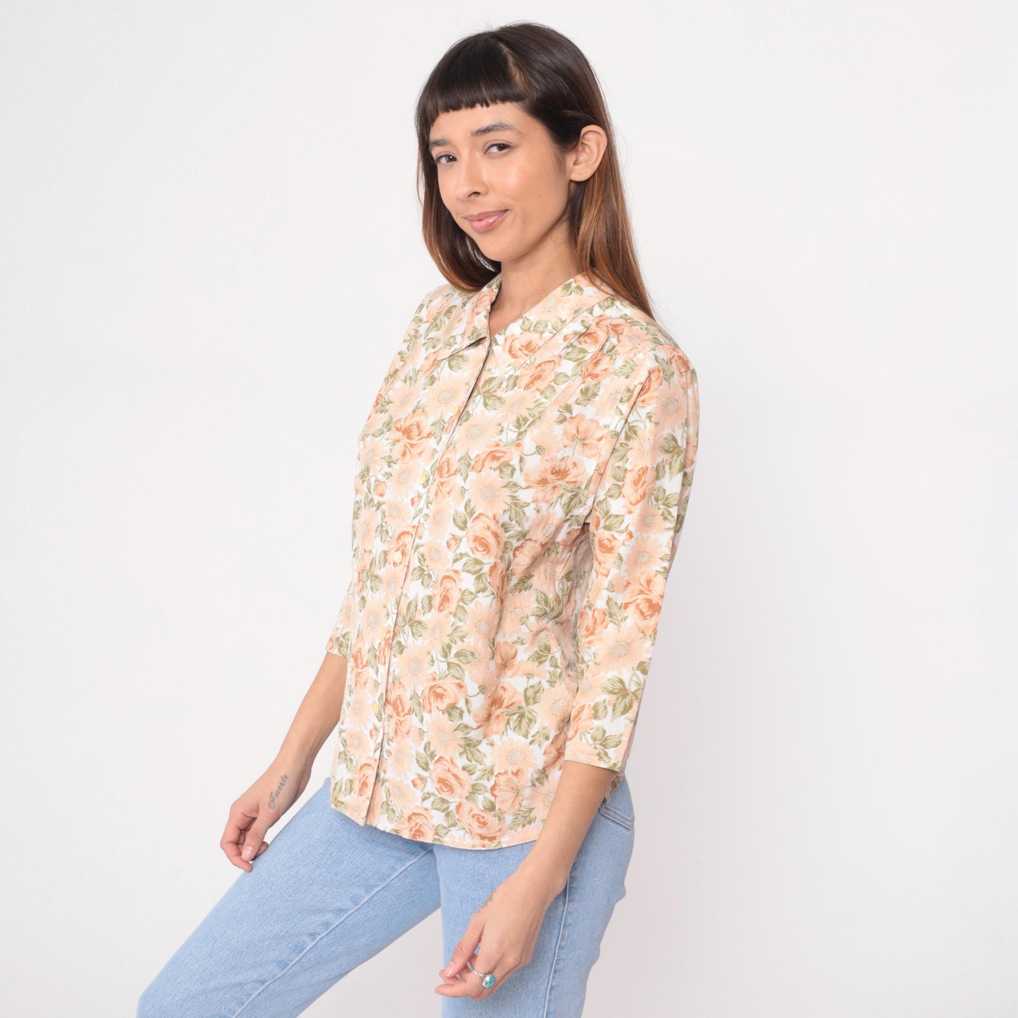 80s floral blouse with peach and coral roses and green leaves on cream background. Notched collar, button front closure, and 3/4 sleeves.