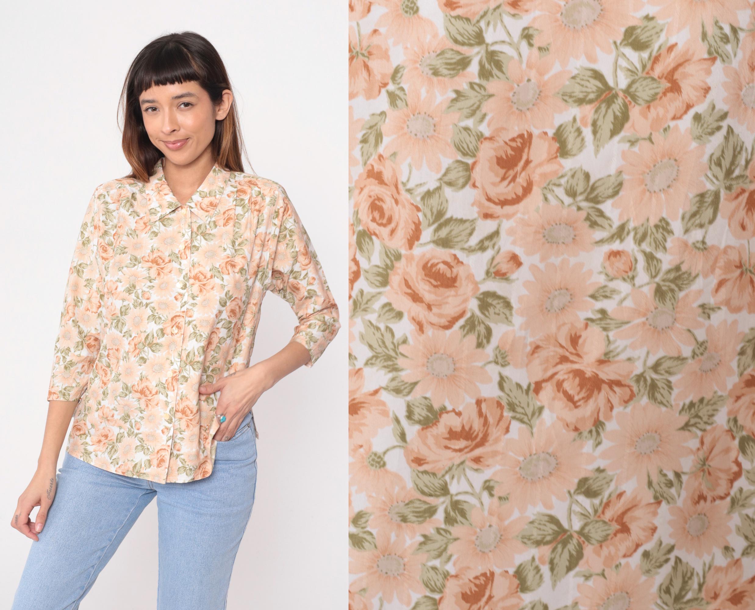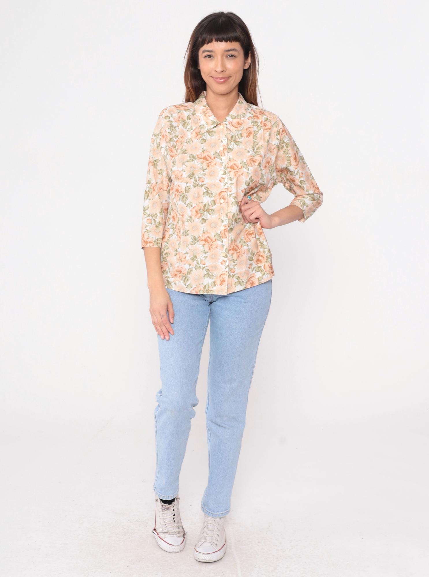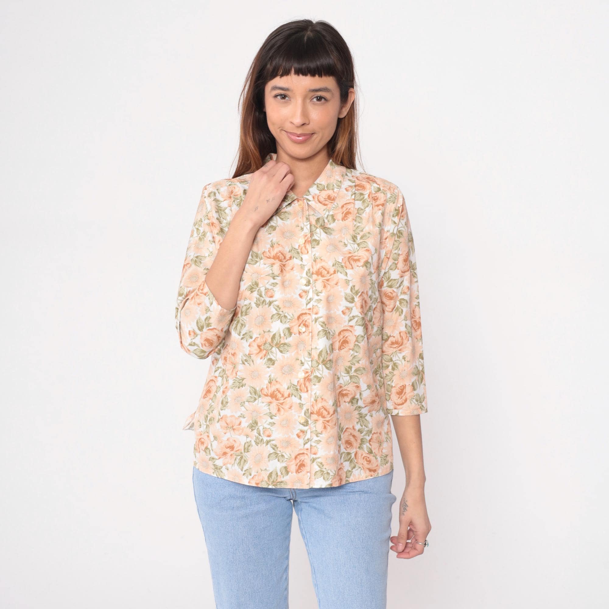 80s floral blouse with peach and coral roses and green leaves on cream background. Notched collar, button front closure, and 3/4 sleeves.