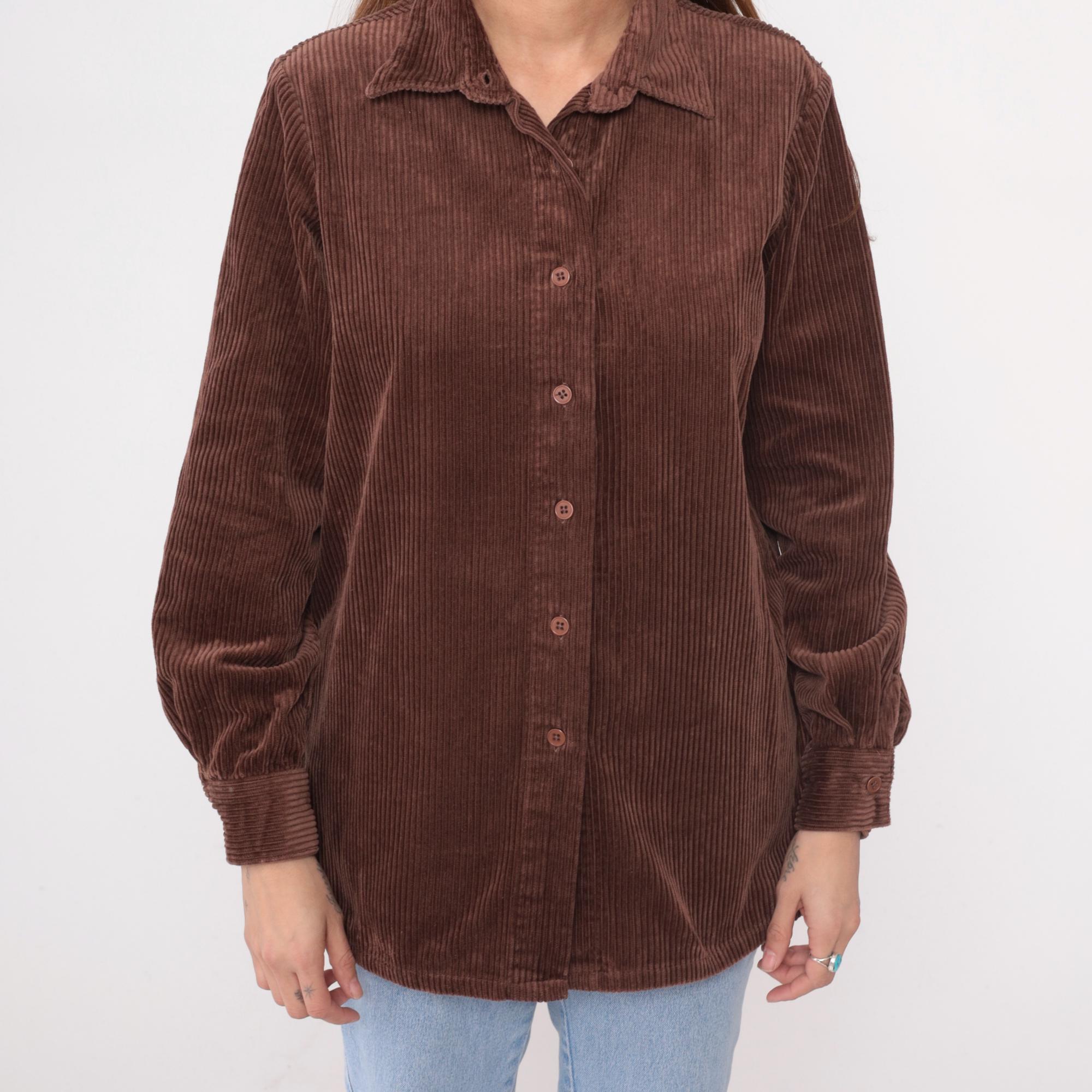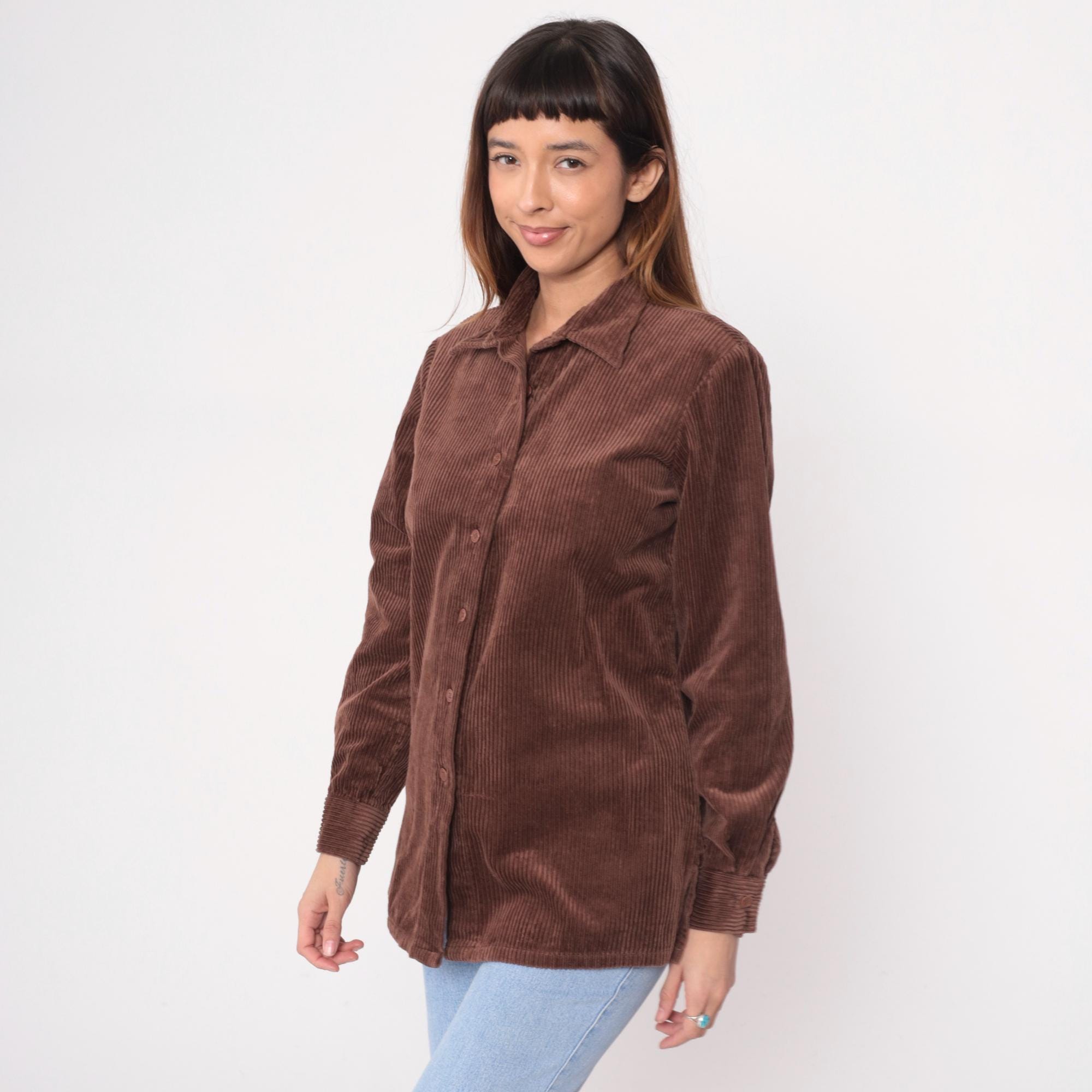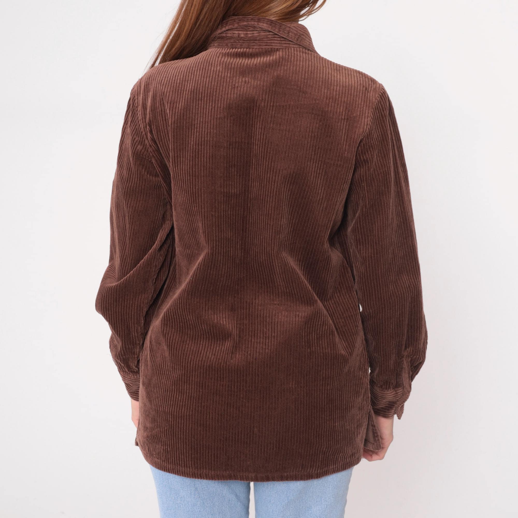 Y2K brown corduroy button-up shirt from blair with pointed collar and long sleeves with button cuffs. Matching brown buttons down the front, single chest pocket on left side.