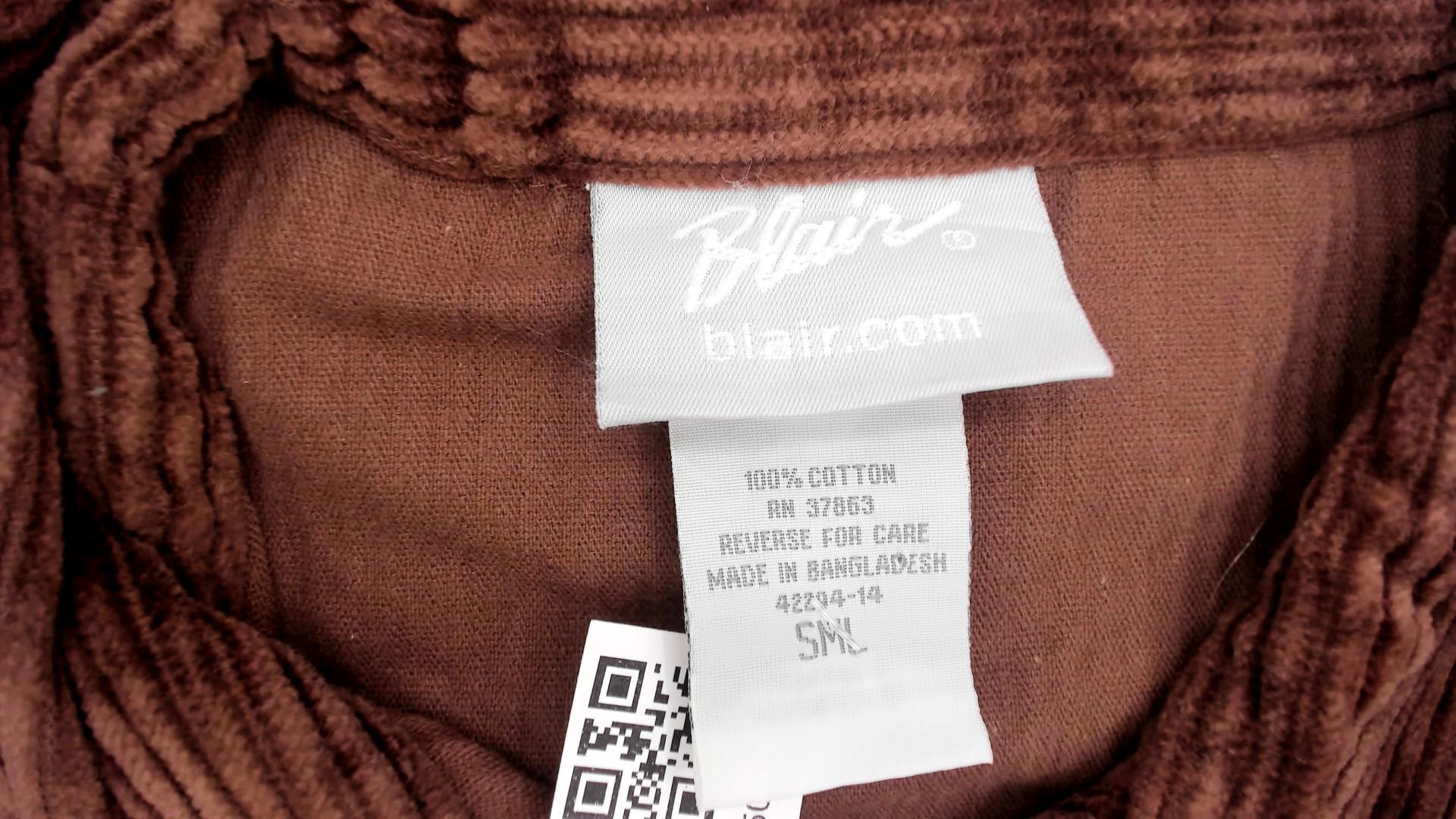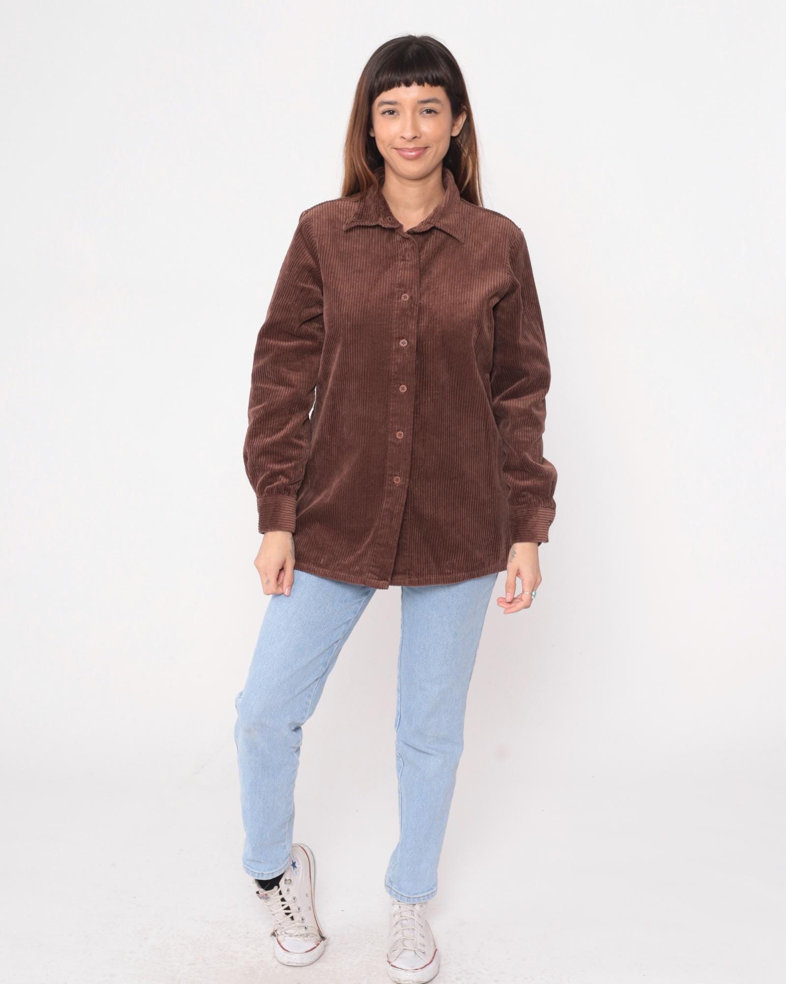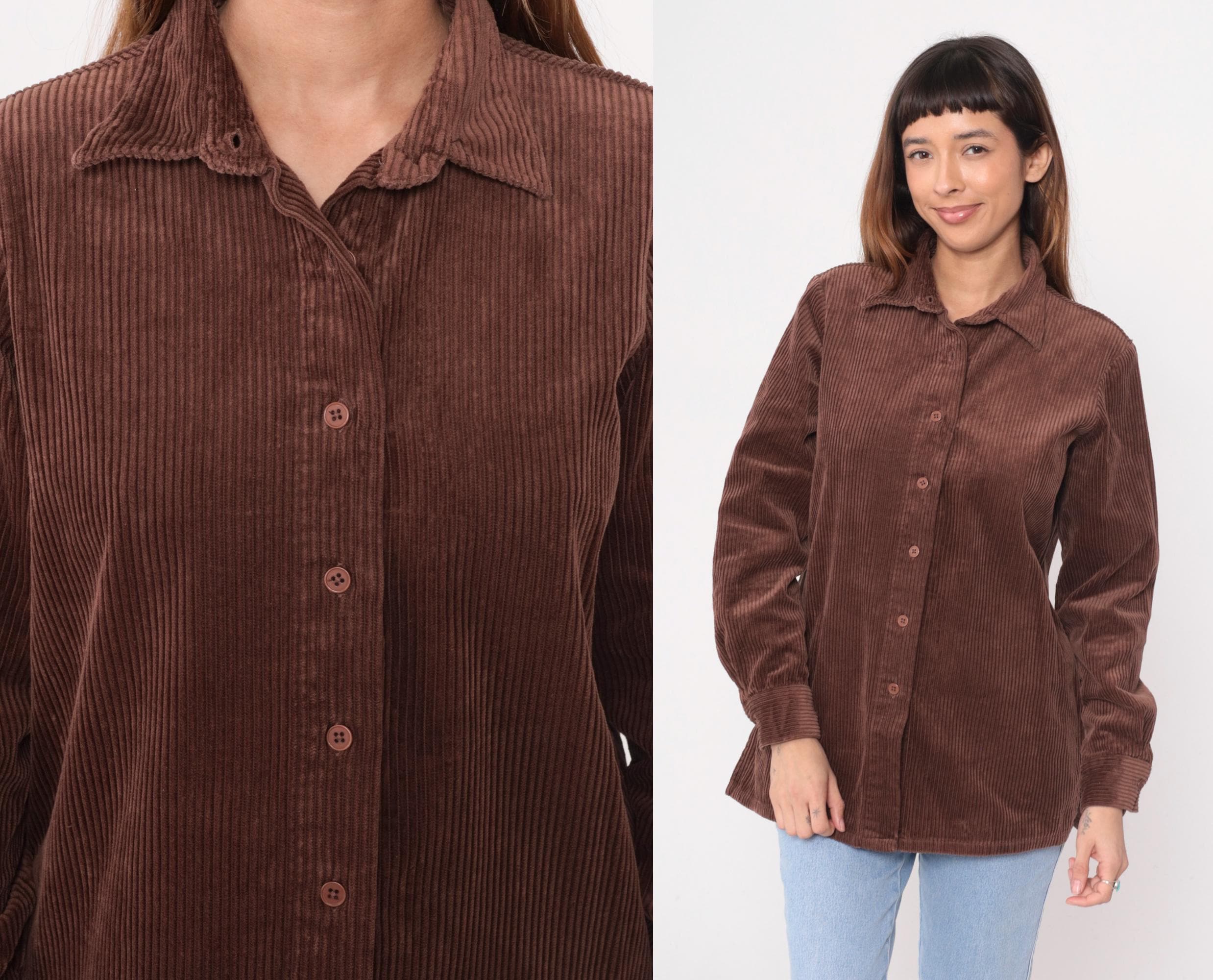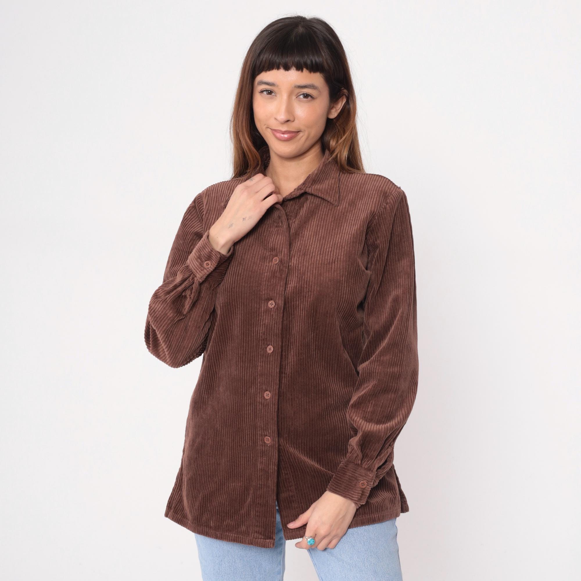 Y2K brown corduroy button-up shirt from blair with pointed collar and long sleeves with button cuffs. Matching brown buttons down the front, single chest pocket on left side.