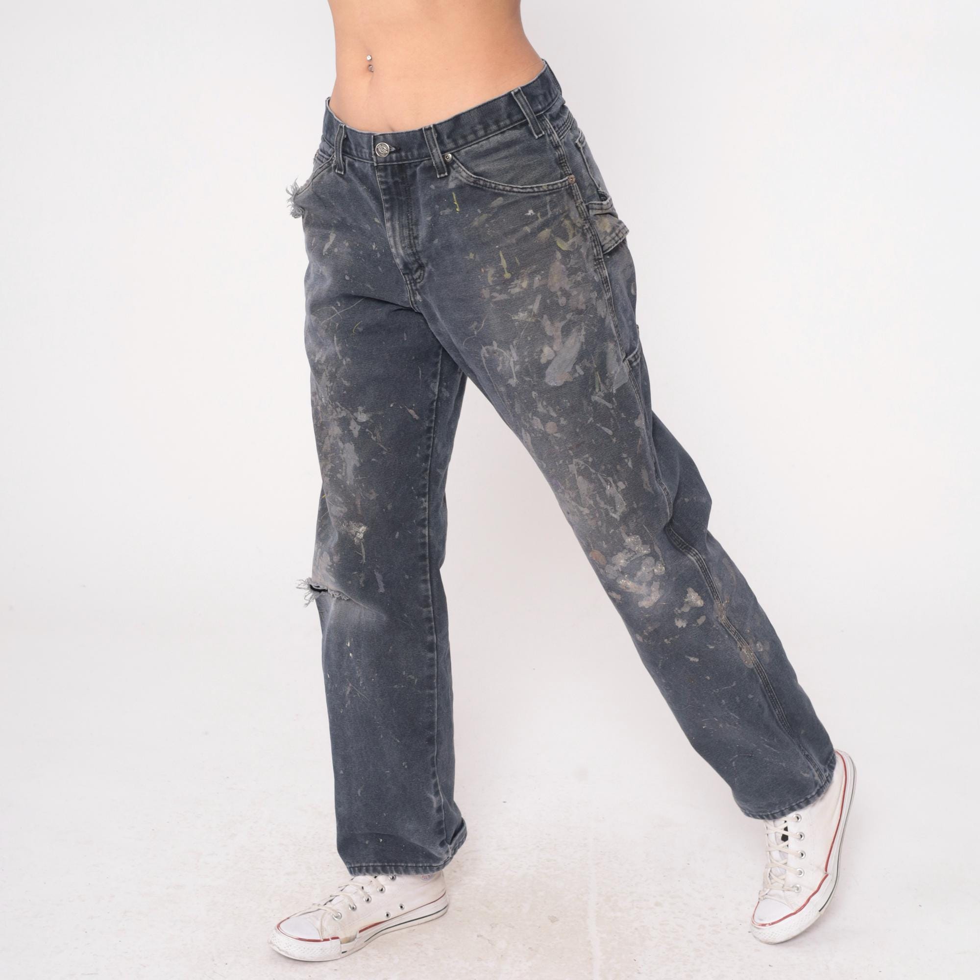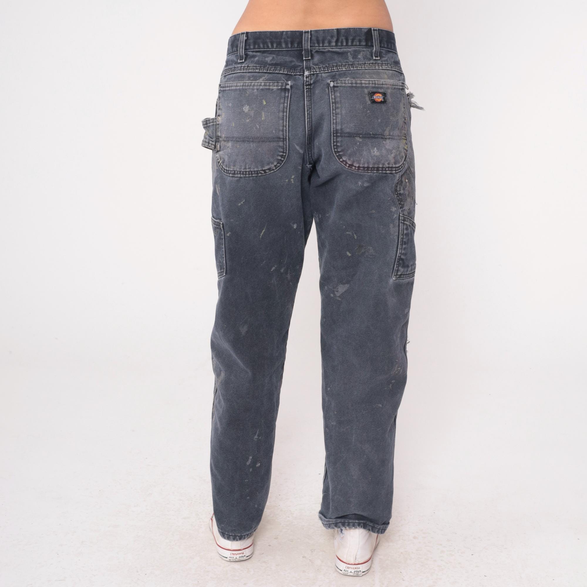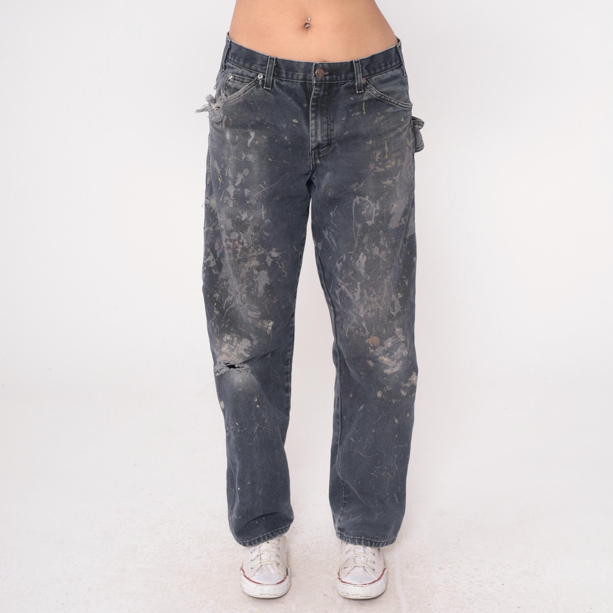 Y2K gray Dickies carpenter pants with heavy paint splatter and distressing throughout. Side carpenter pockets, back pockets with Dickies logo patch. Authentic wear from use with paint stains in white, tan, and dark tones across legs and seat.