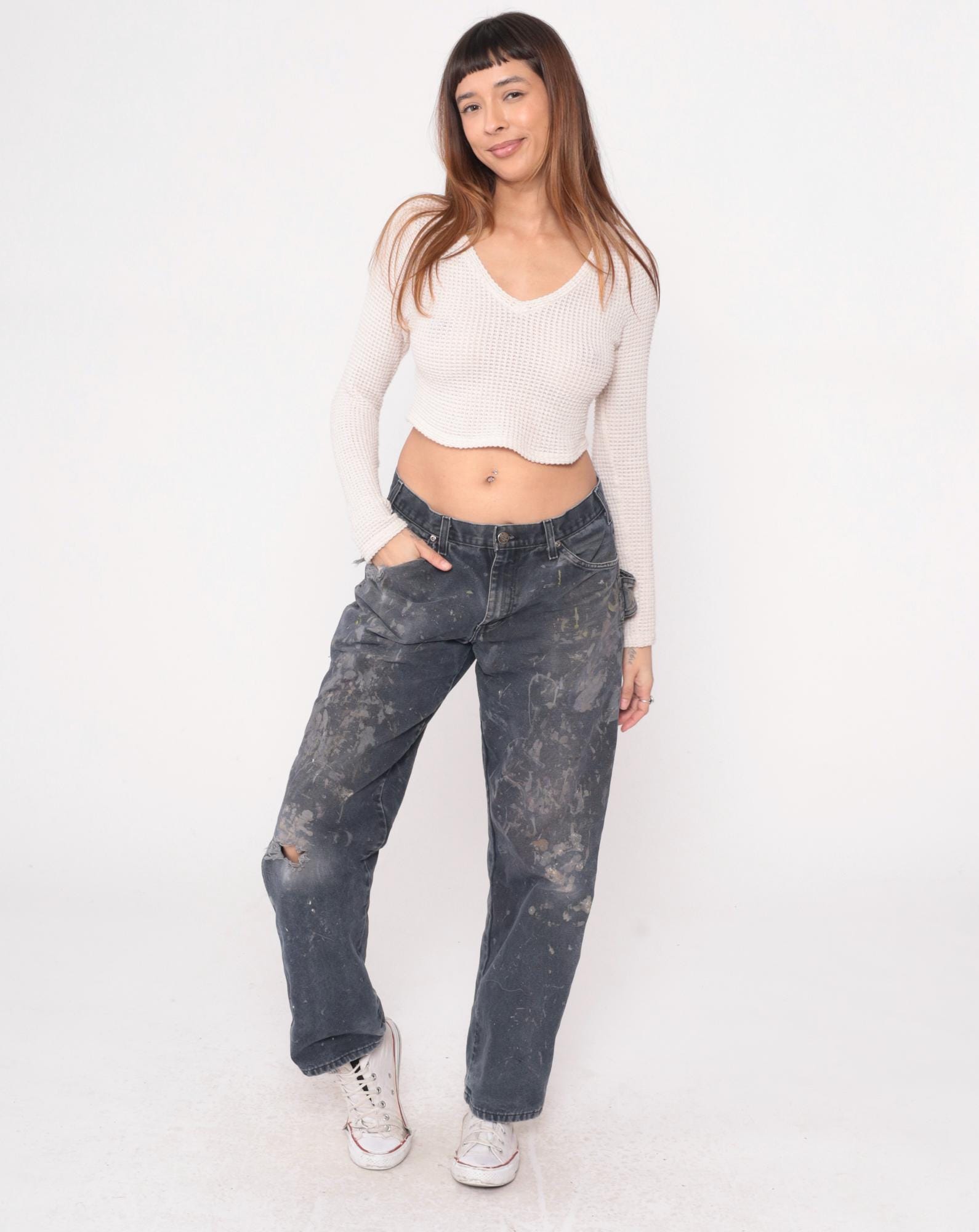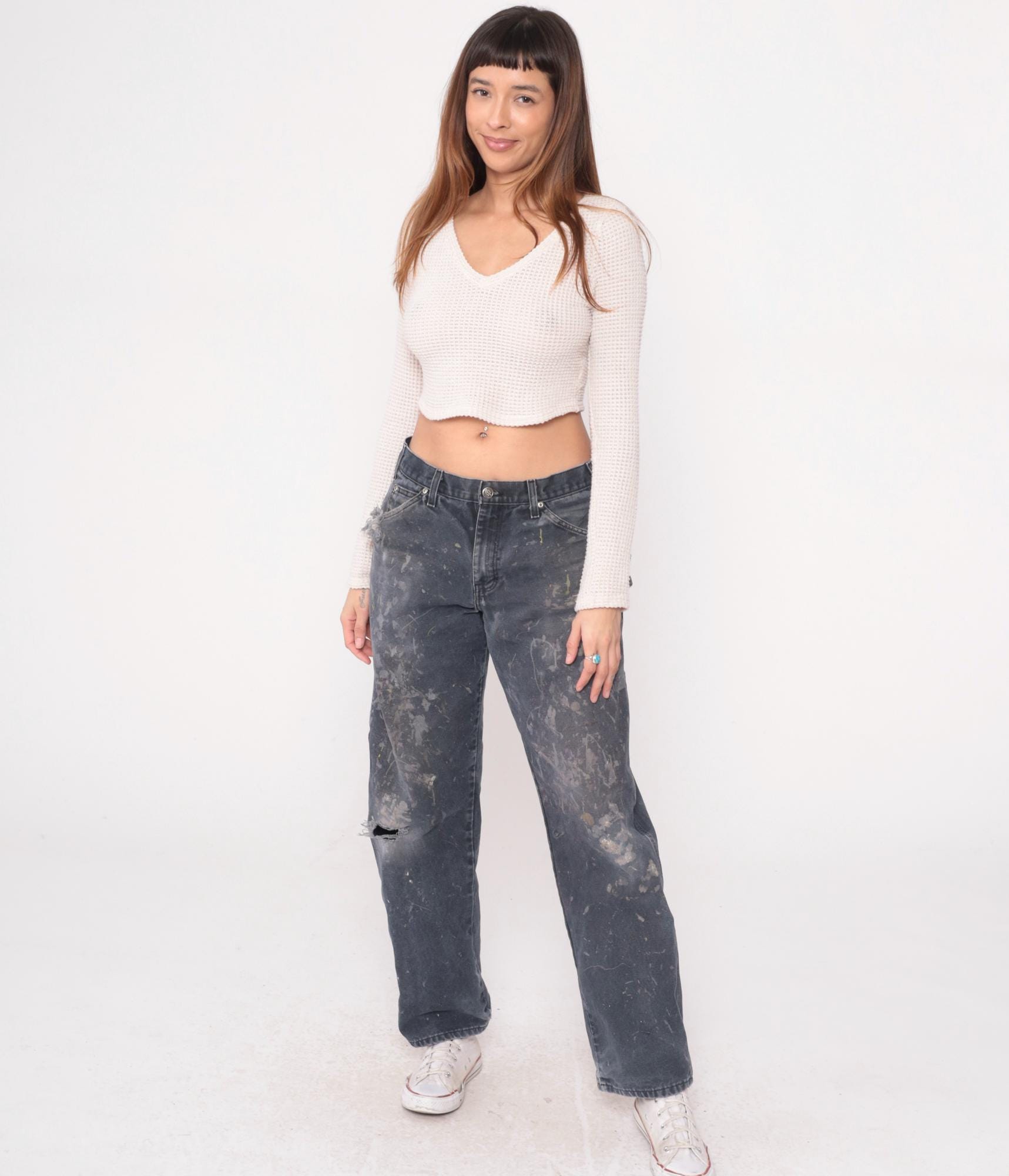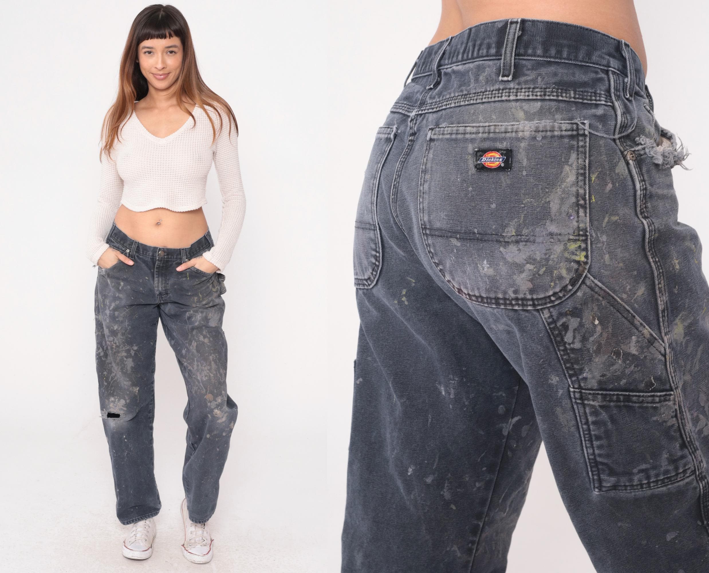 Y2K gray Dickies carpenter pants with heavy paint splatter and distressing throughout. Side carpenter pockets, back pockets with Dickies logo patch. Authentic wear from use with paint stains in white, tan, and dark tones across legs and seat.