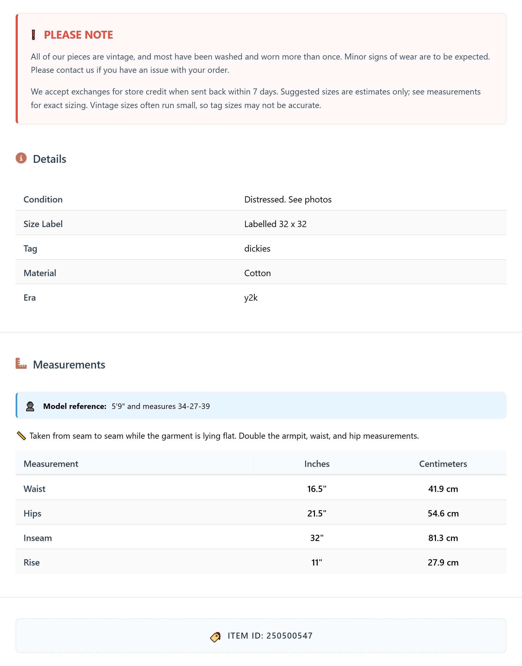Vintage denim was usually made without any stretch, unlike modern jeans. Check the measurements to ensure proper fit, and remember to give yourself a little wiggle room in the waist and hips, depending on your preferred fit.