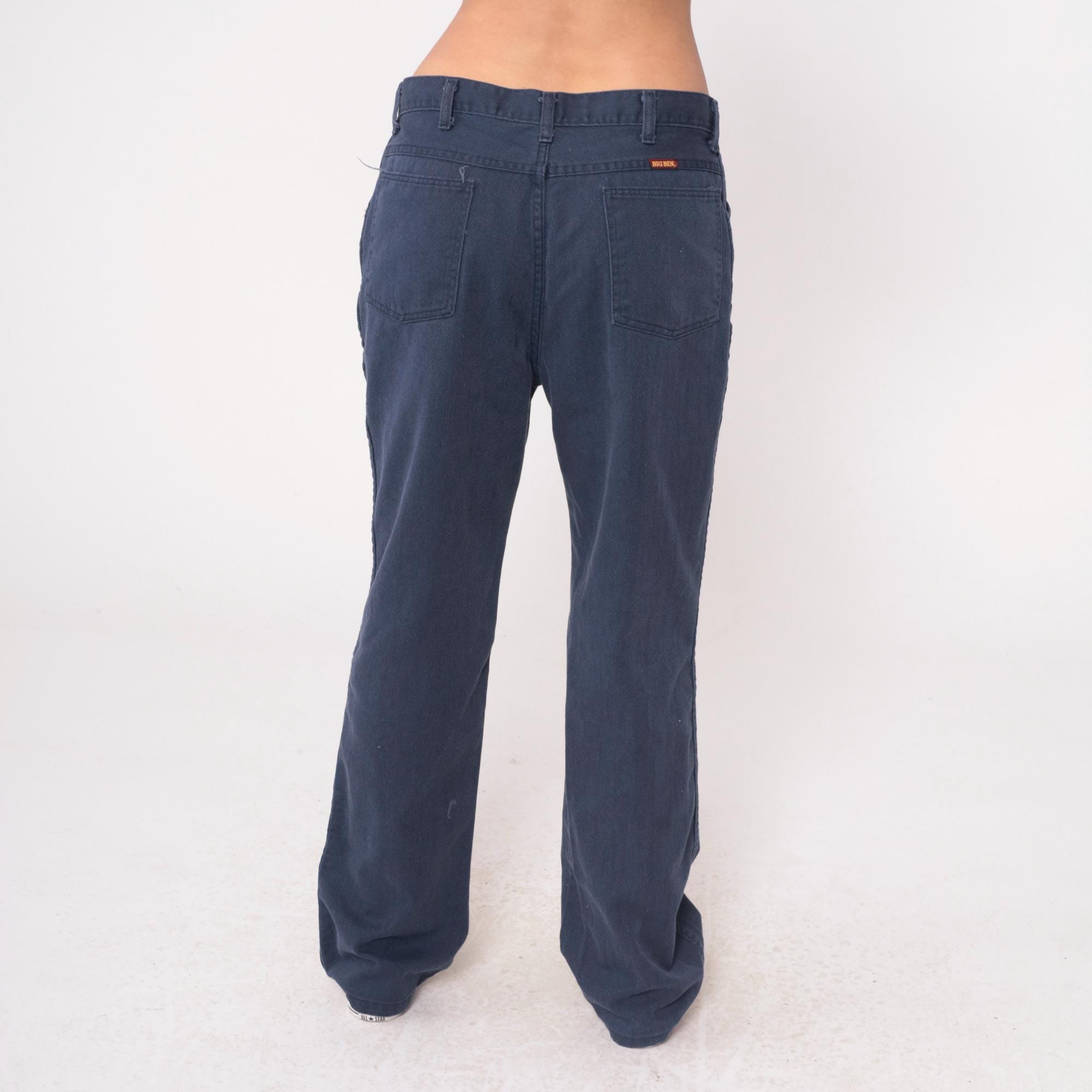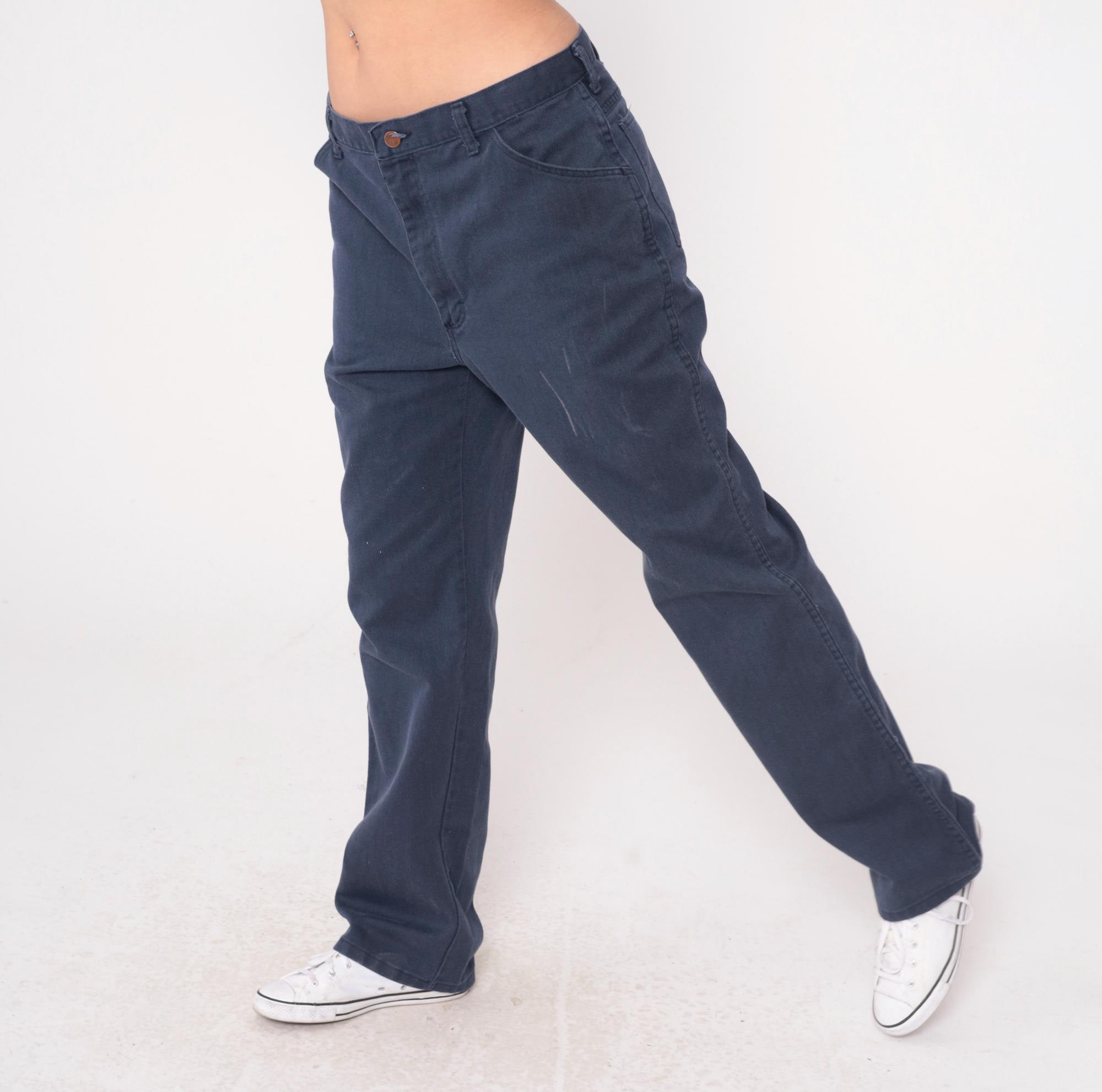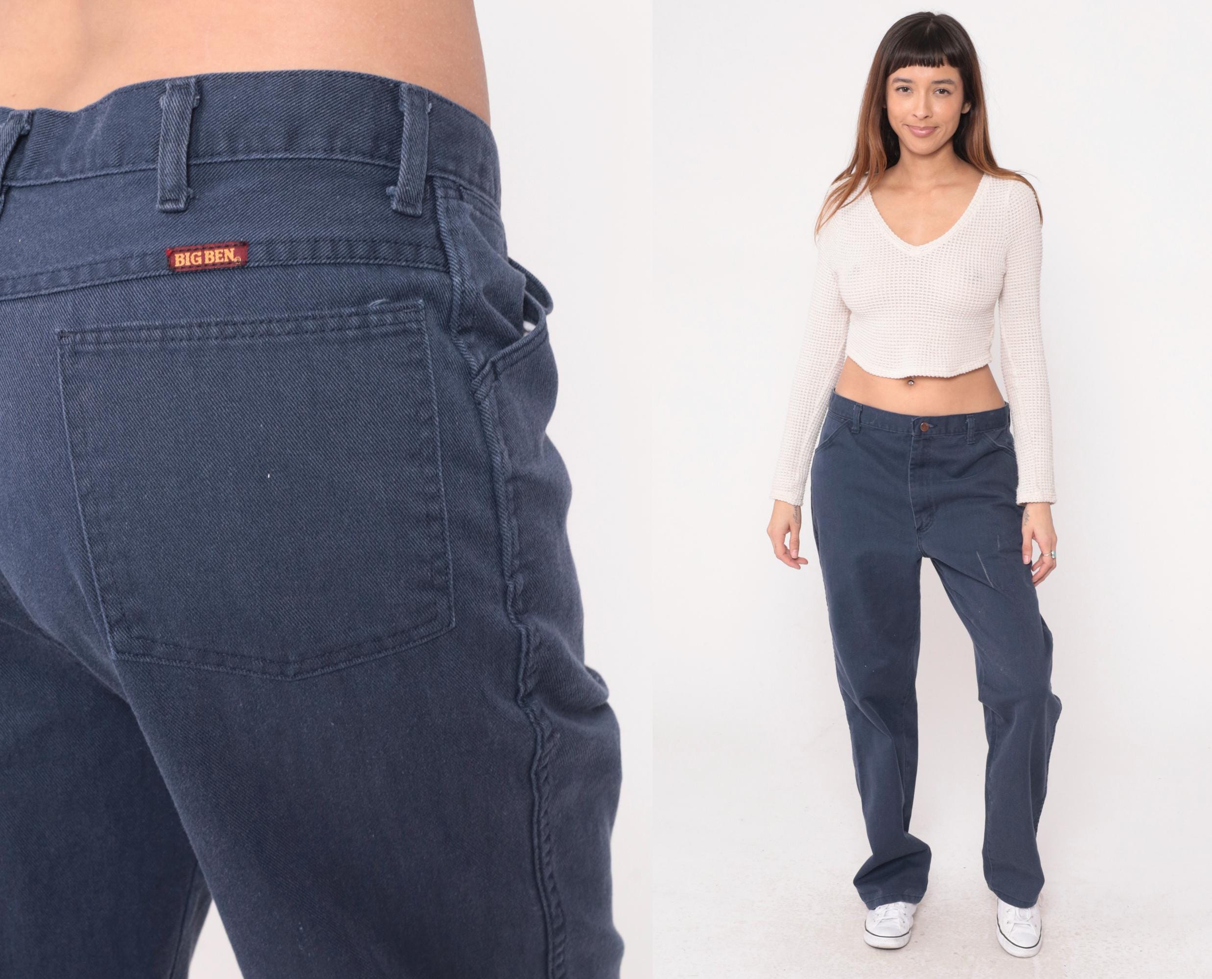 90s navy blue straight leg work pants from Big Ben. Five pocket style with belt loops, front slash pockets, and back patch pockets.