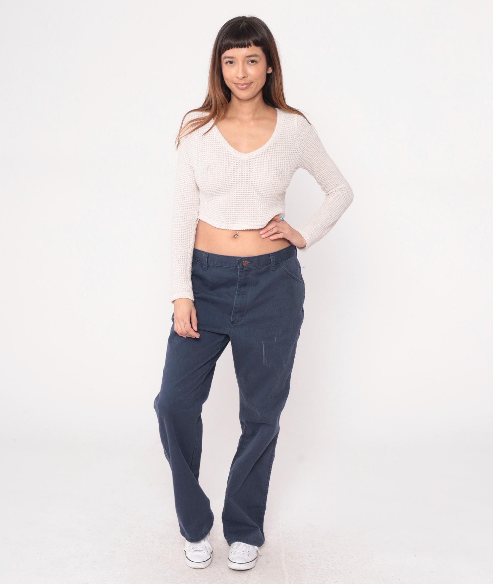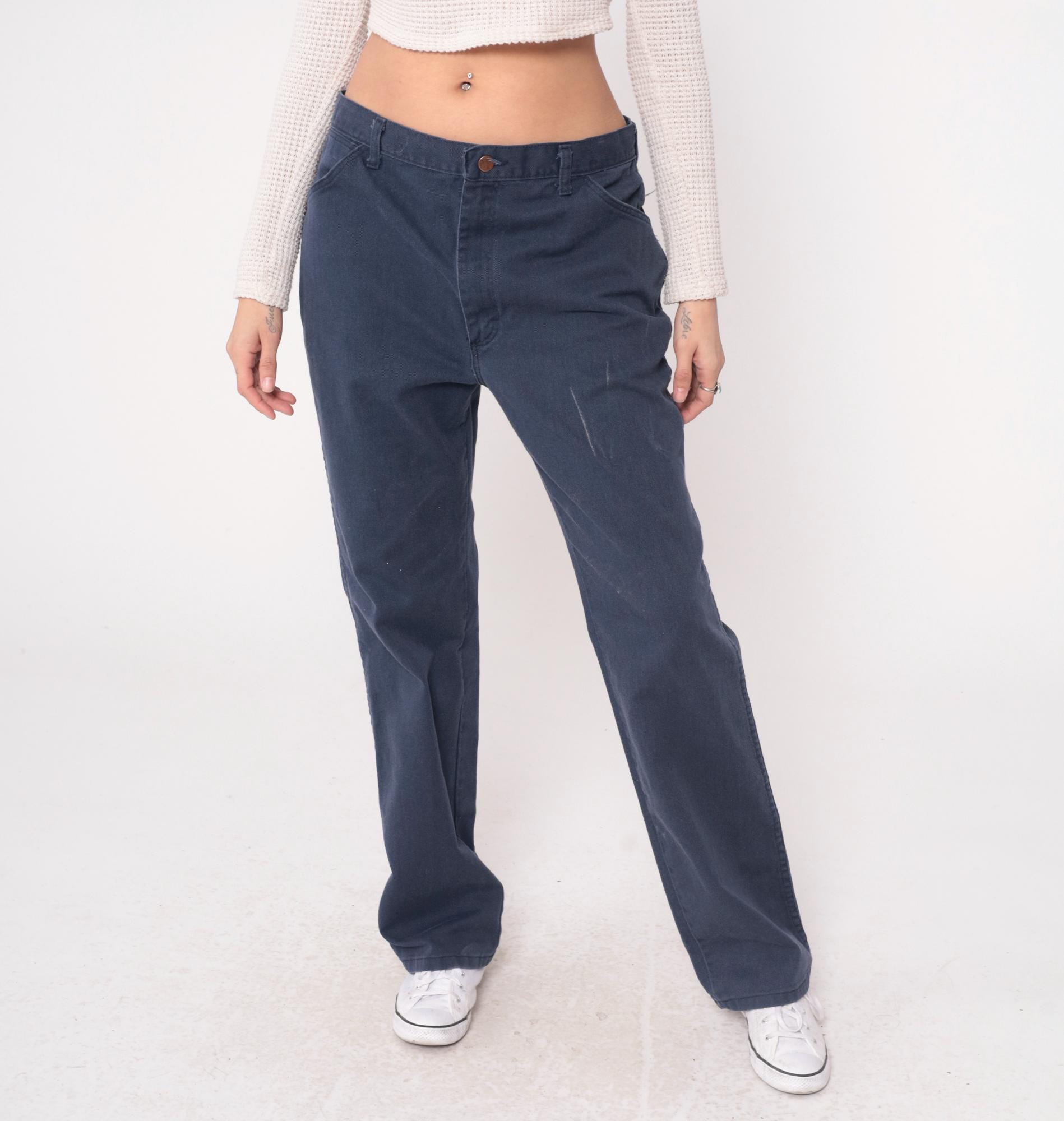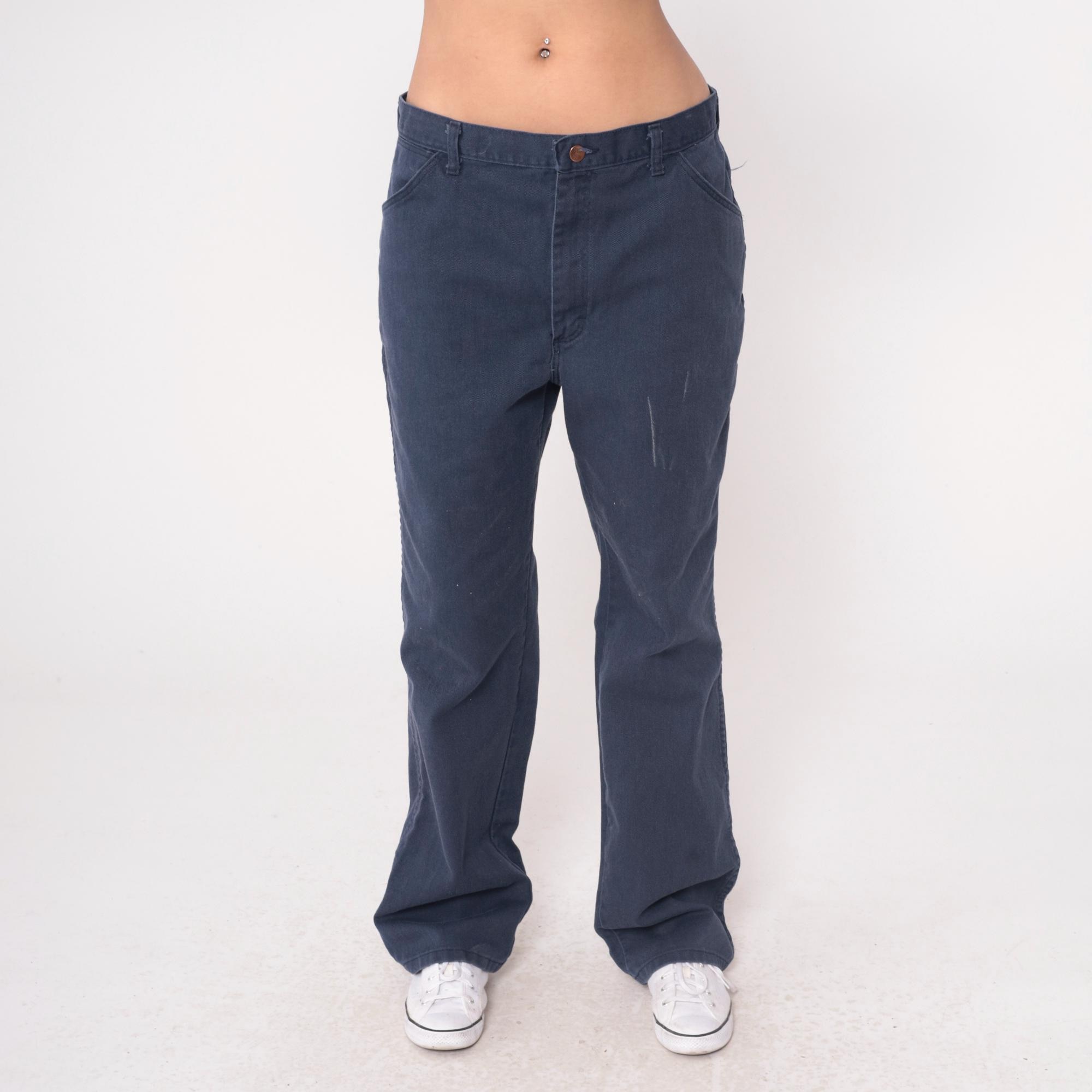90s navy blue straight leg work pants from Big Ben. Five pocket style with belt loops, front slash pockets, and back patch pockets.