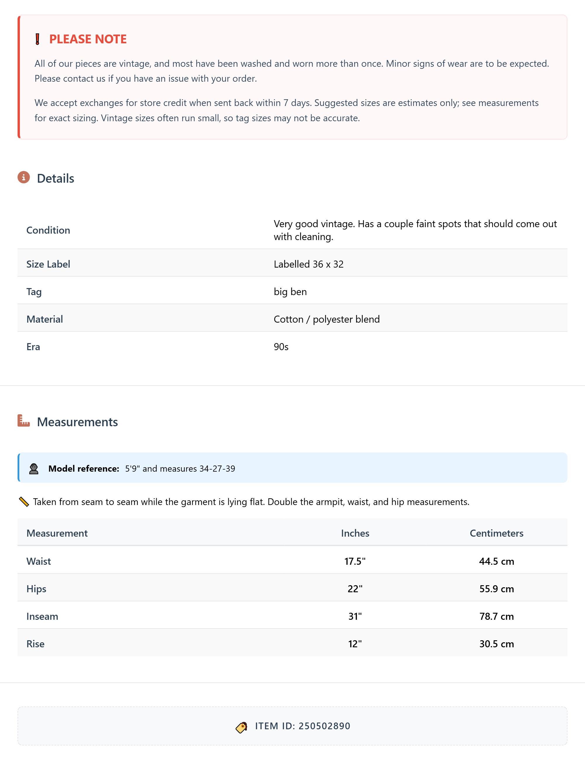 Vintage denim was usually made without any stretch, unlike modern jeans. Check the measurements to ensure proper fit, and remember to give yourself a little wiggle room in the waist and hips, depending on your preferred fit.