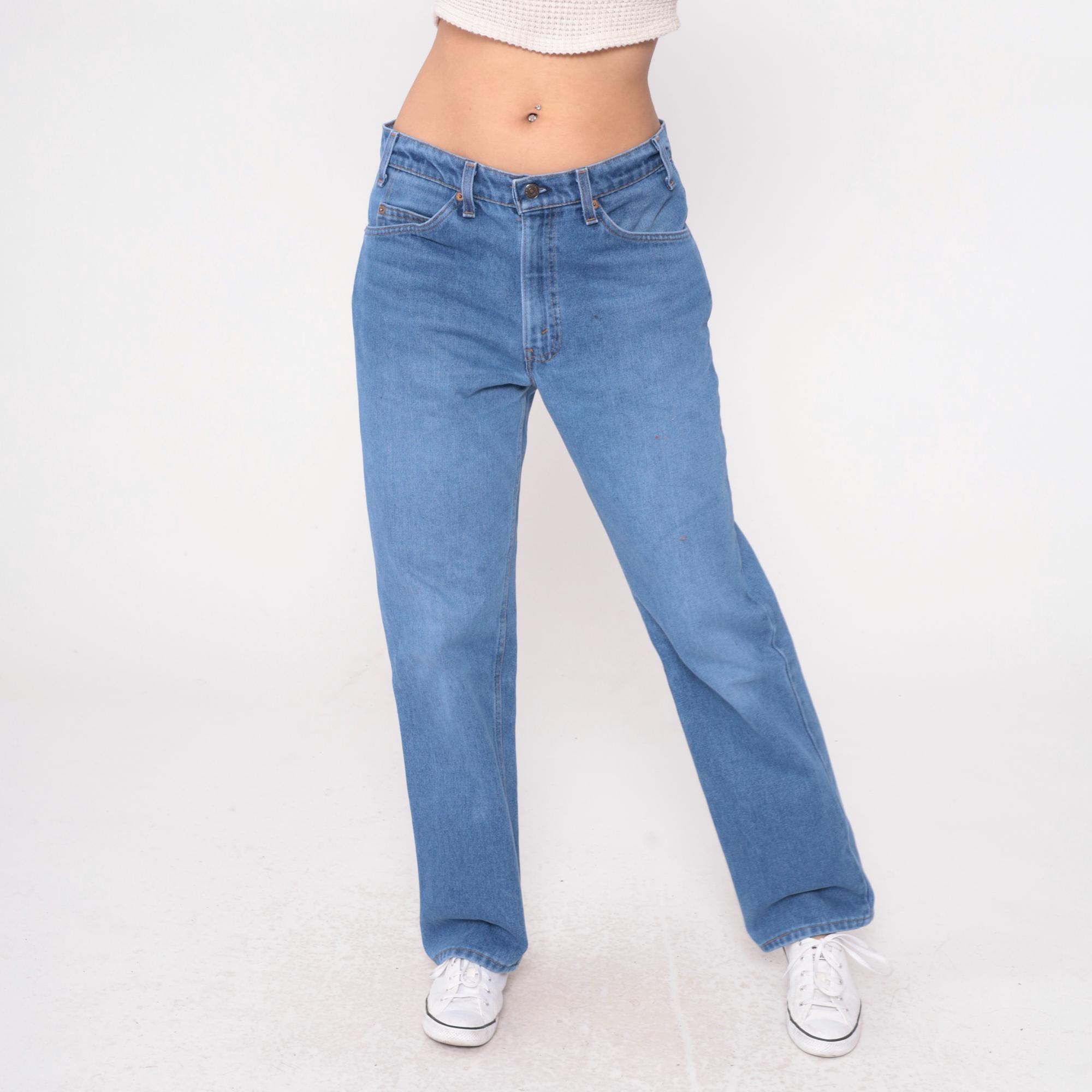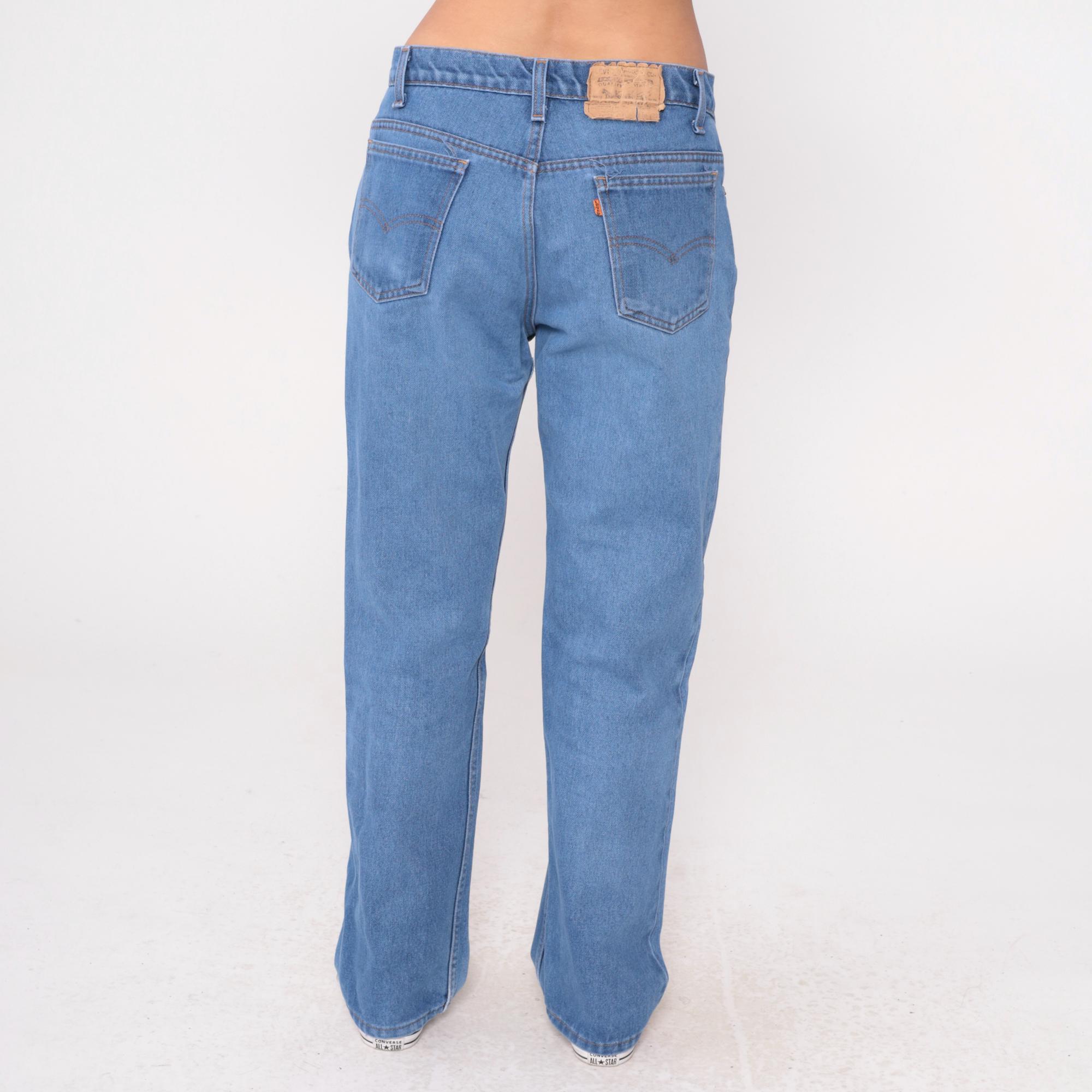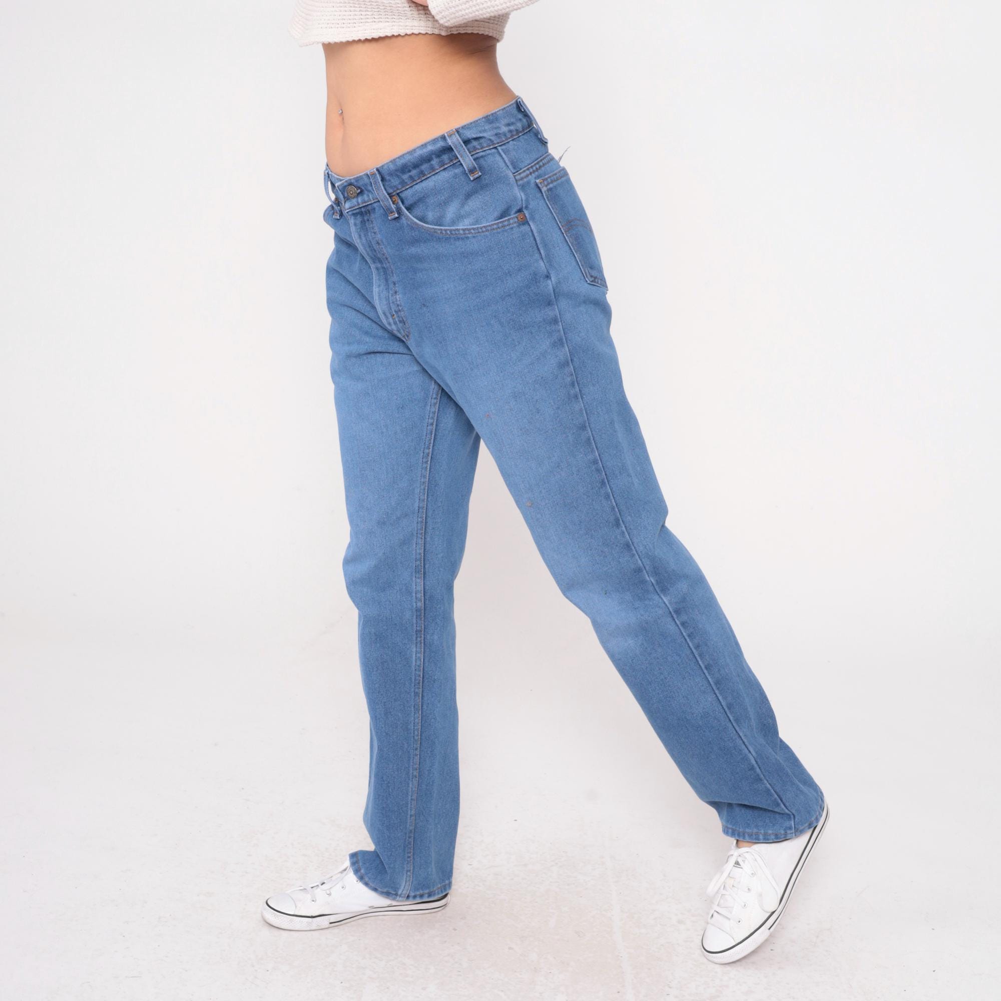 80s high waisted straight leg jeans from Levi's in medium blue denim. Zipper fly closure with classic five pocket styling and tan leather Levi's patch at back waistband. Straight leg cut from hip to ankle. Cotton denim. Labelled 34x32.
