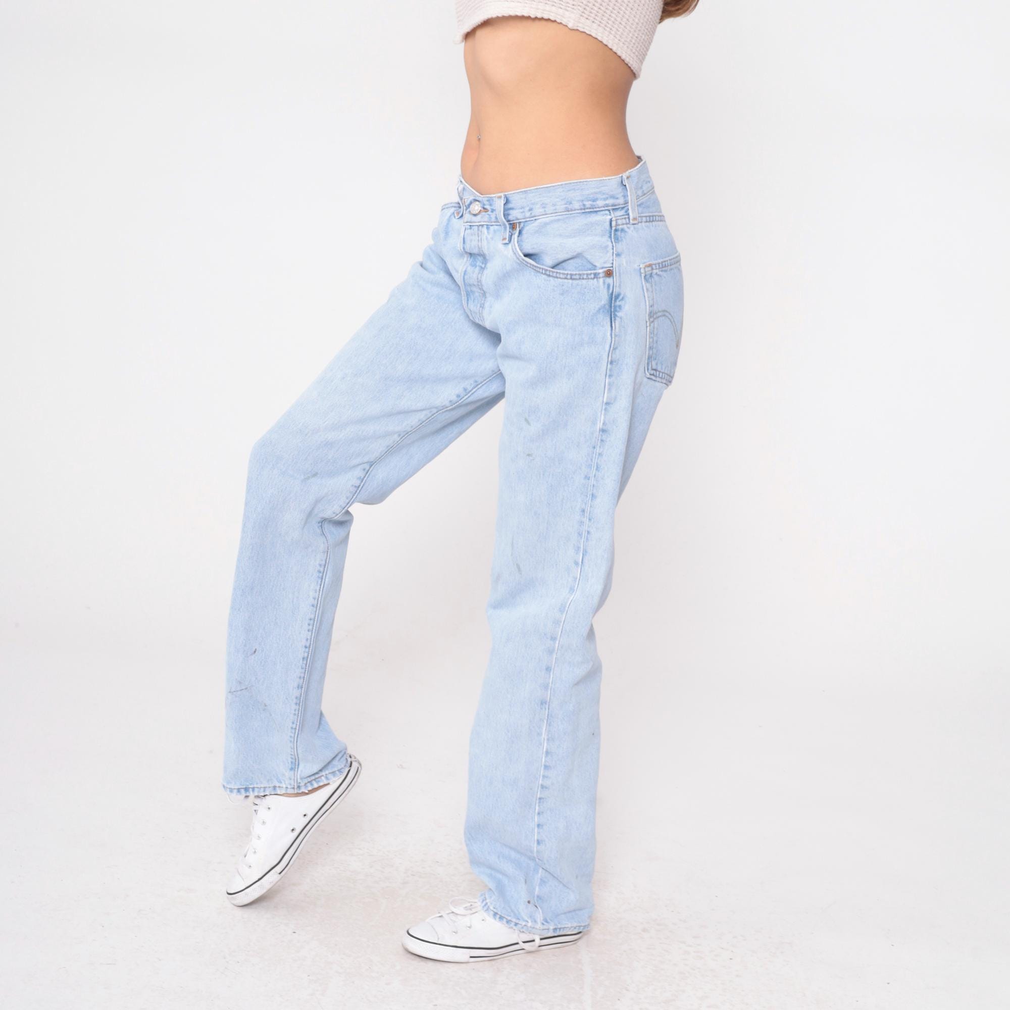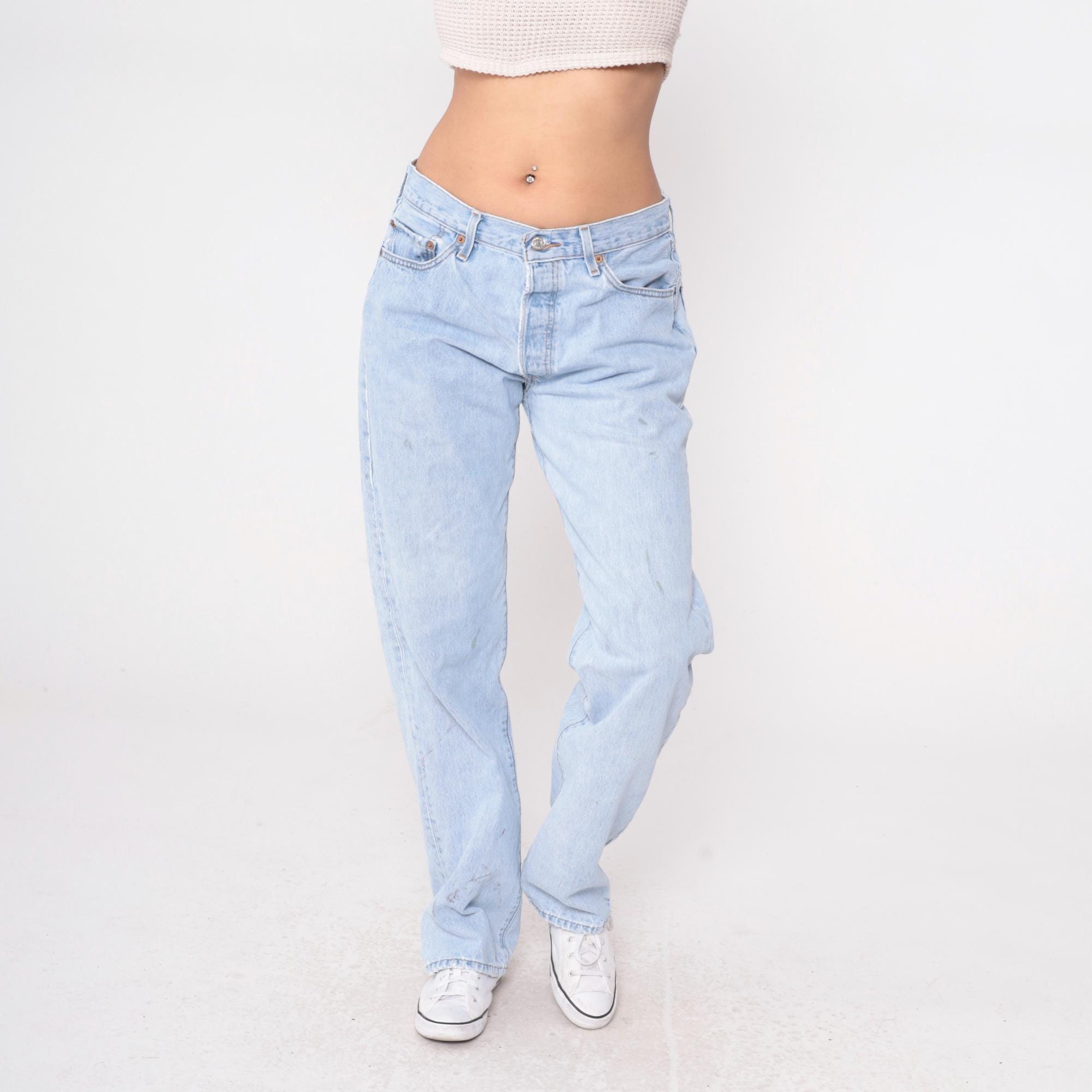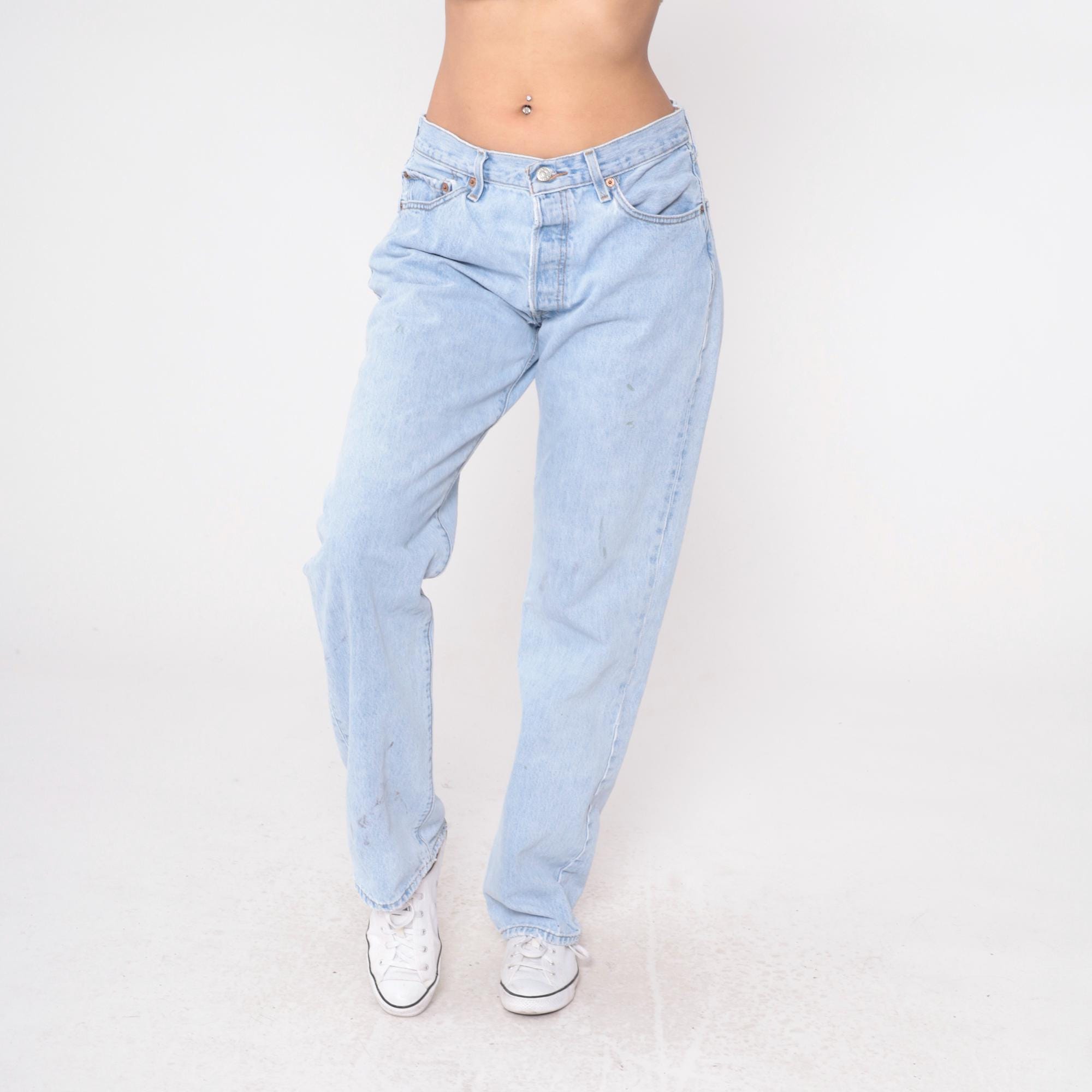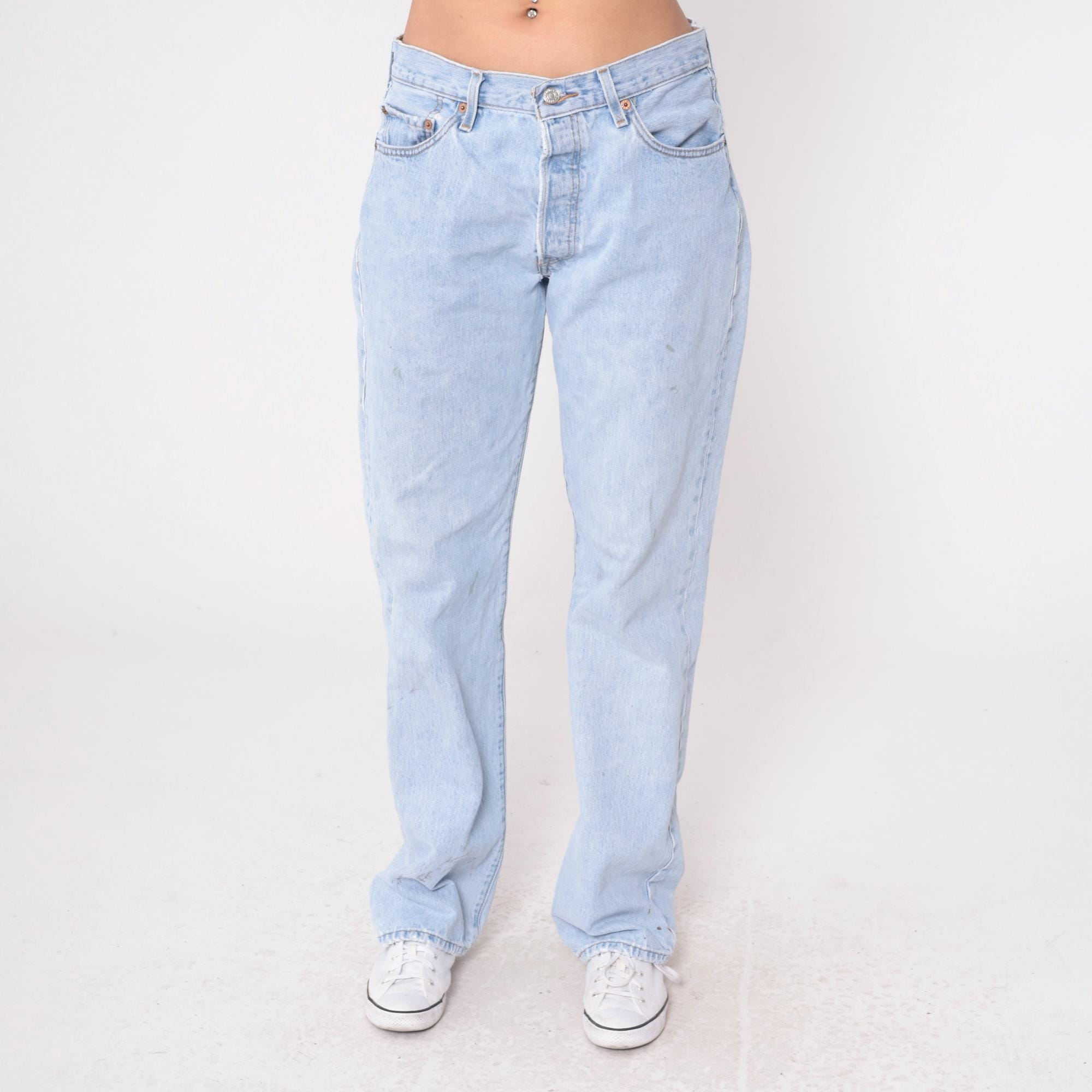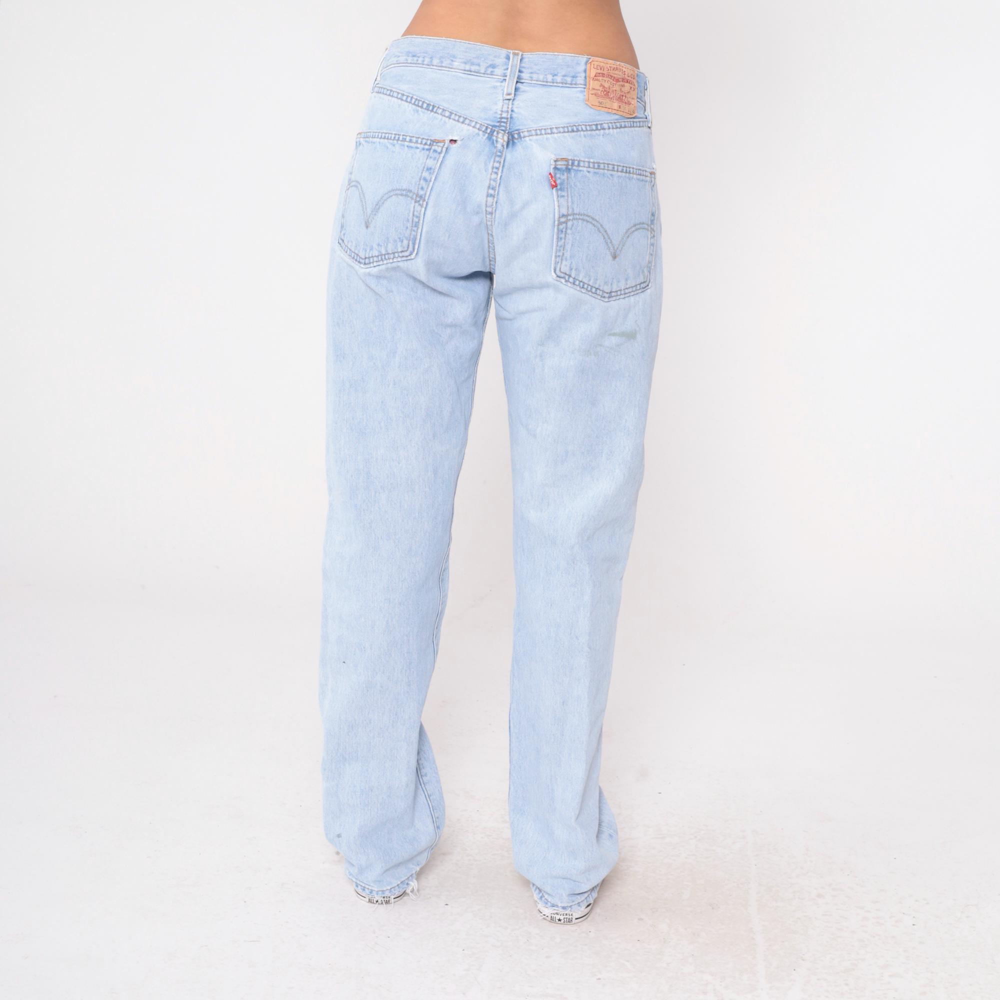 Levi's 501 jeans from the early 2000s in light blue wash denim with straight leg cut and button fly closure. Five-pocket styling with red Levi's tab on back pocket and leather brand patch at back waist. Distressed with marks and wear throughout the fabric. Cotton denim. Tagged size 34 x 34.