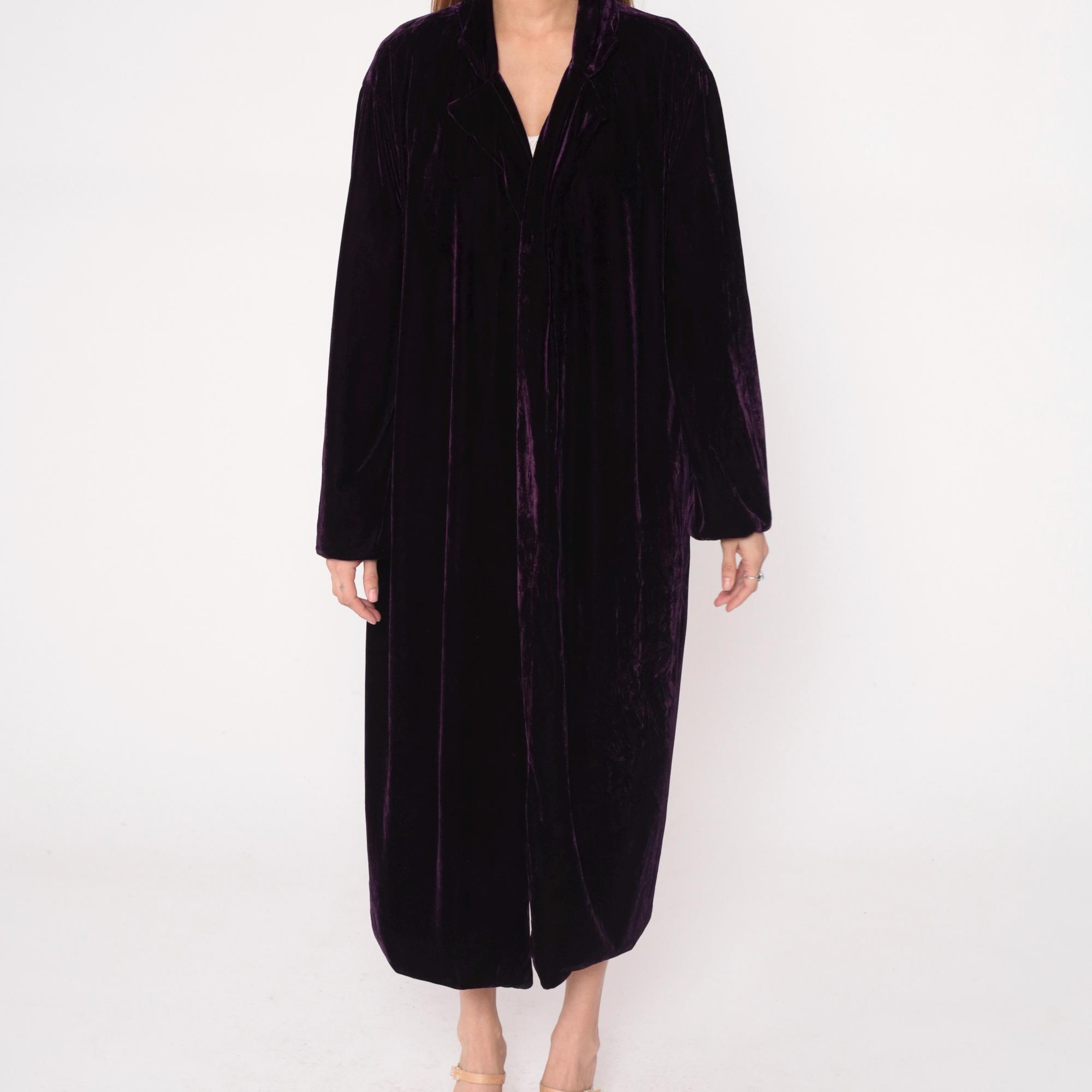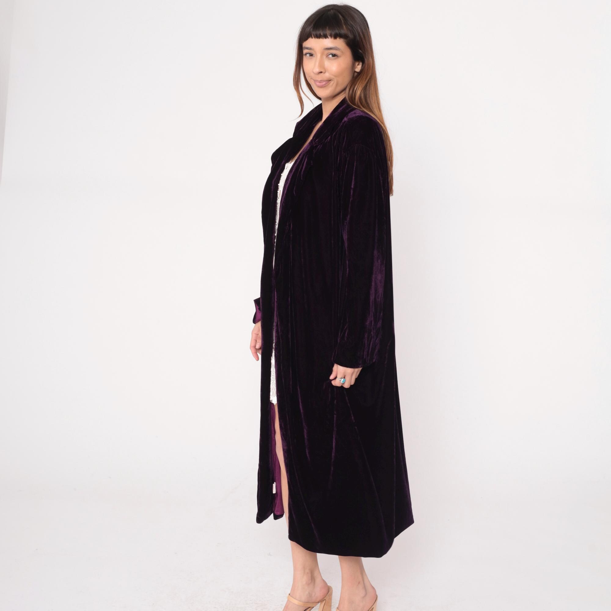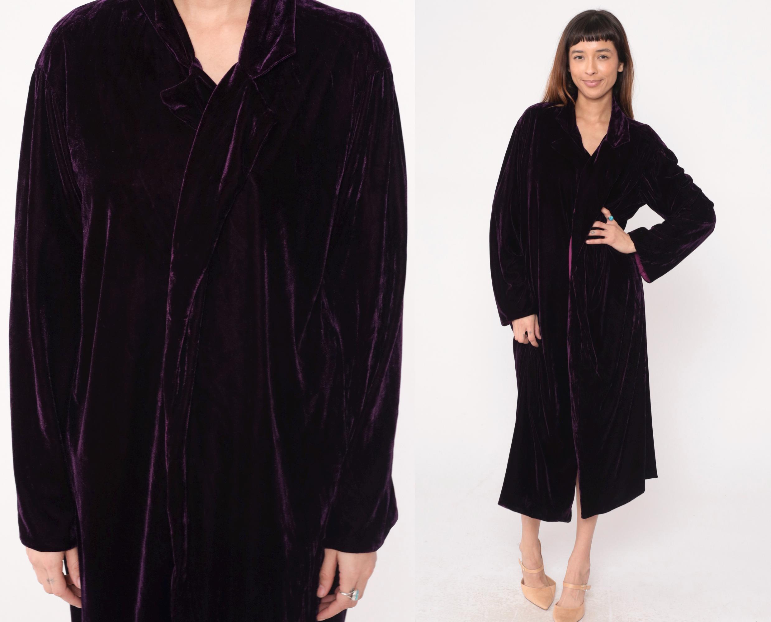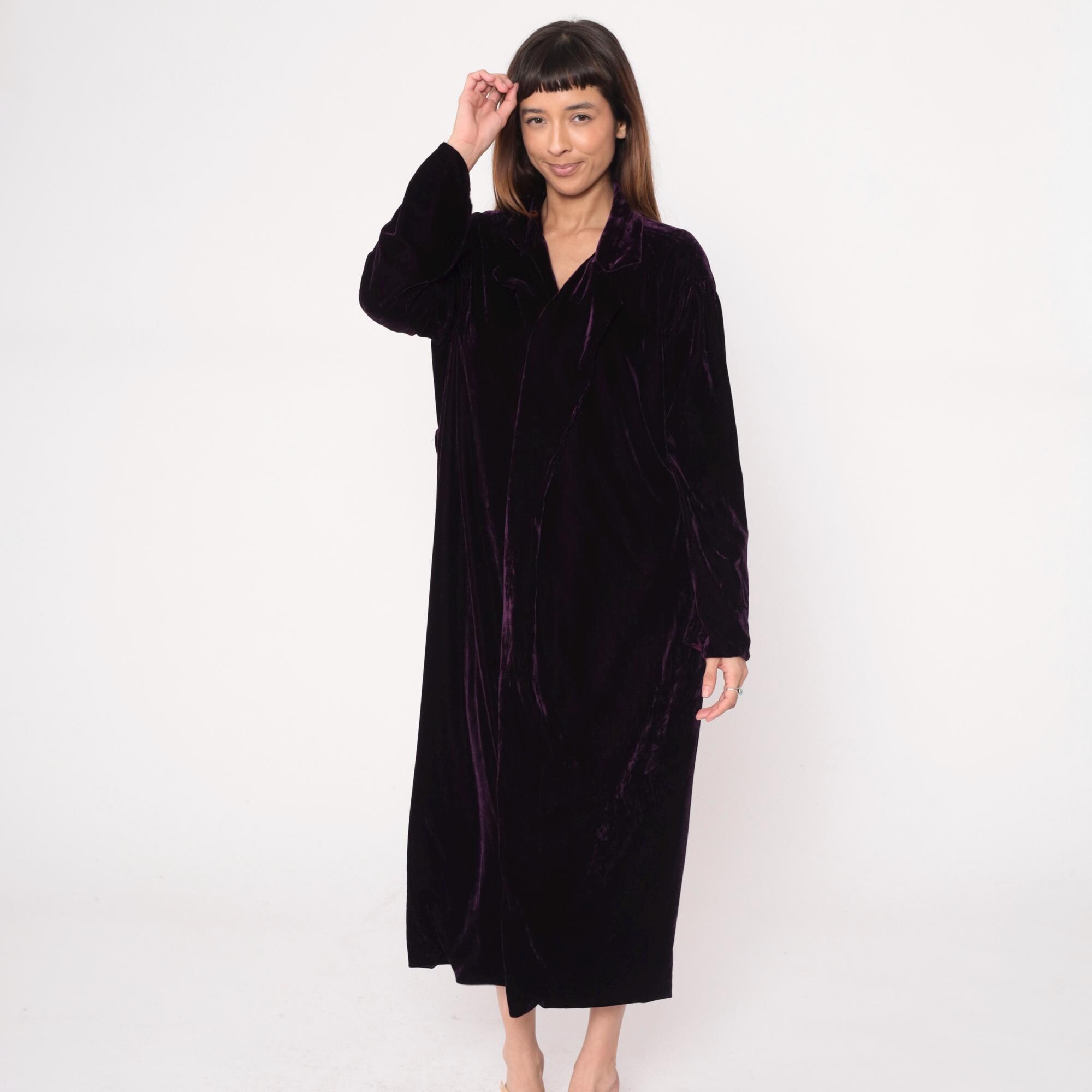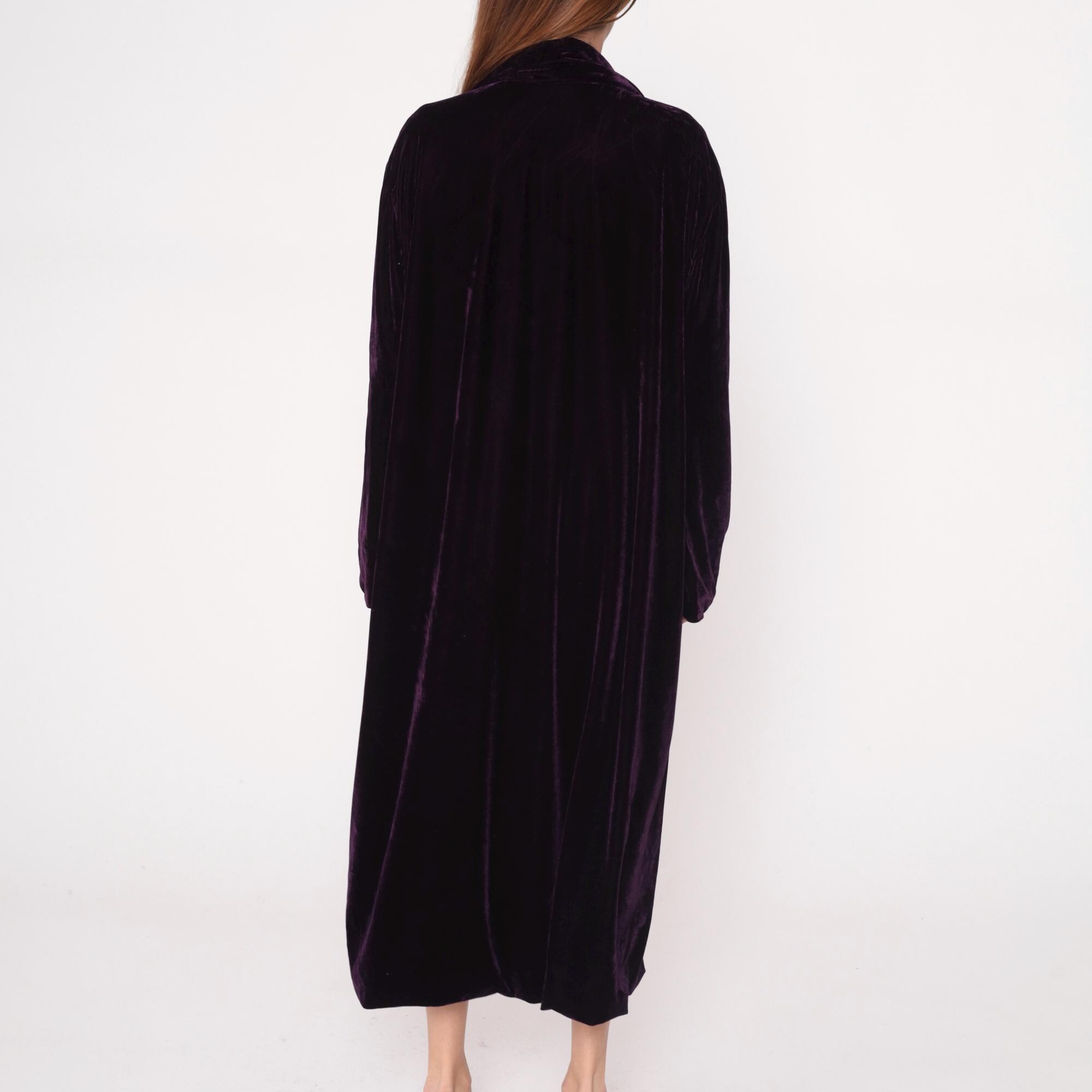 90s deep purple velvet robe with notched collar and open front design. Long sleeves, maxi length reaching approximately 48 inches from shoulder. Contrasting plum-colored satin lining