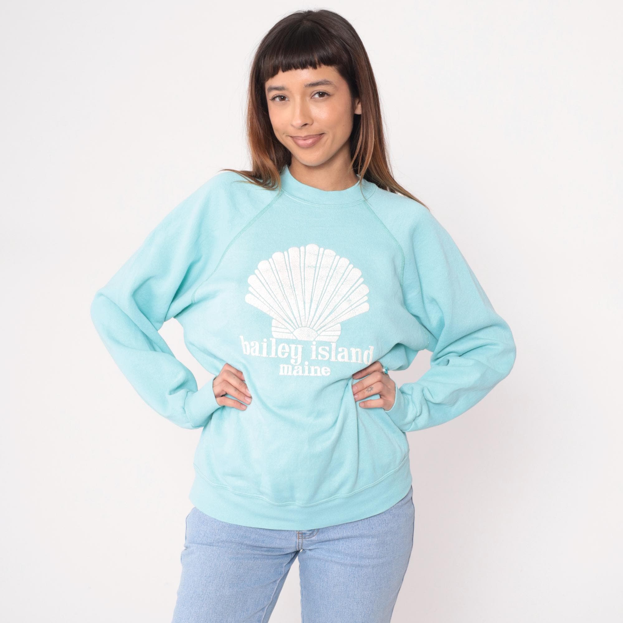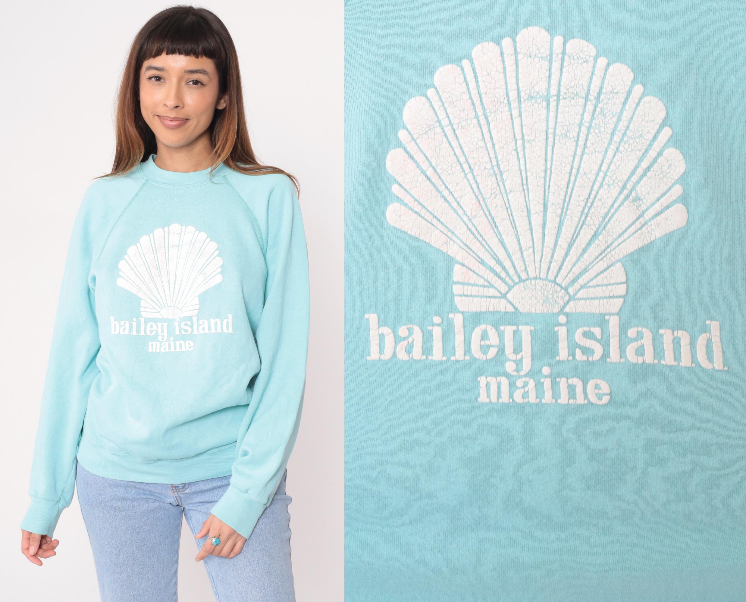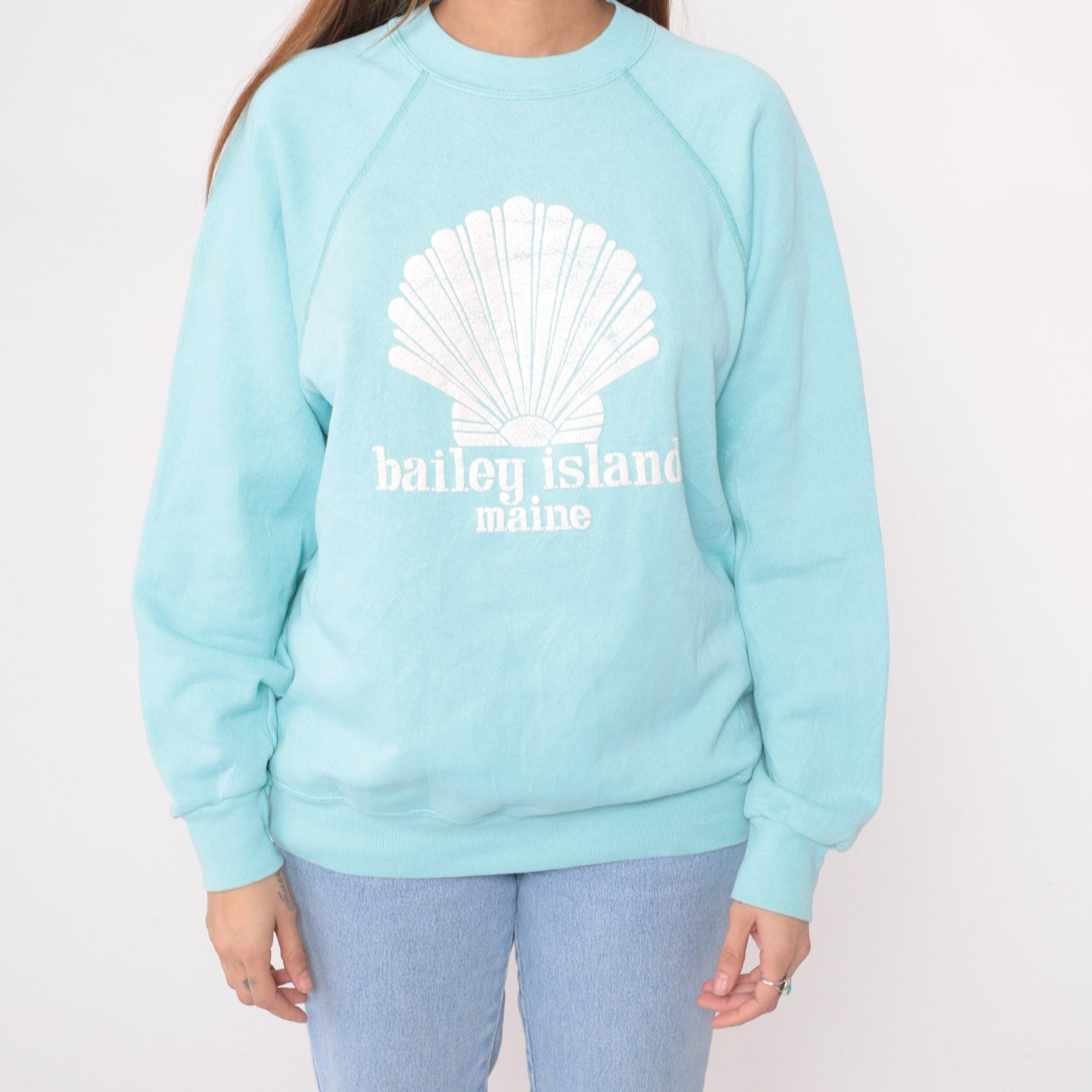80s pale blue sweatshirt from Tultex with "bailey island maine" graphic and white seashell illustration on front. Raglan sleeves, ribbed crewneck collar, ribbed cuffs and hem.