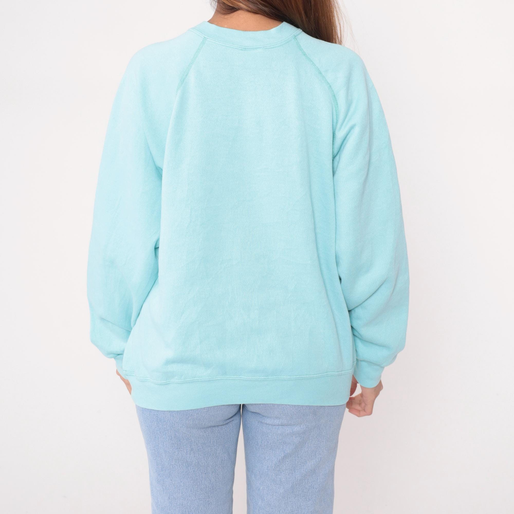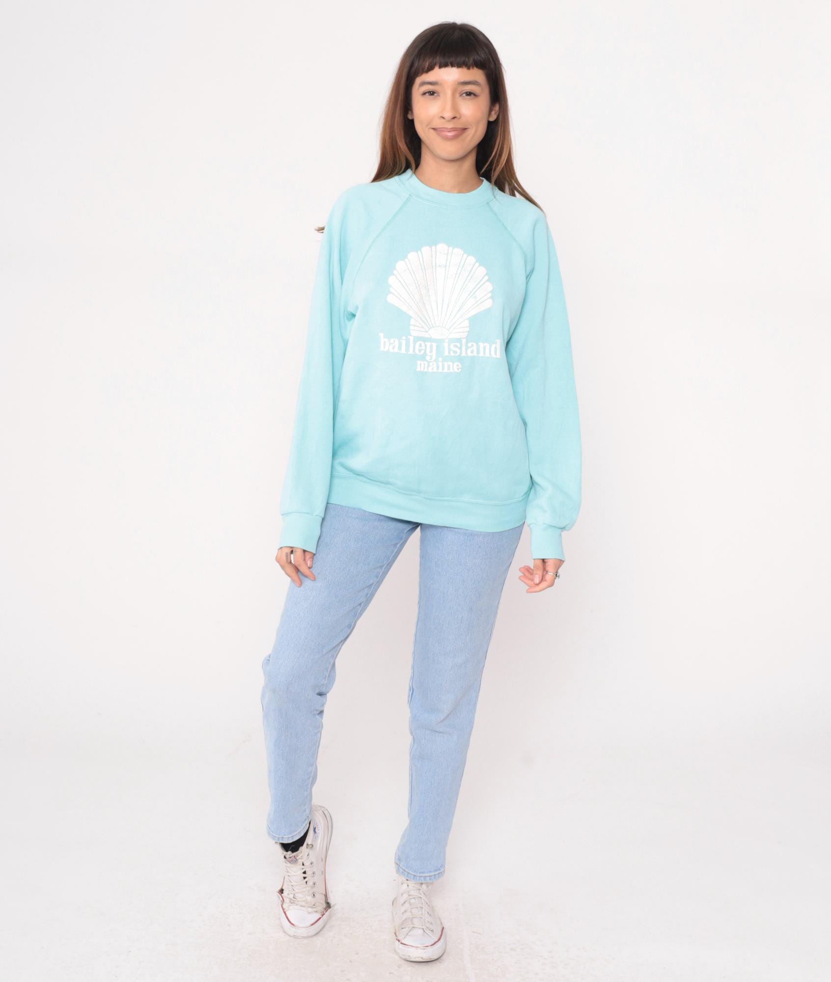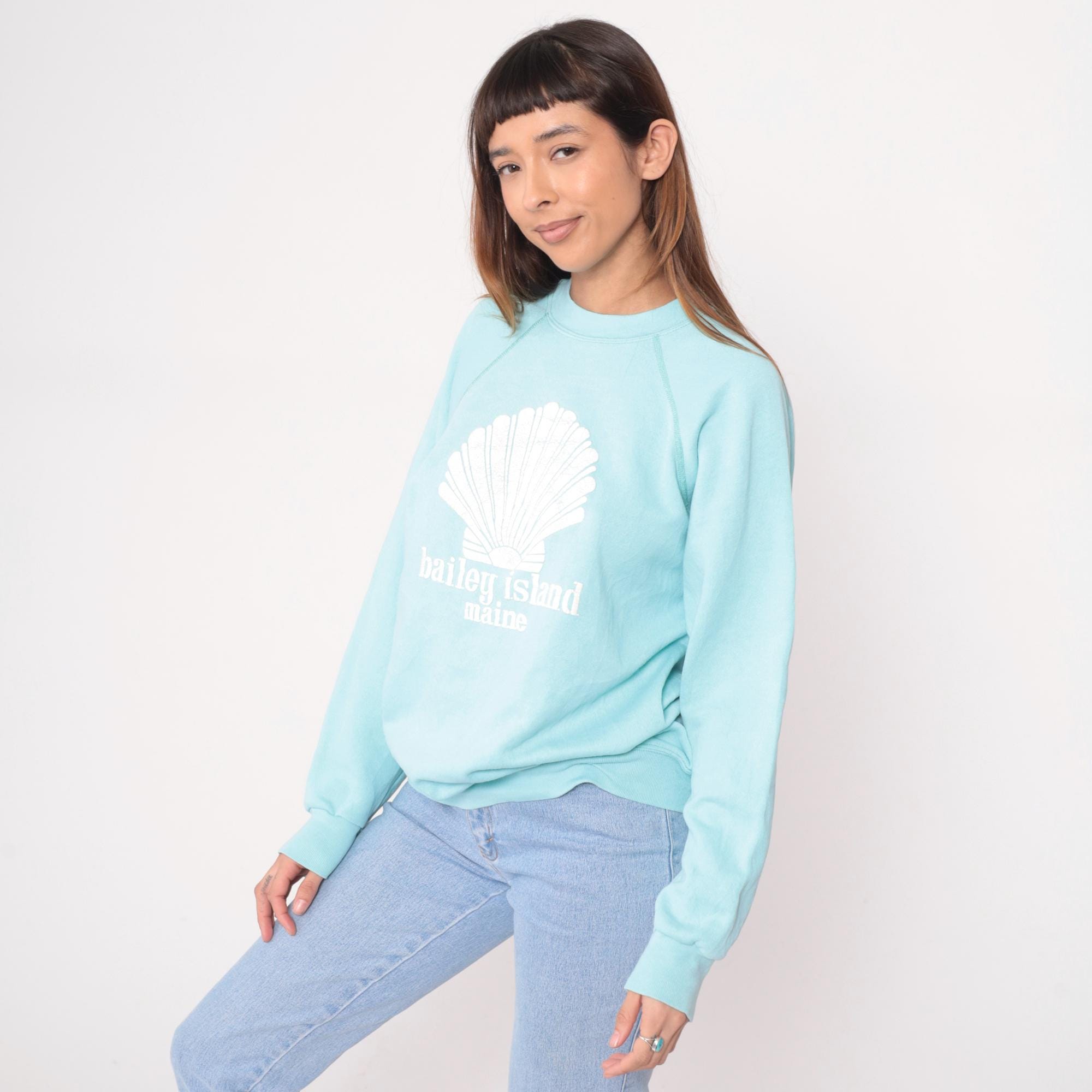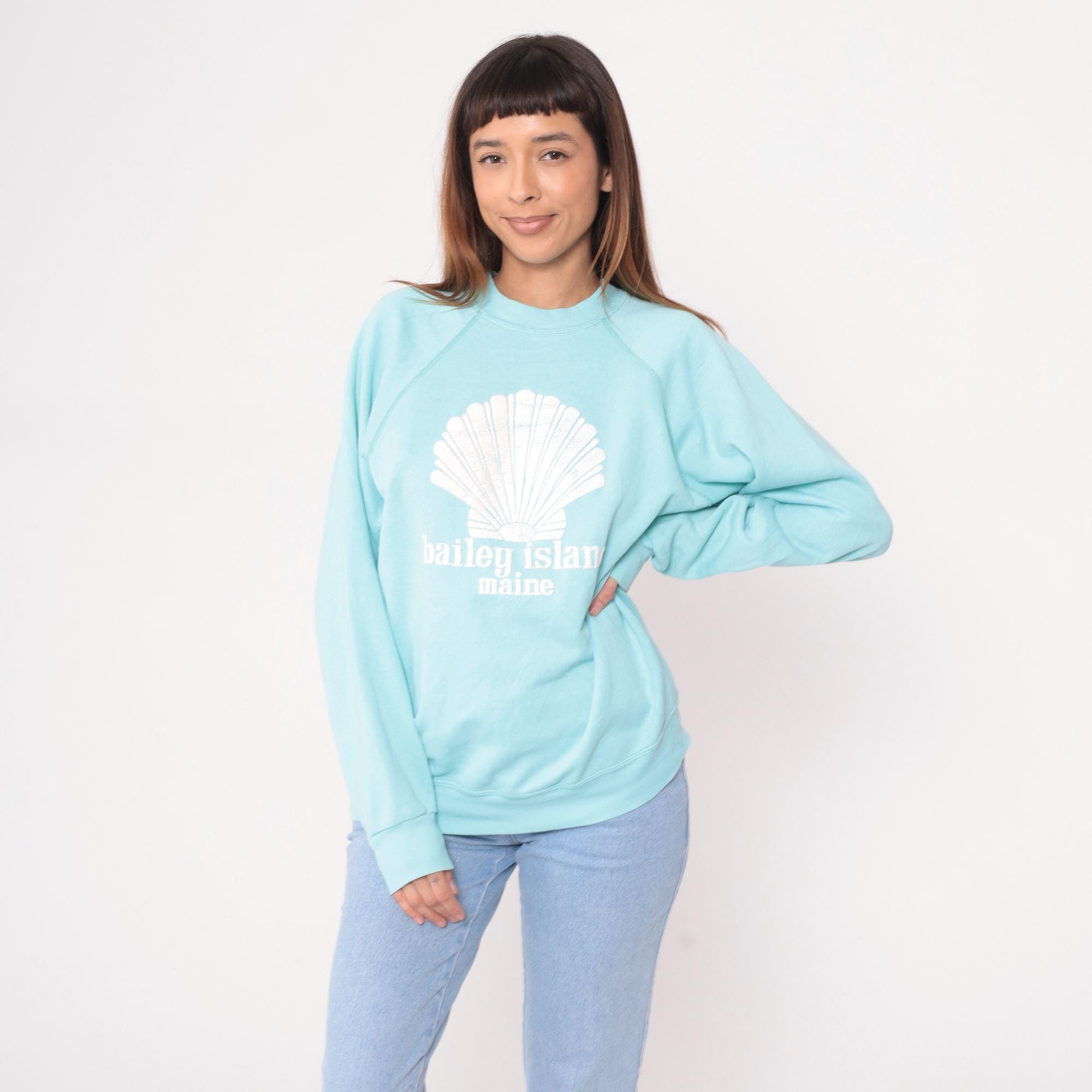 80s pale blue sweatshirt from Tultex with "bailey island maine" graphic and white seashell illustration on front. Raglan sleeves, ribbed crewneck collar, ribbed cuffs and hem.