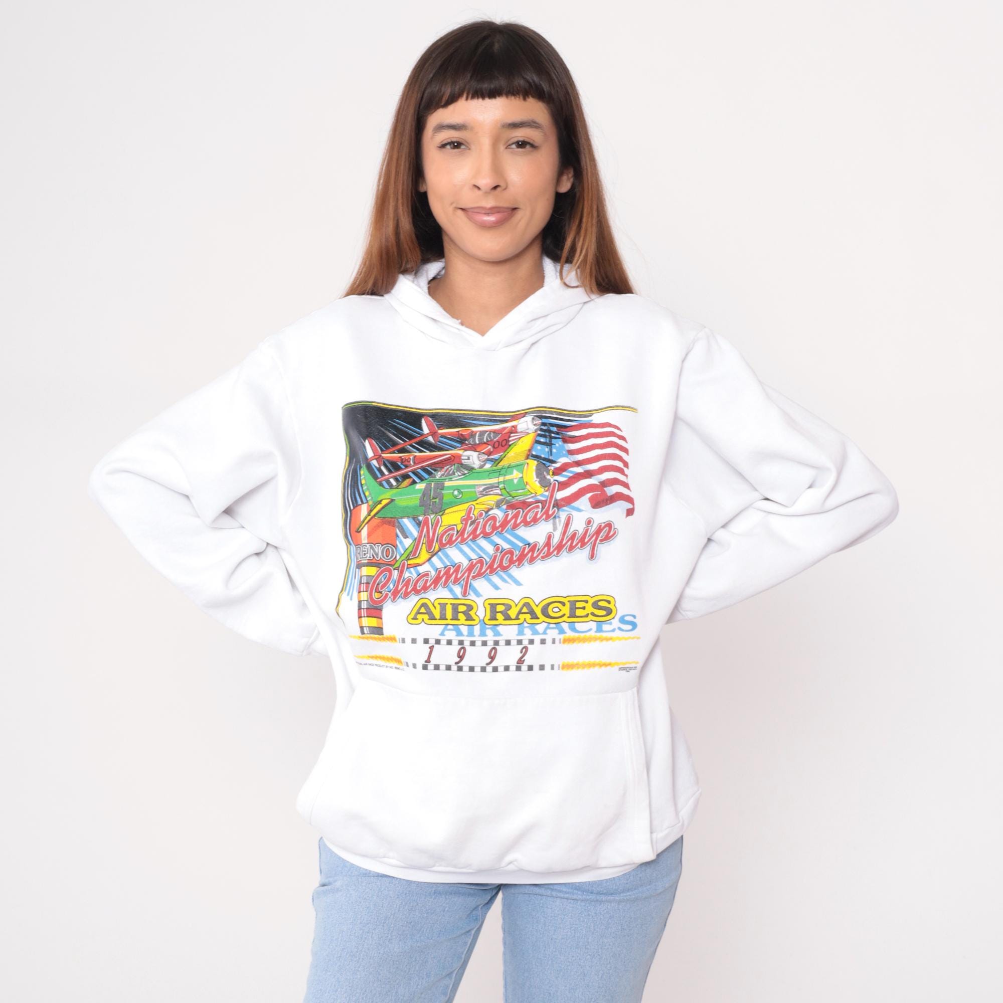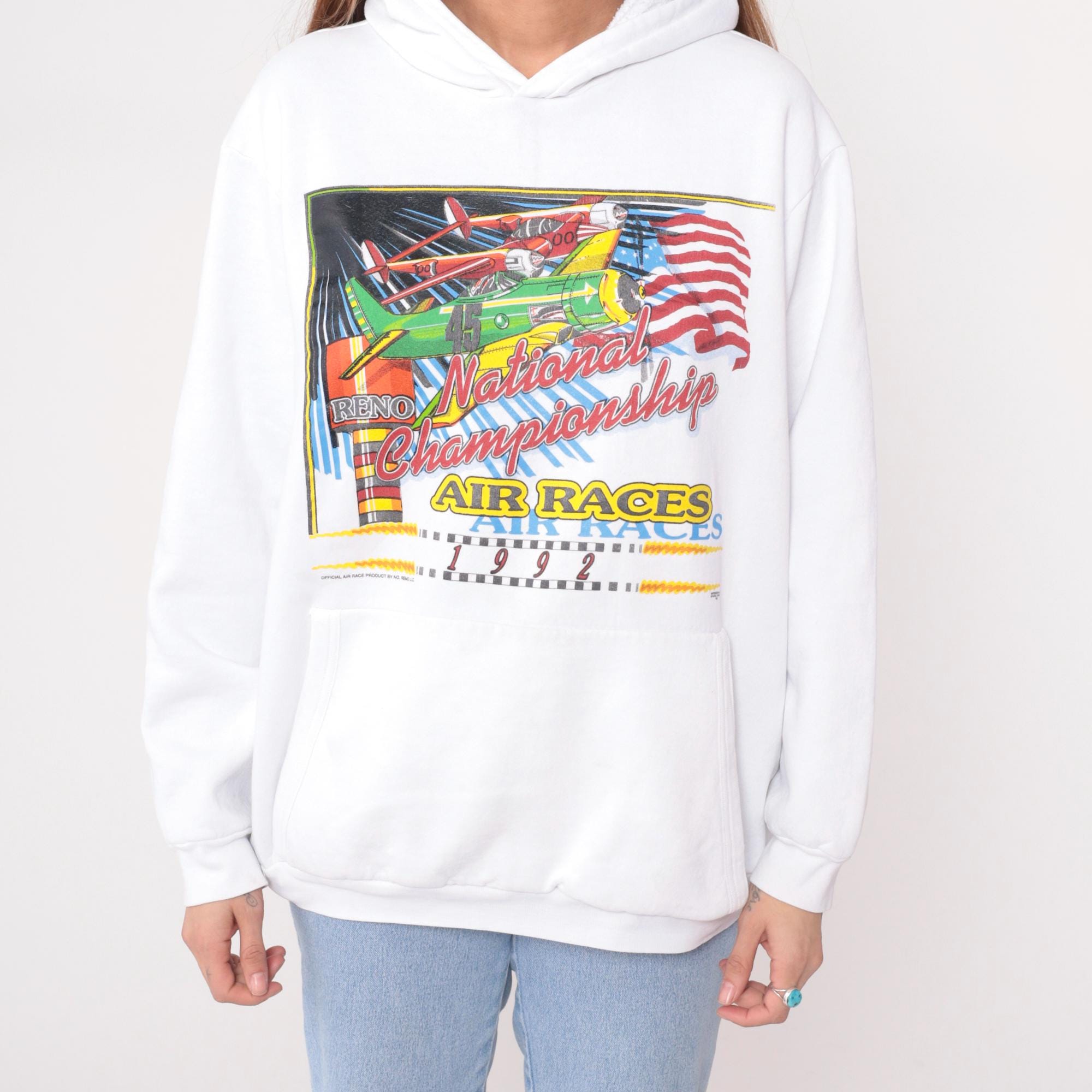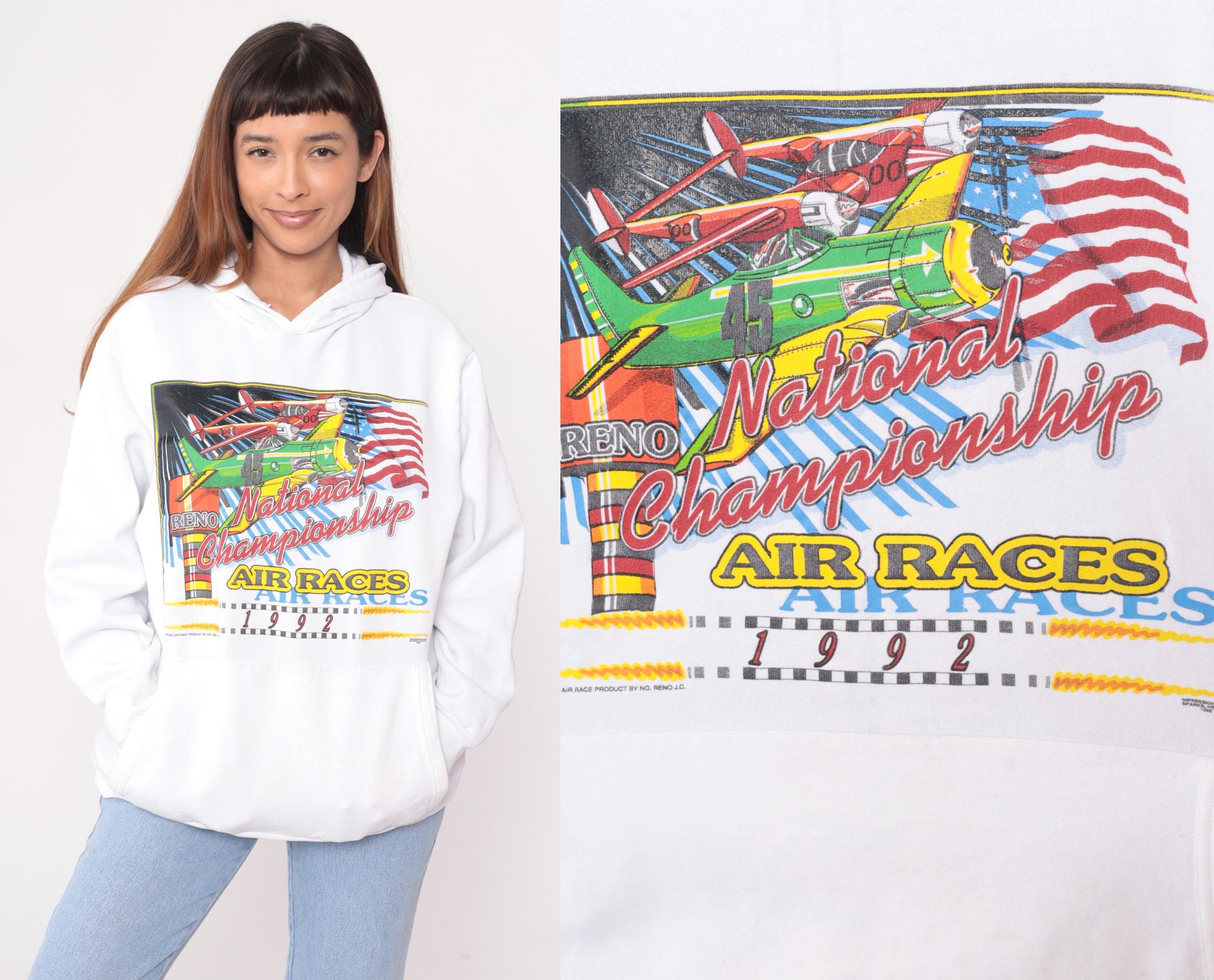 White hooded sweatshirt from the 90s with front graphic showing three vintage planes, American flag, and text reading "National Championship AIR RACES 1992" and "RENO" in red, yellow, green, and blue. Kangaroo pocket, drawstring hood, long sleeves with ribbed cuffs. Graphic has distressed appearance with spots throughout.