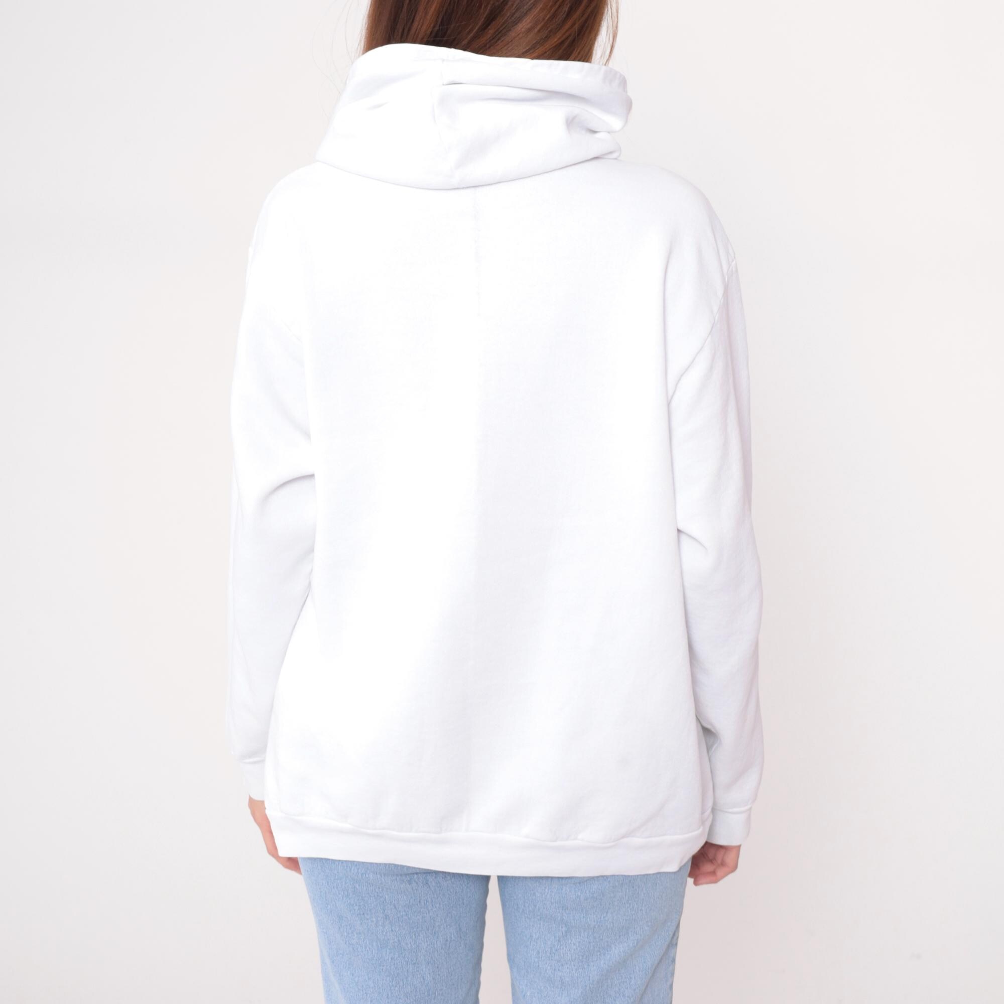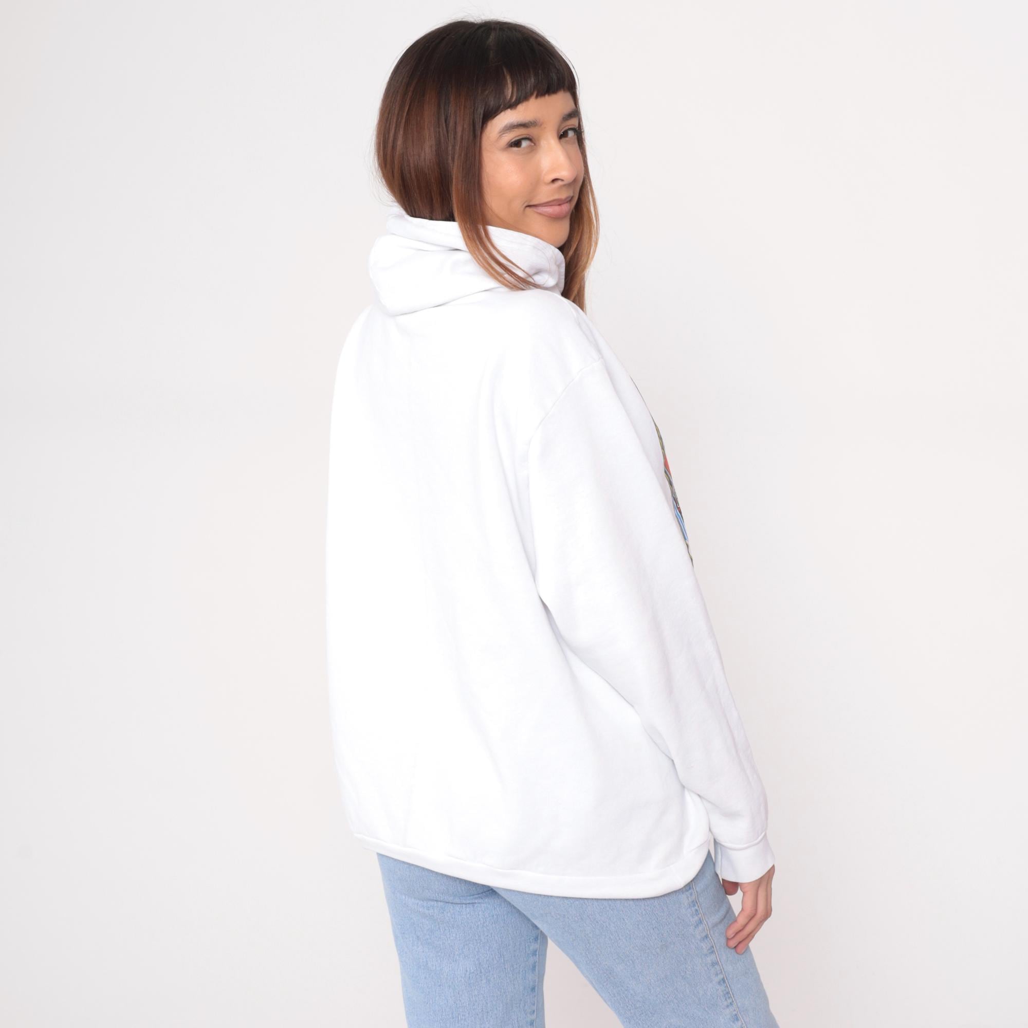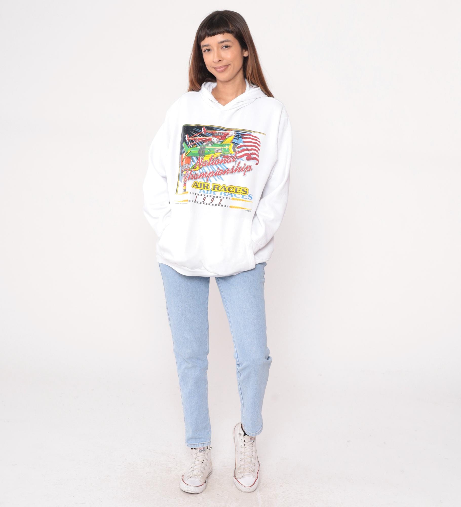 White hooded sweatshirt from the 90s with front graphic showing three vintage planes, American flag, and text reading "National Championship AIR RACES 1992" and "RENO" in red, yellow, green, and blue. Kangaroo pocket, drawstring hood, long sleeves with ribbed cuffs. Graphic has distressed appearance with spots throughout.