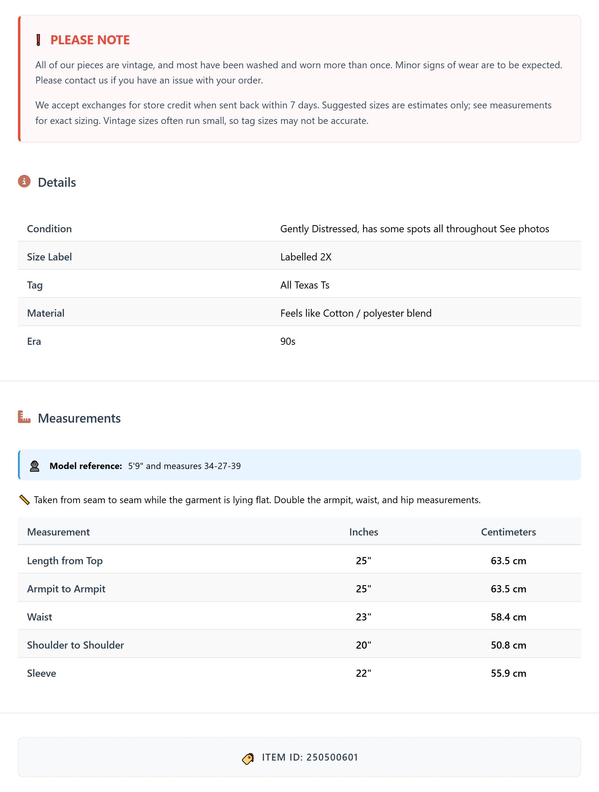 All of our pieces are vintage, and most have been washed and worn more than once. Minor signs of wear are to be expected. Please contact us if you have an issue with your order. We accept exchanges for store credit when sent back within 7 days.
