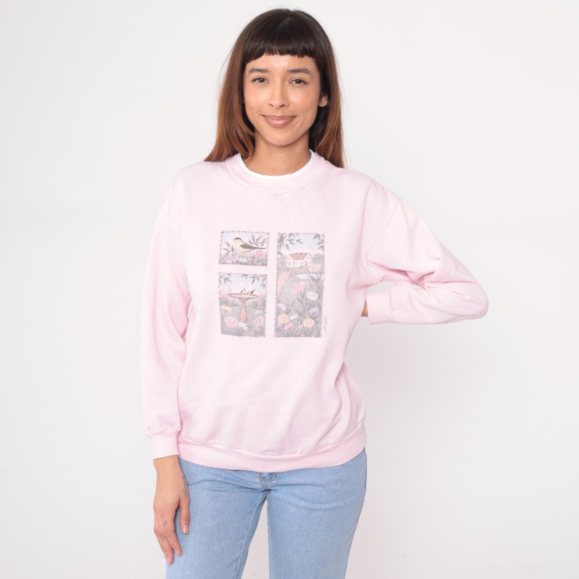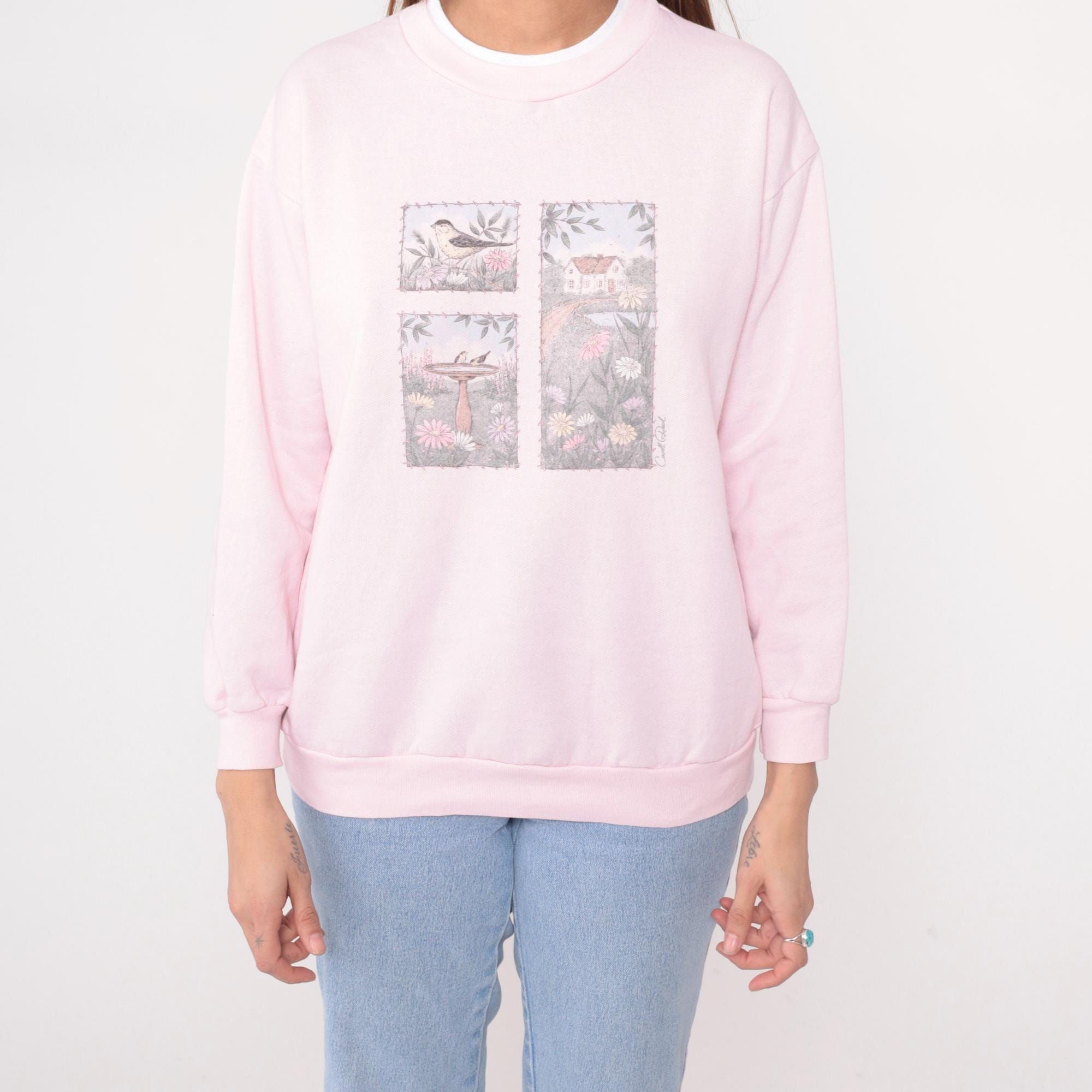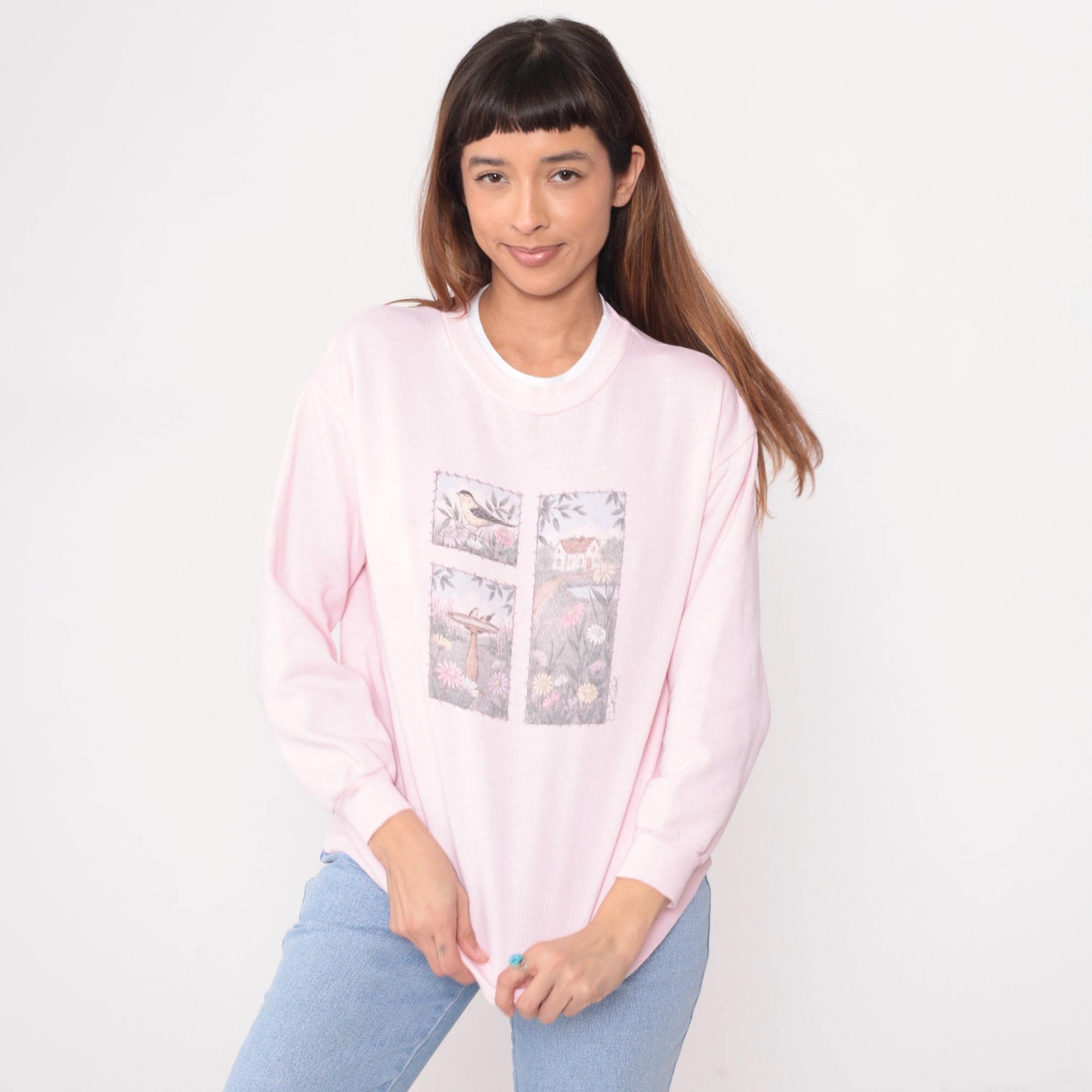 90s pale pink sweatshirt from Caroll Reed with four-panel graphic on chest depicting garden scenes with birds, flowers, a cottage house, and a birdbath. Crew neck with ribbed collar, cuffs, and hem.