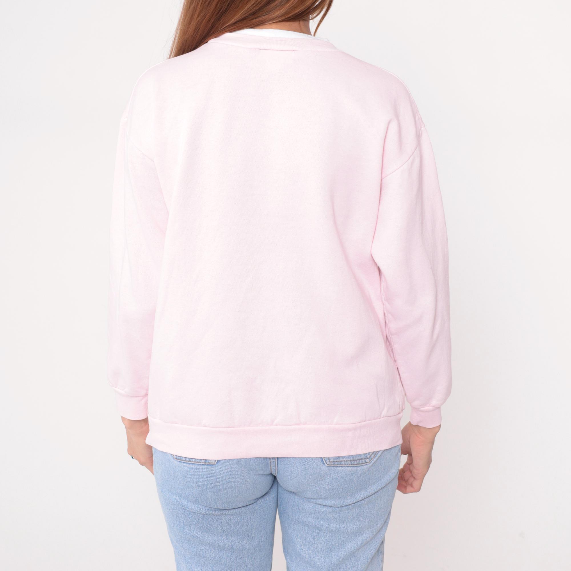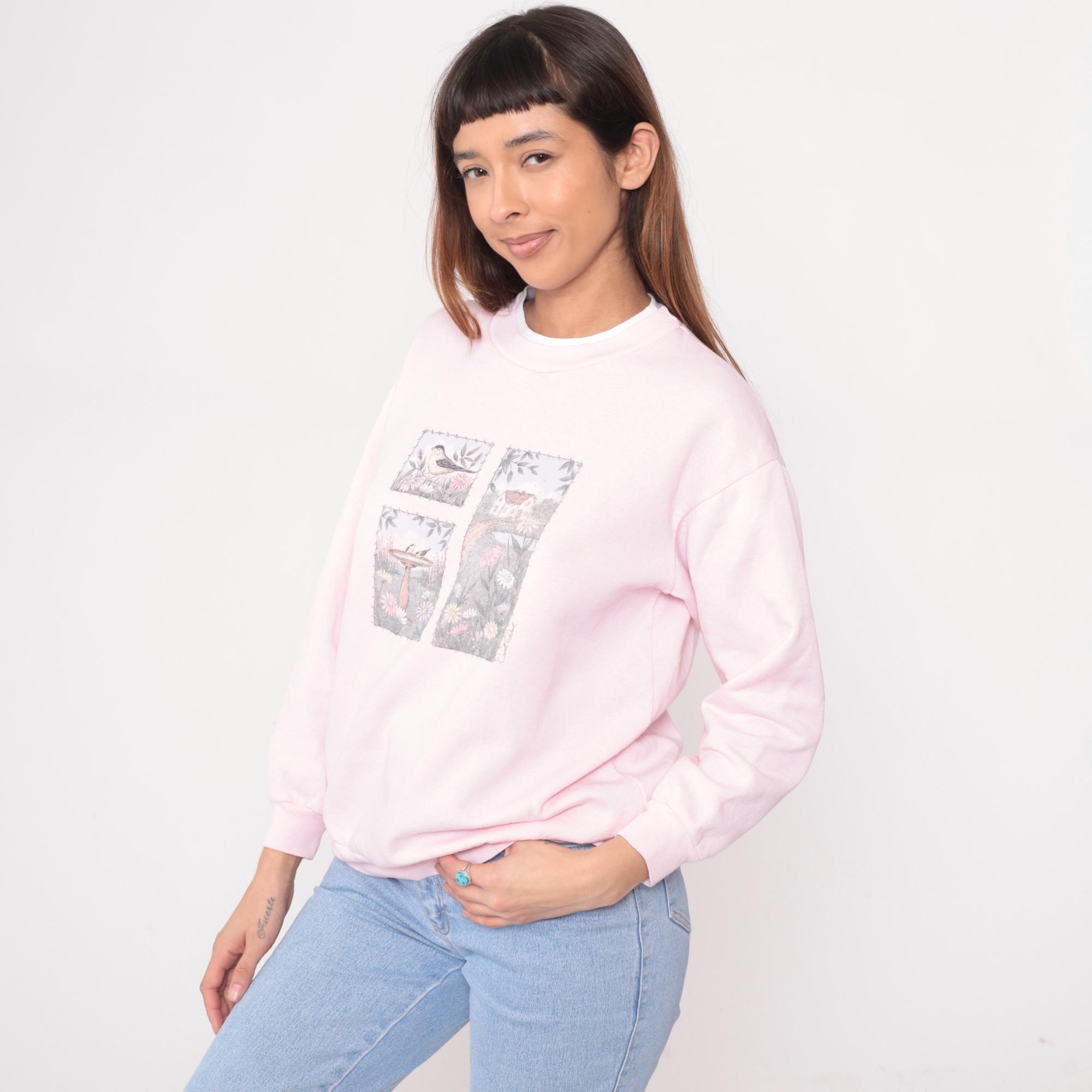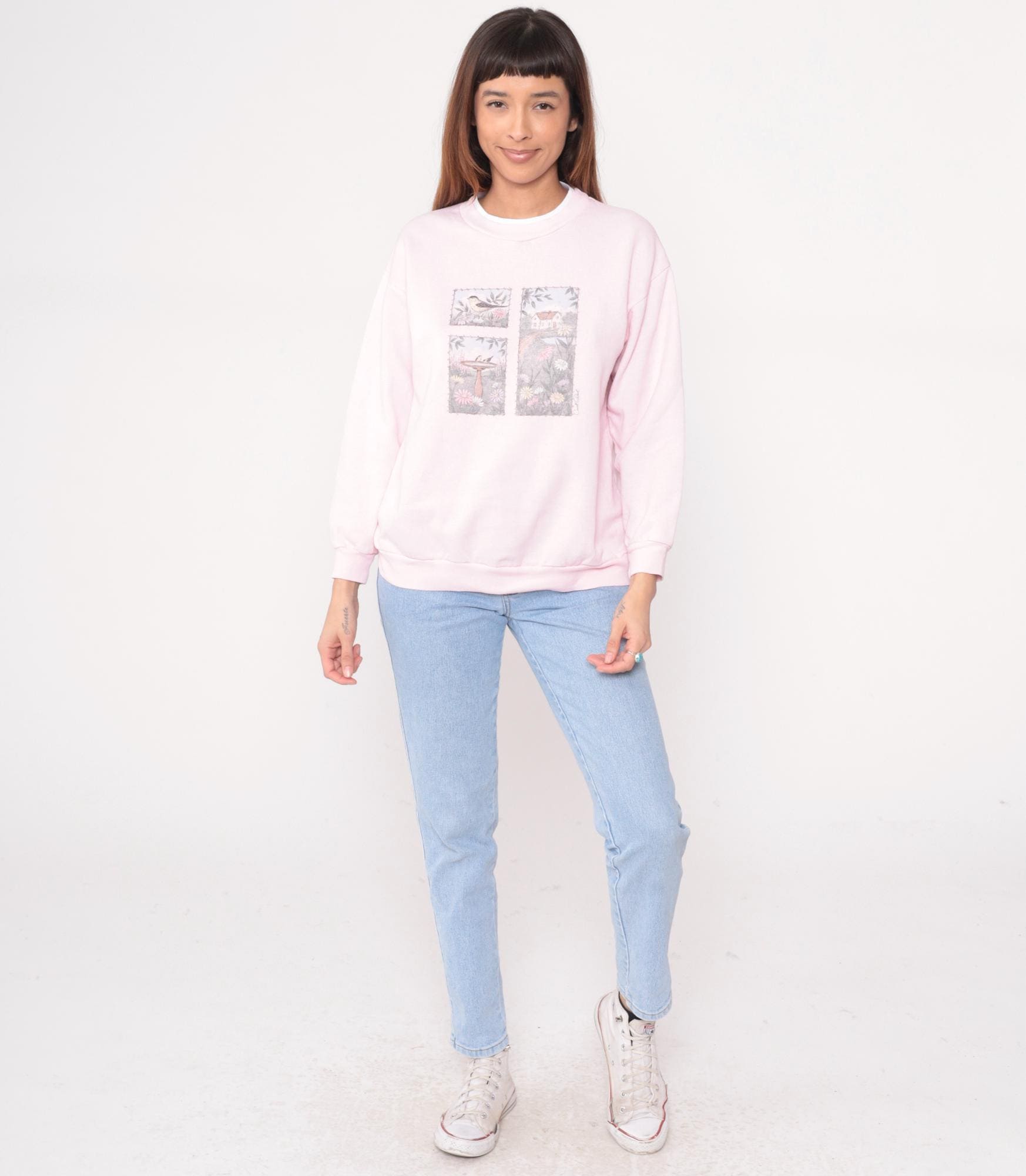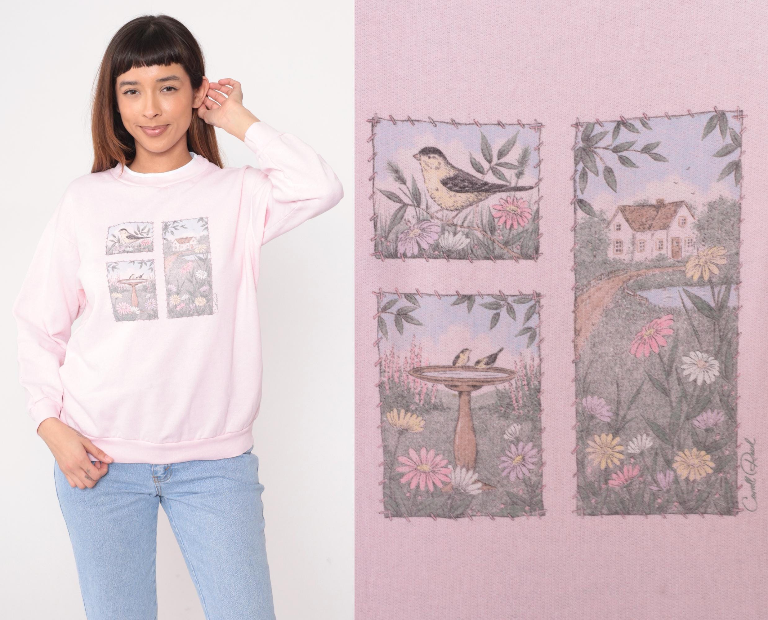 90s pale pink sweatshirt from Caroll Reed with four-panel graphic on chest depicting garden scenes with birds, flowers, a cottage house, and a birdbath. Crew neck with ribbed collar, cuffs, and hem.