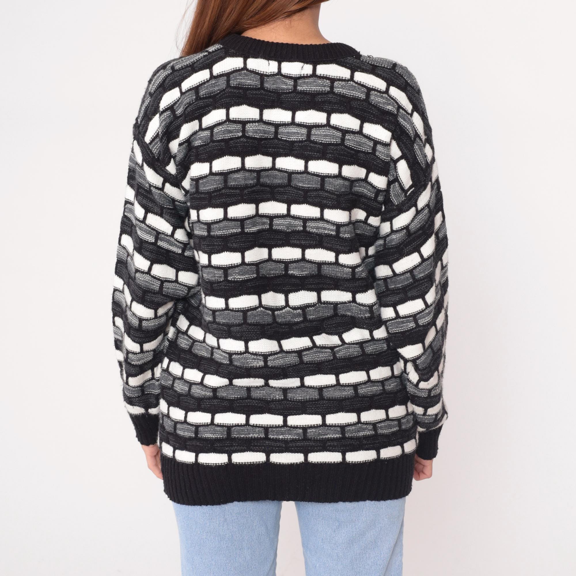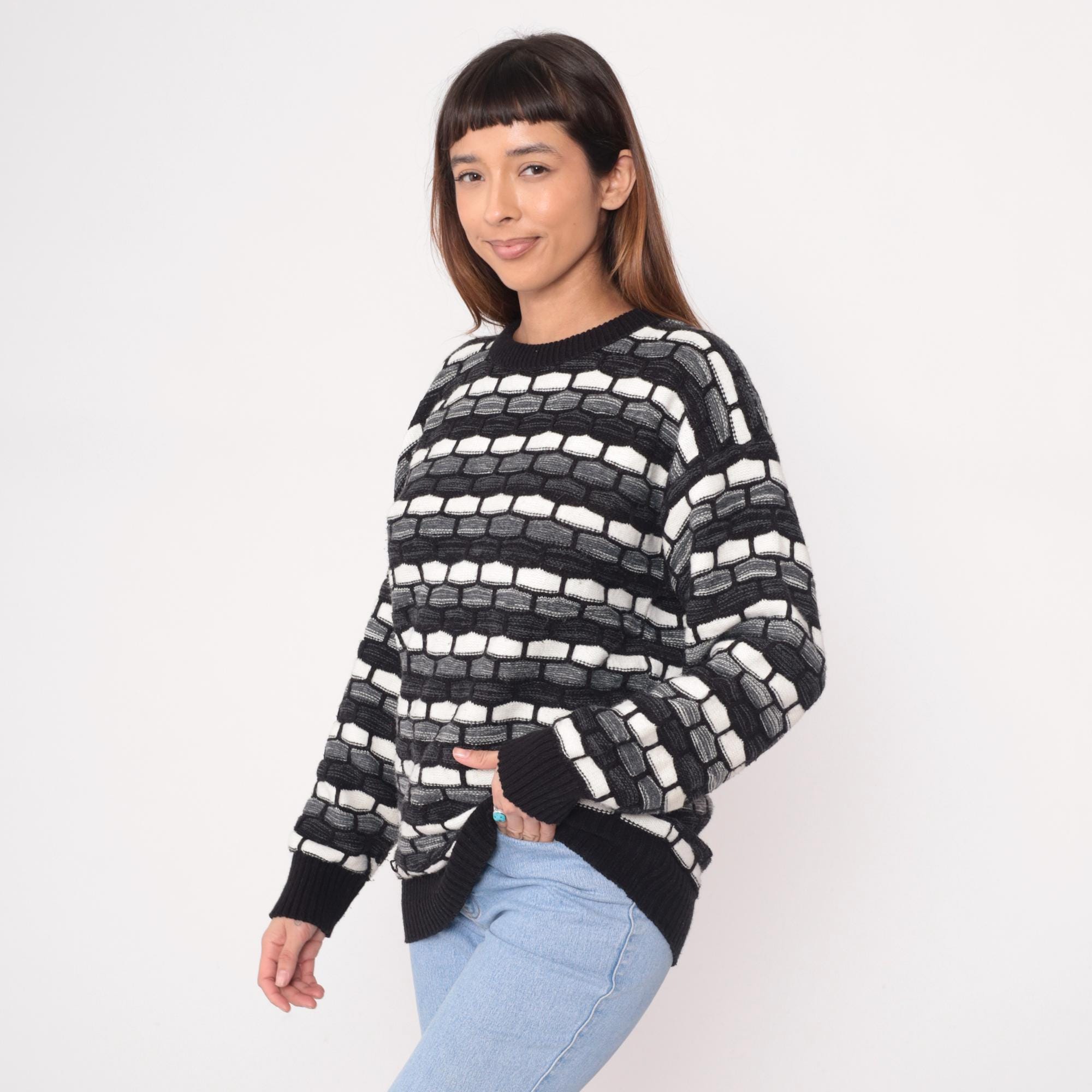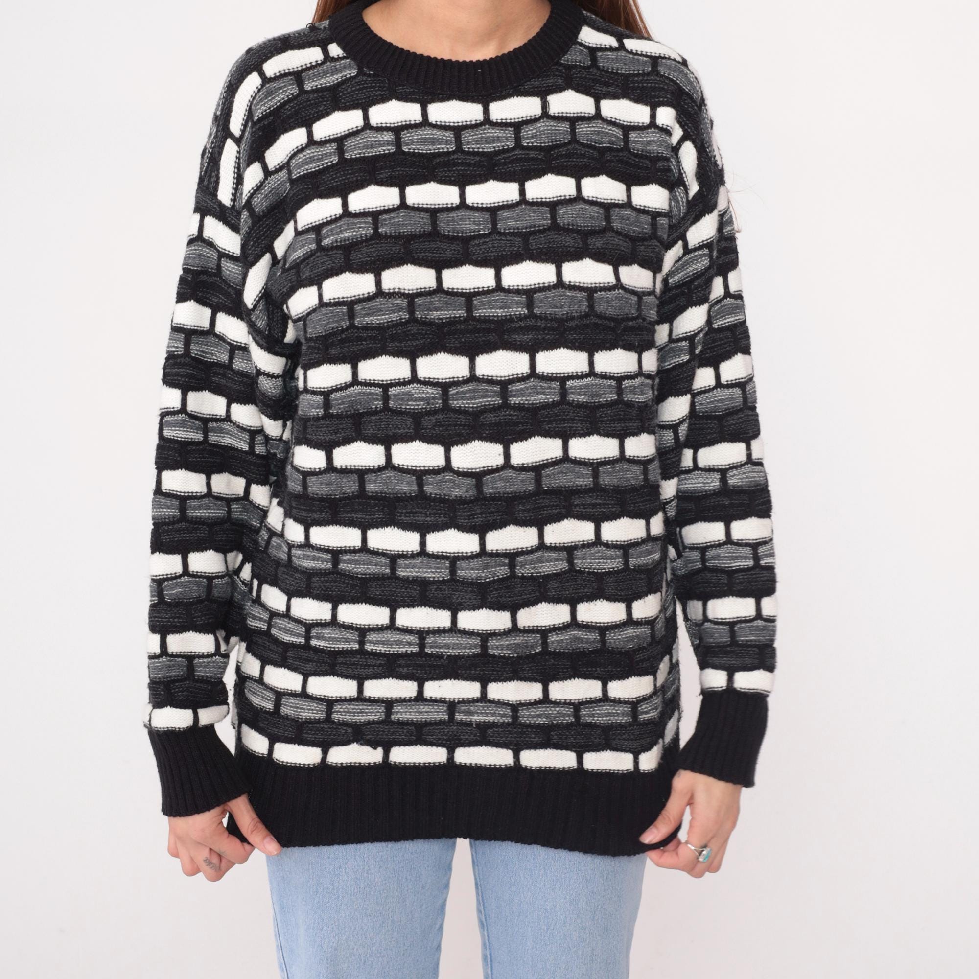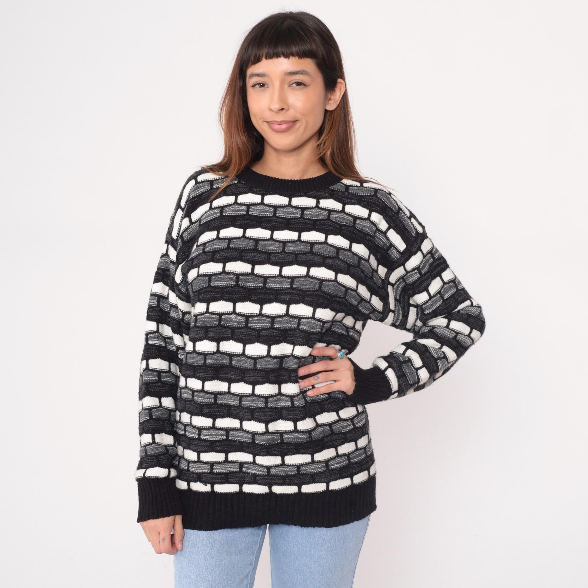 90s black, white, and gray geometric sweater from Checkpoint with horizontal brick pattern rows alternating across the knit. Crew neckline, long sleeves, ribbed trim at collar, cuffs, and hem.
