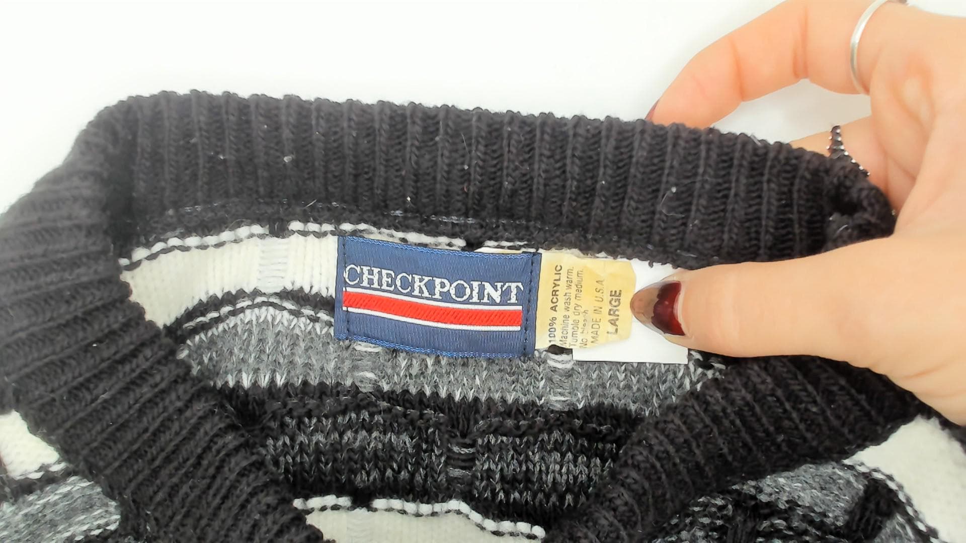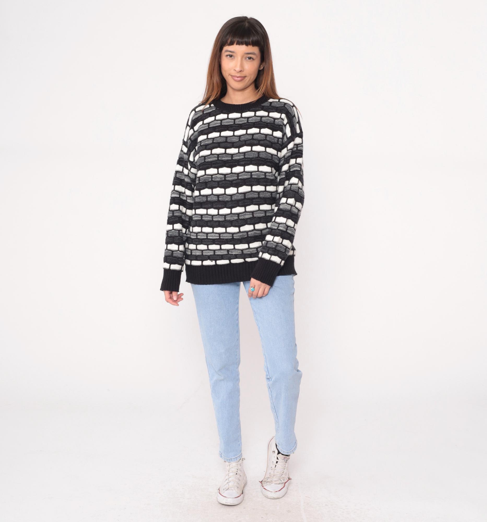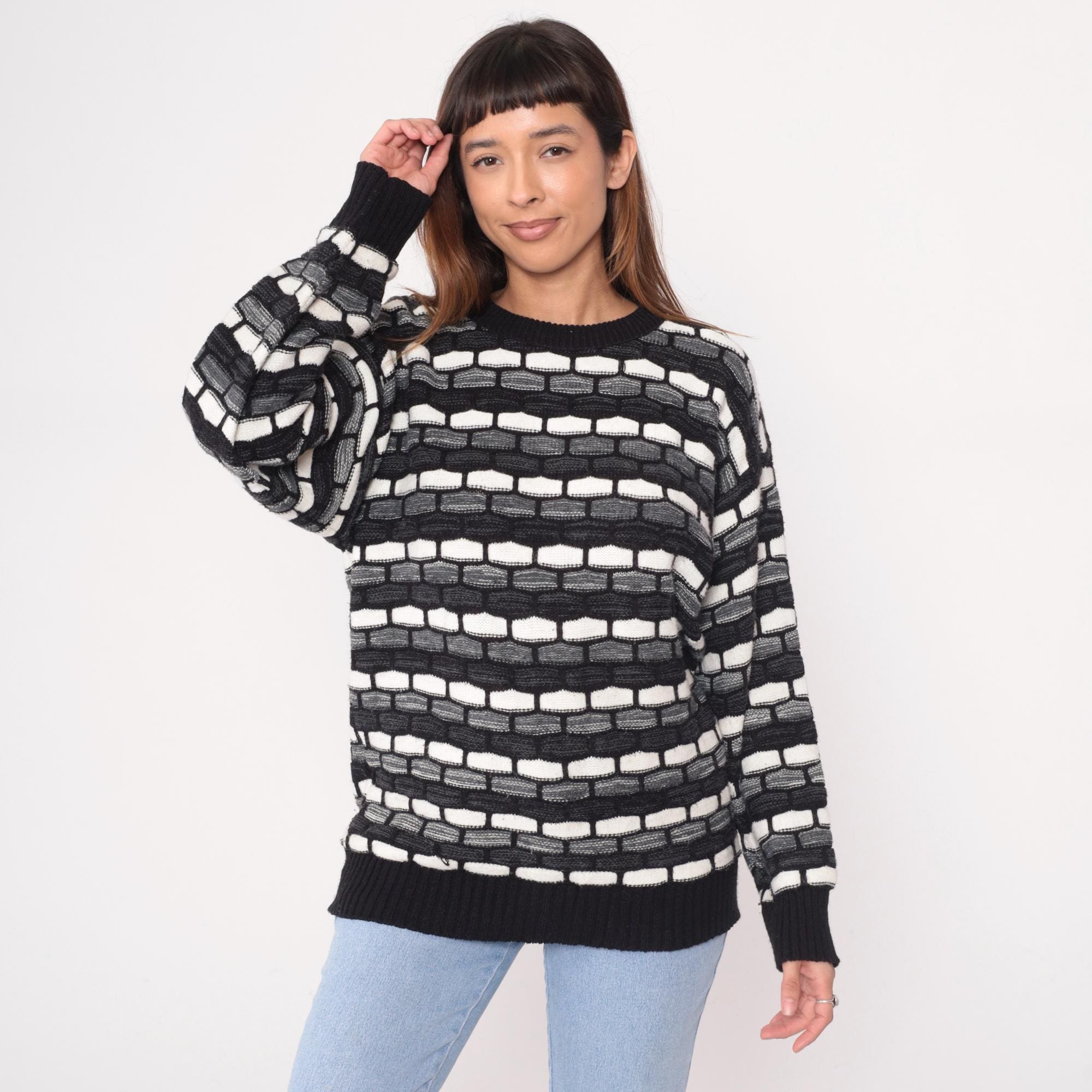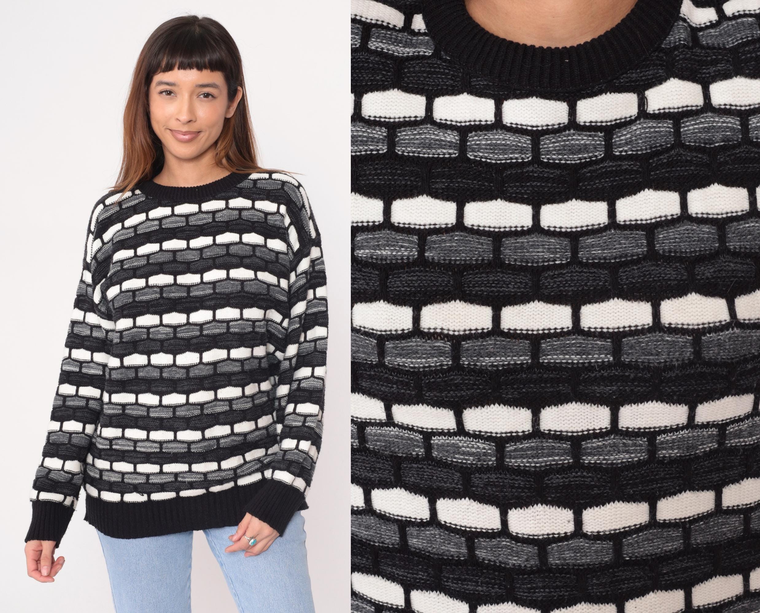 90s black, white, and gray geometric sweater from Checkpoint with horizontal brick pattern rows alternating across the knit. Crew neckline, long sleeves, ribbed trim at collar, cuffs, and hem.