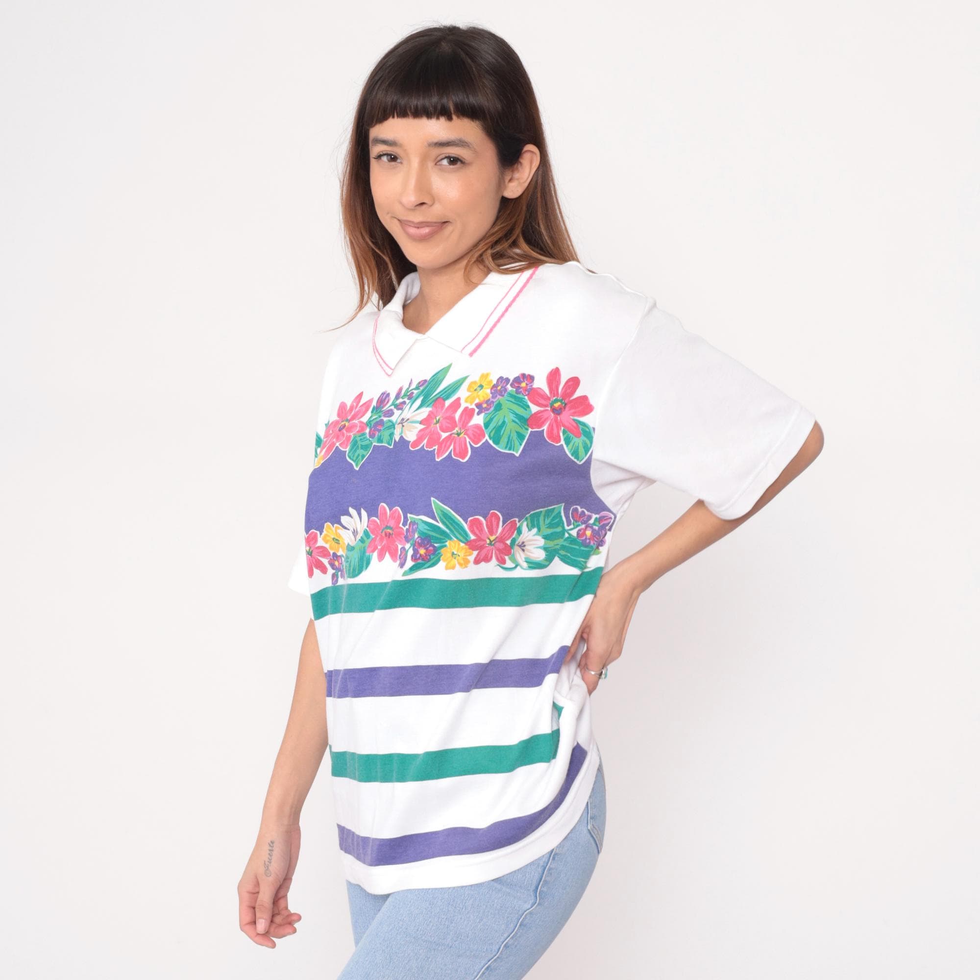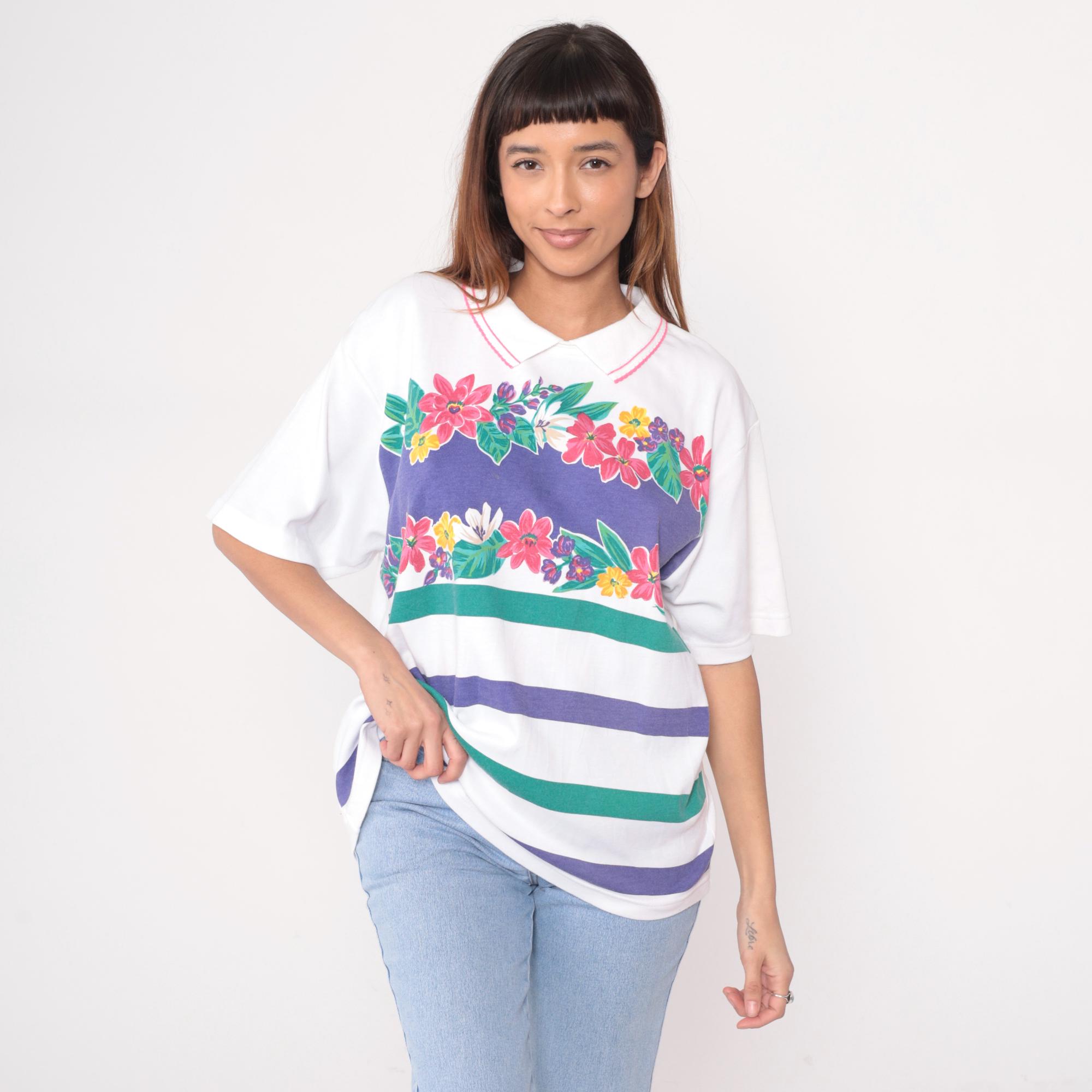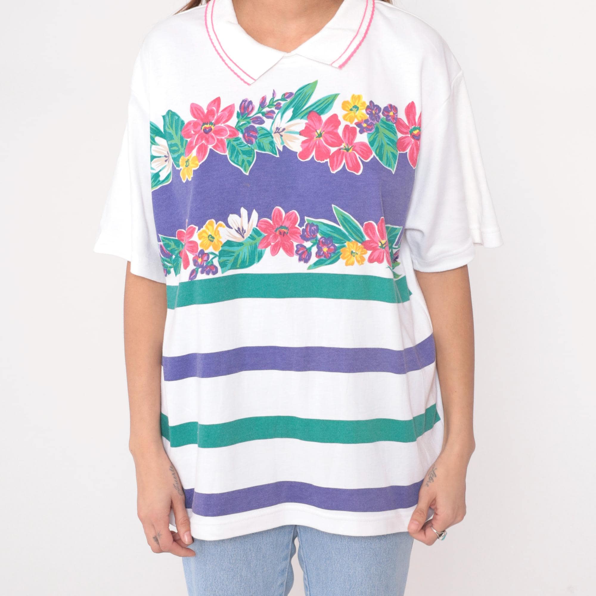 80s white polo shirt from Koret Francisca with pink striped collar trim and floral garland print across the chest. Pink, purple, yellow, and white flowers with green leaves above horizontal purple and green stripes. Short sleeves.