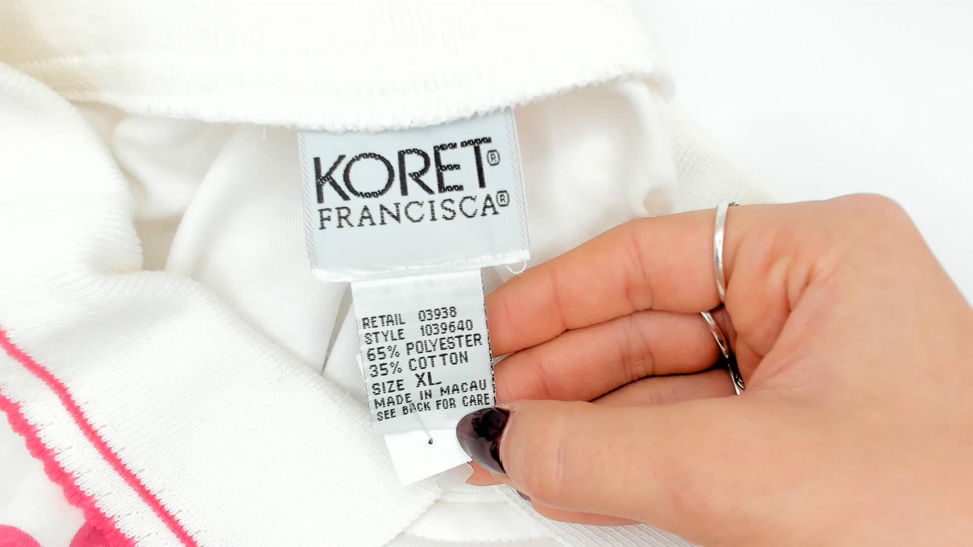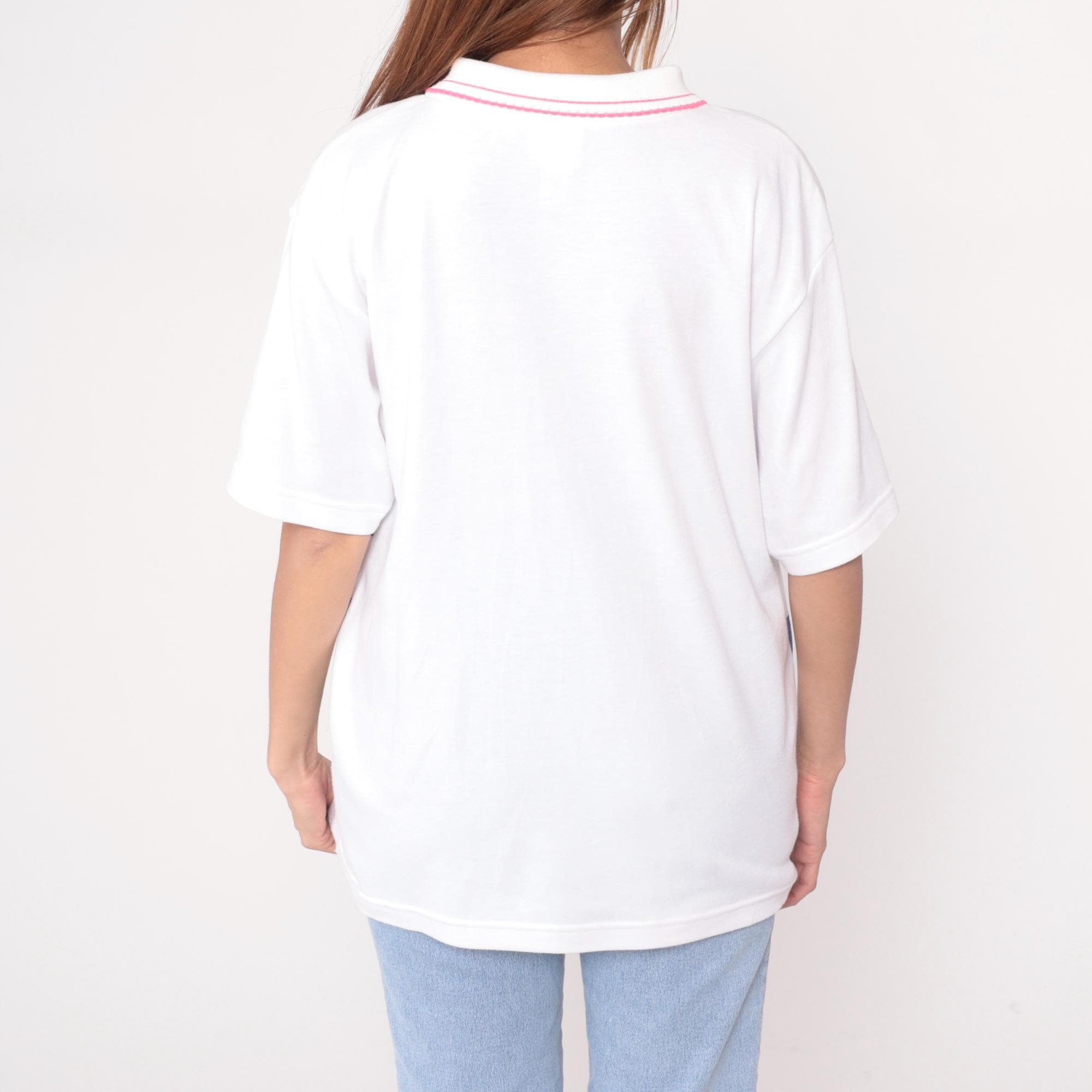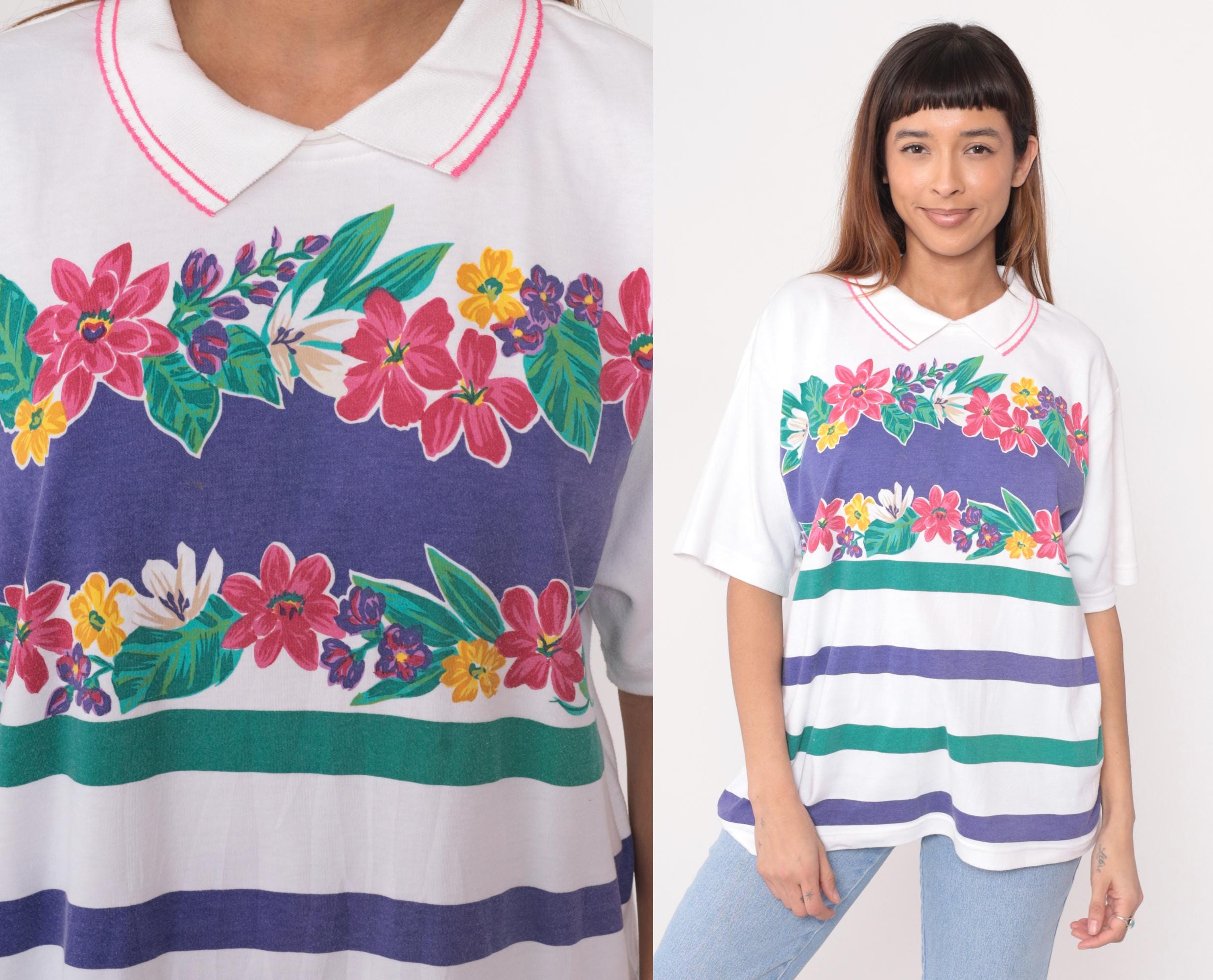 80s white polo shirt from Koret Francisca with pink striped collar trim and floral garland print across the chest. Pink, purple, yellow, and white flowers with green leaves above horizontal purple and green stripes. Short sleeves.