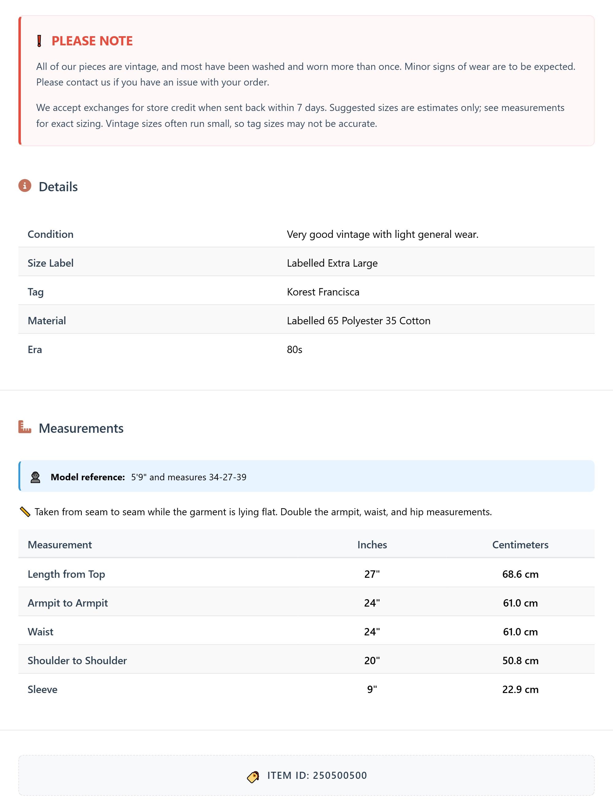 All of our pieces are vintage, and most have been washed and worn more than once. Minor signs of wear are to be expected. Please contact us if you have an issue with your order. We accept exchanges for store credit when sent back within 7 days.