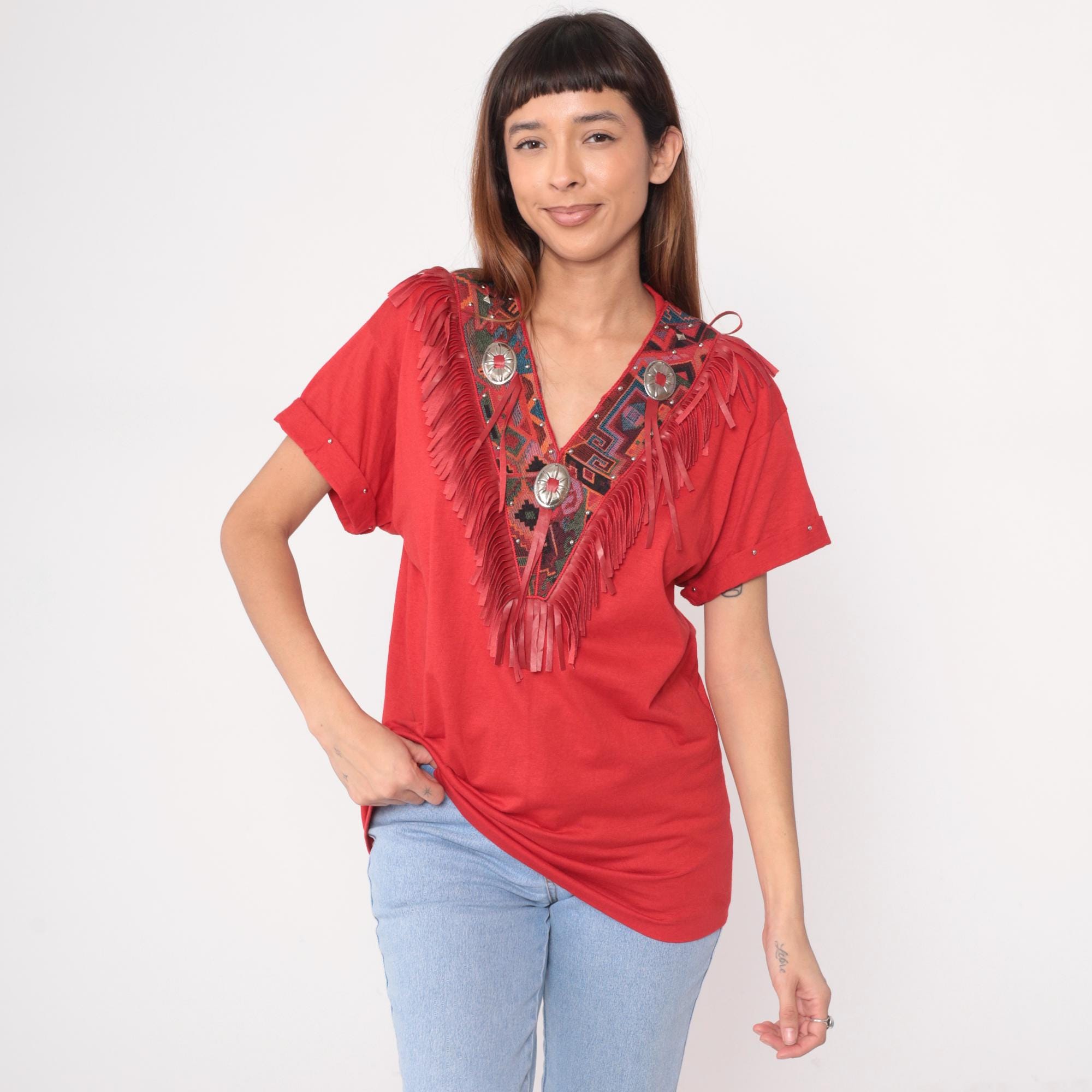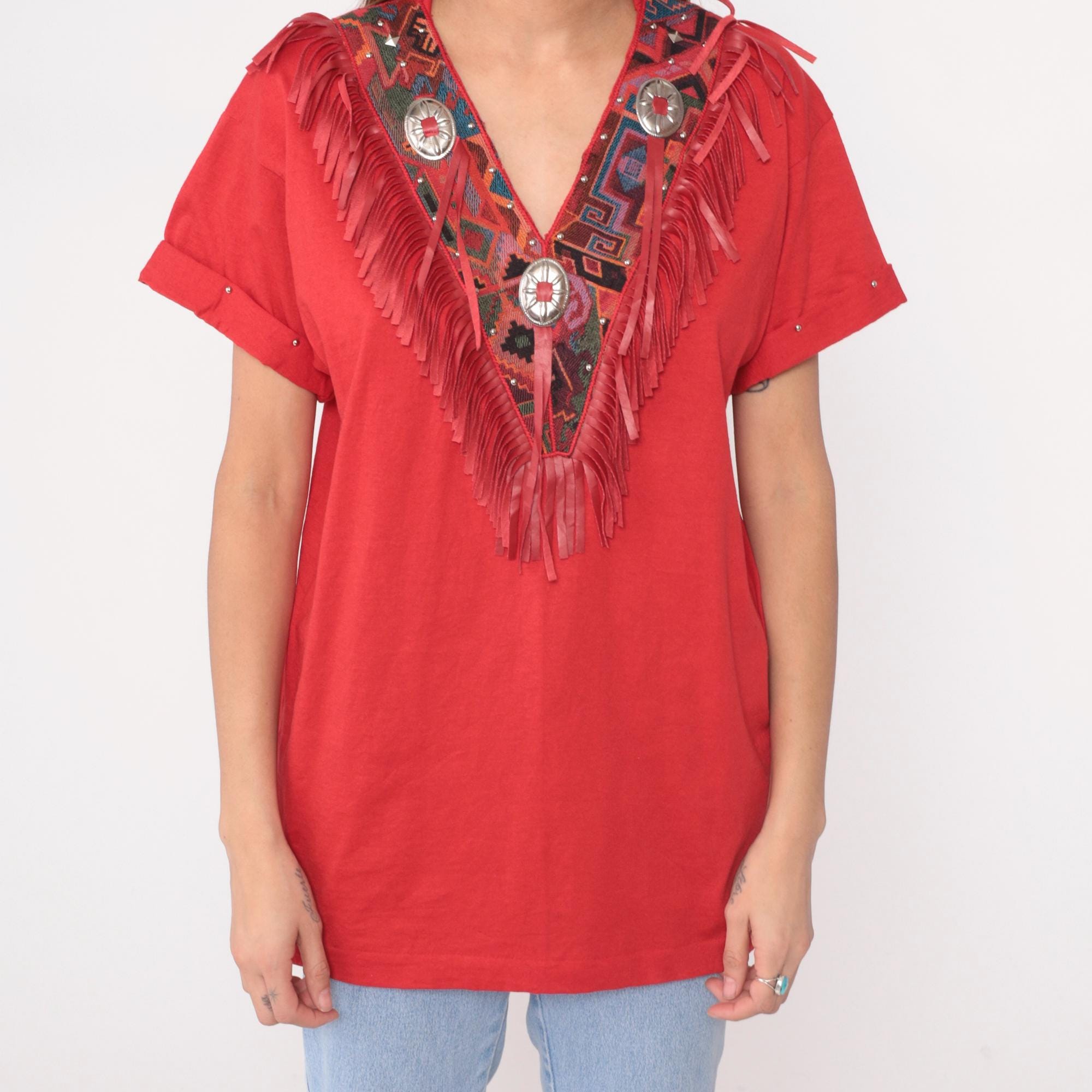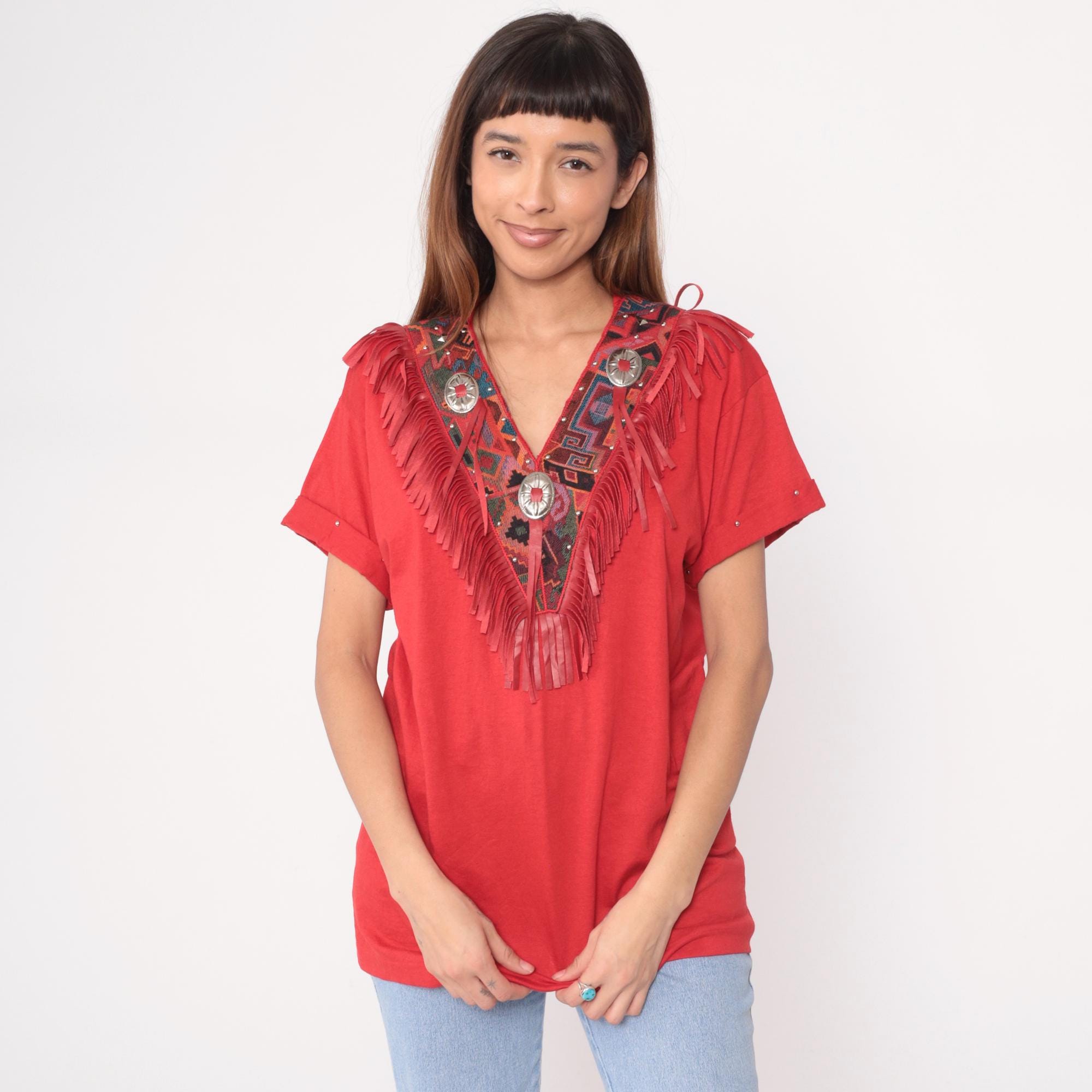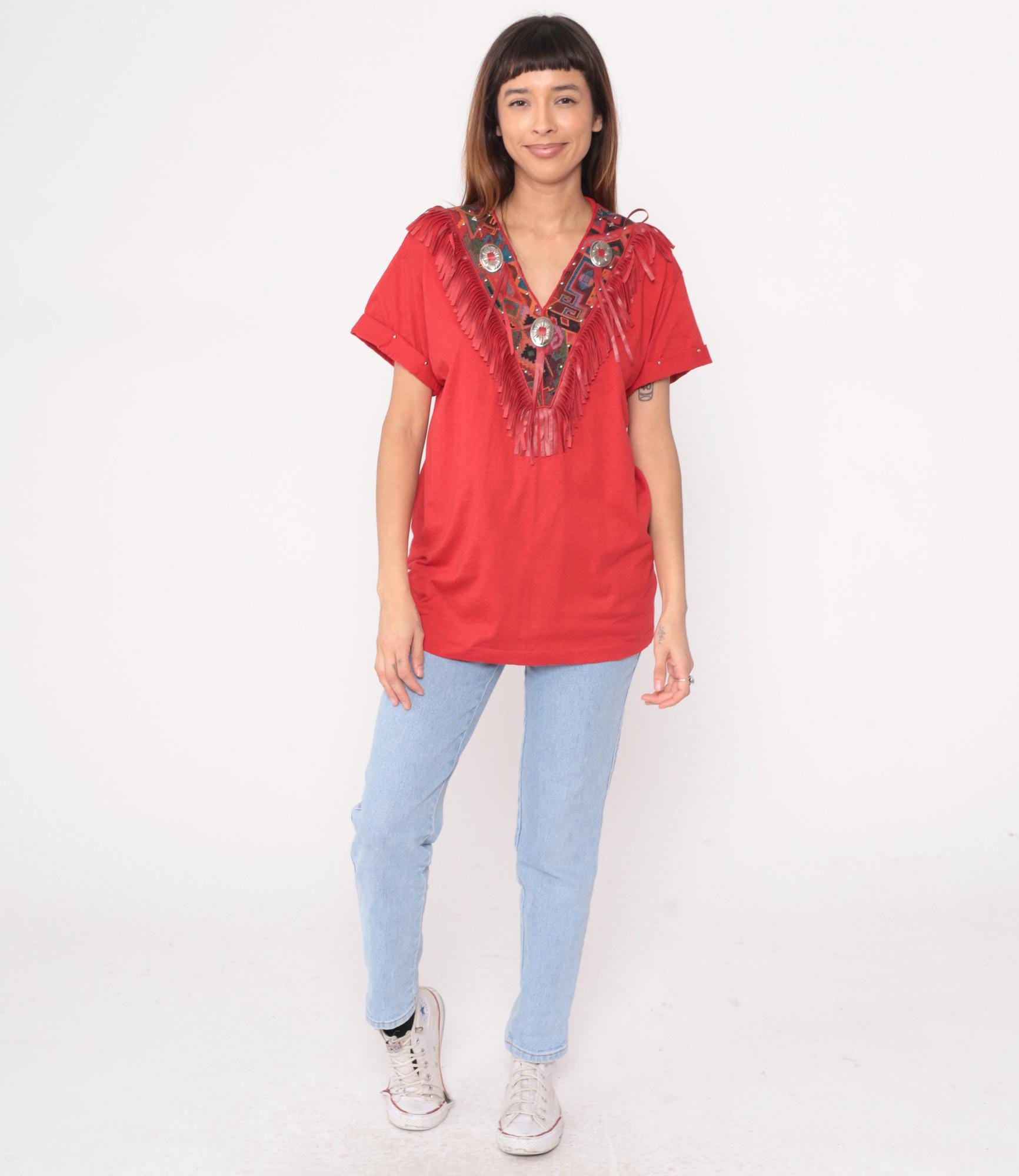 90s red t-shirt from Joanie W. with Native American-inspired geometric woven trim at V-neckline, leather fringe detail, and three silver concho embellishments on the yoke. Short sleeves with rolled cuffs and small silver embellishments.