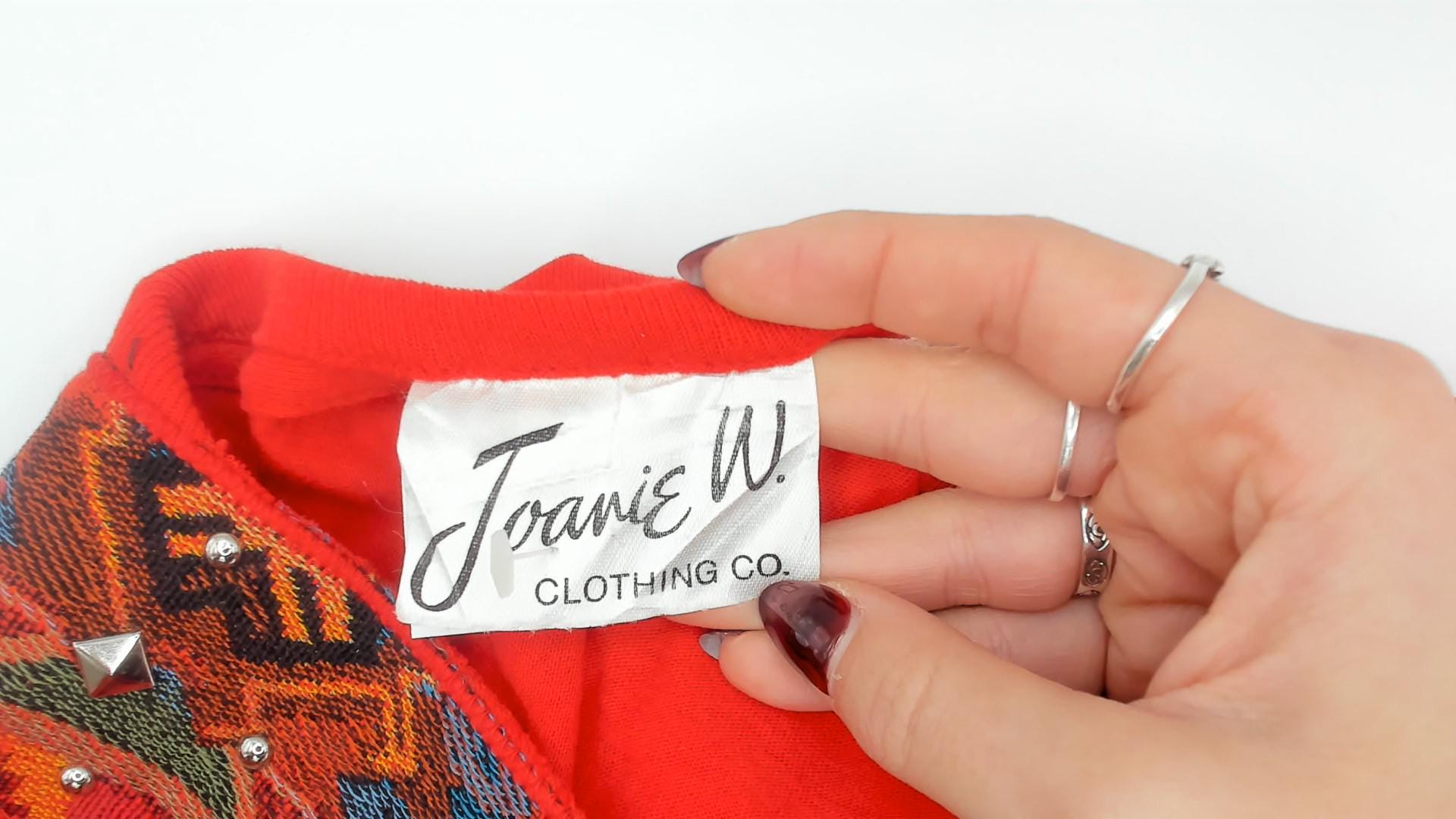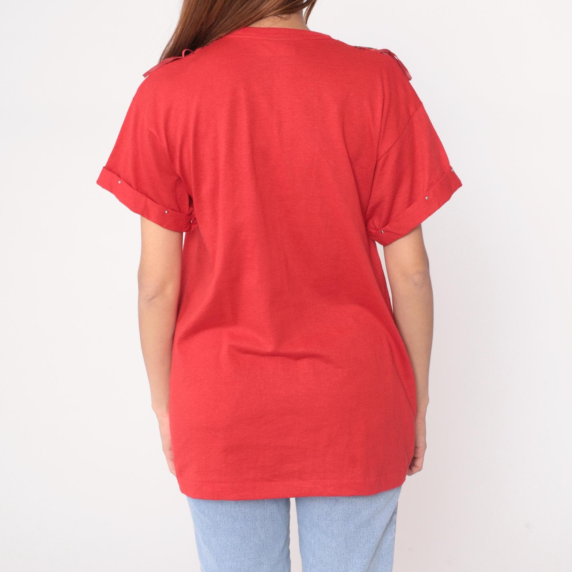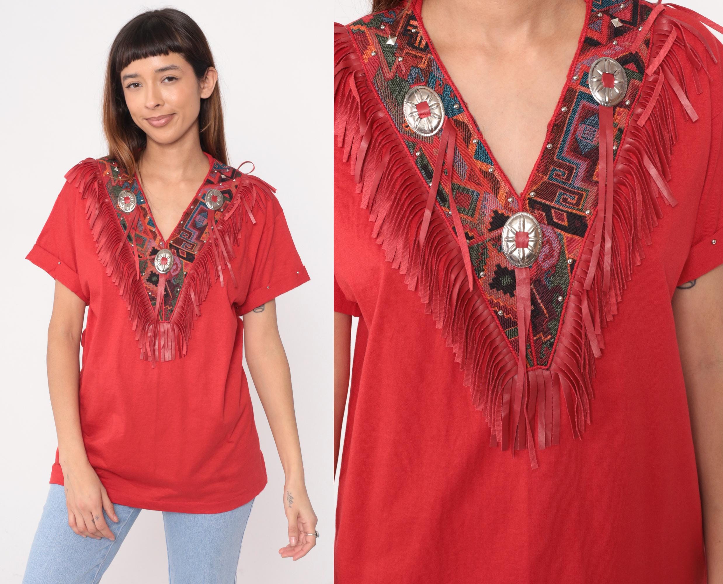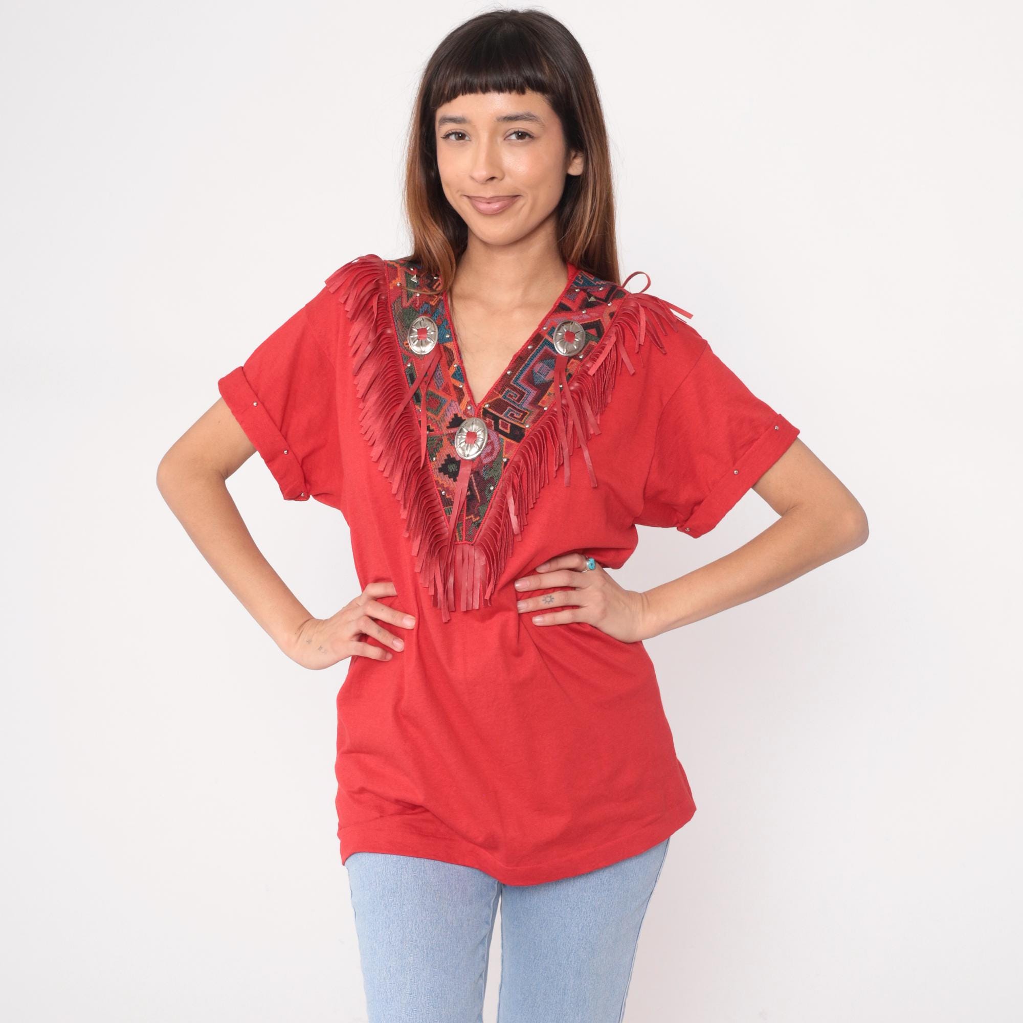 90s red t-shirt from Joanie W. with Native American-inspired geometric woven trim at V-neckline, leather fringe detail, and three silver concho embellishments on the yoke. Short sleeves with rolled cuffs and small silver embellishments.