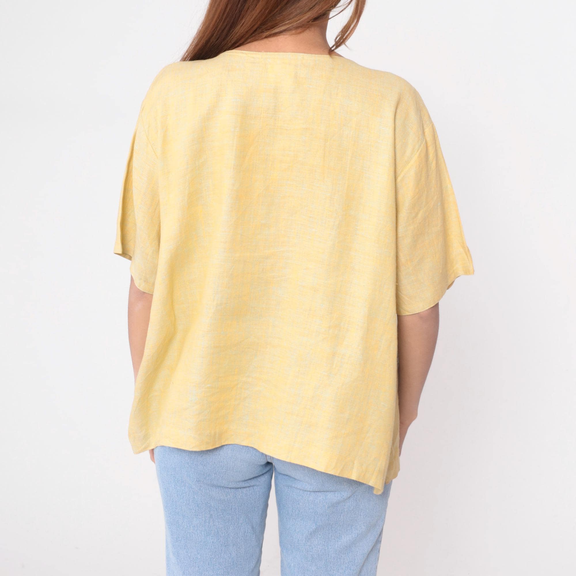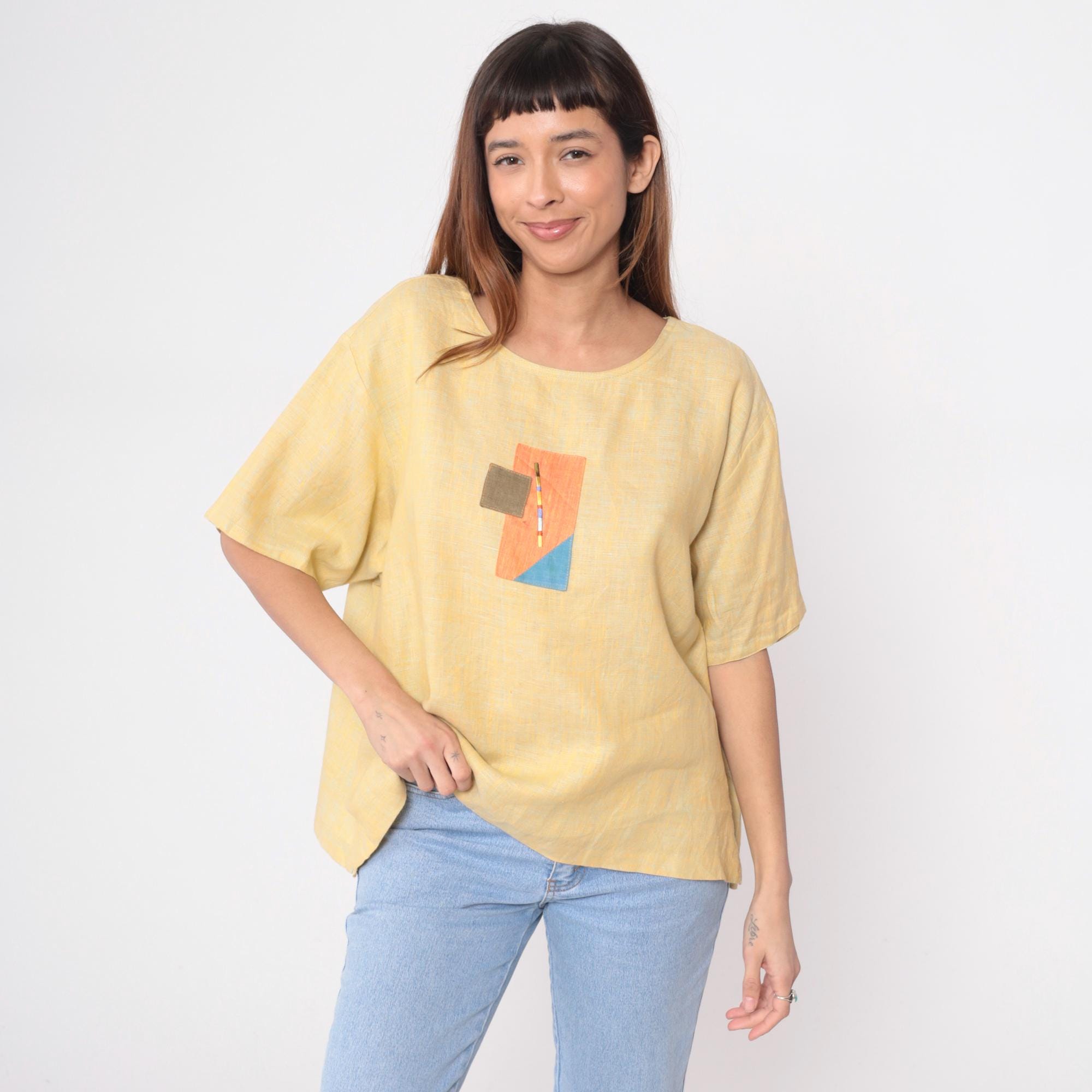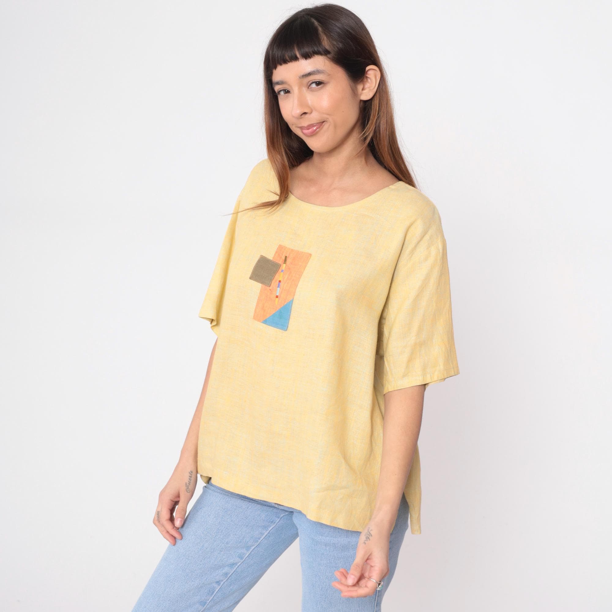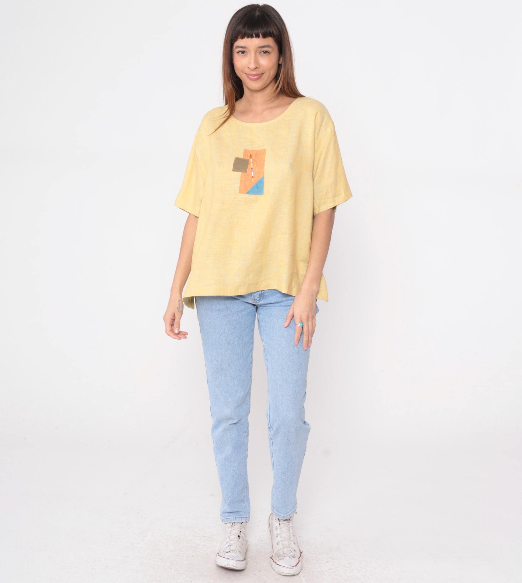 90s pale yellow linen top from Nino Wong with geometric appliqué design on the chest featuring a brown square, coral rectangle, blue triangle, and multicolored striped vertical element. Boxy oversized fit with short sleeves and round neckline.