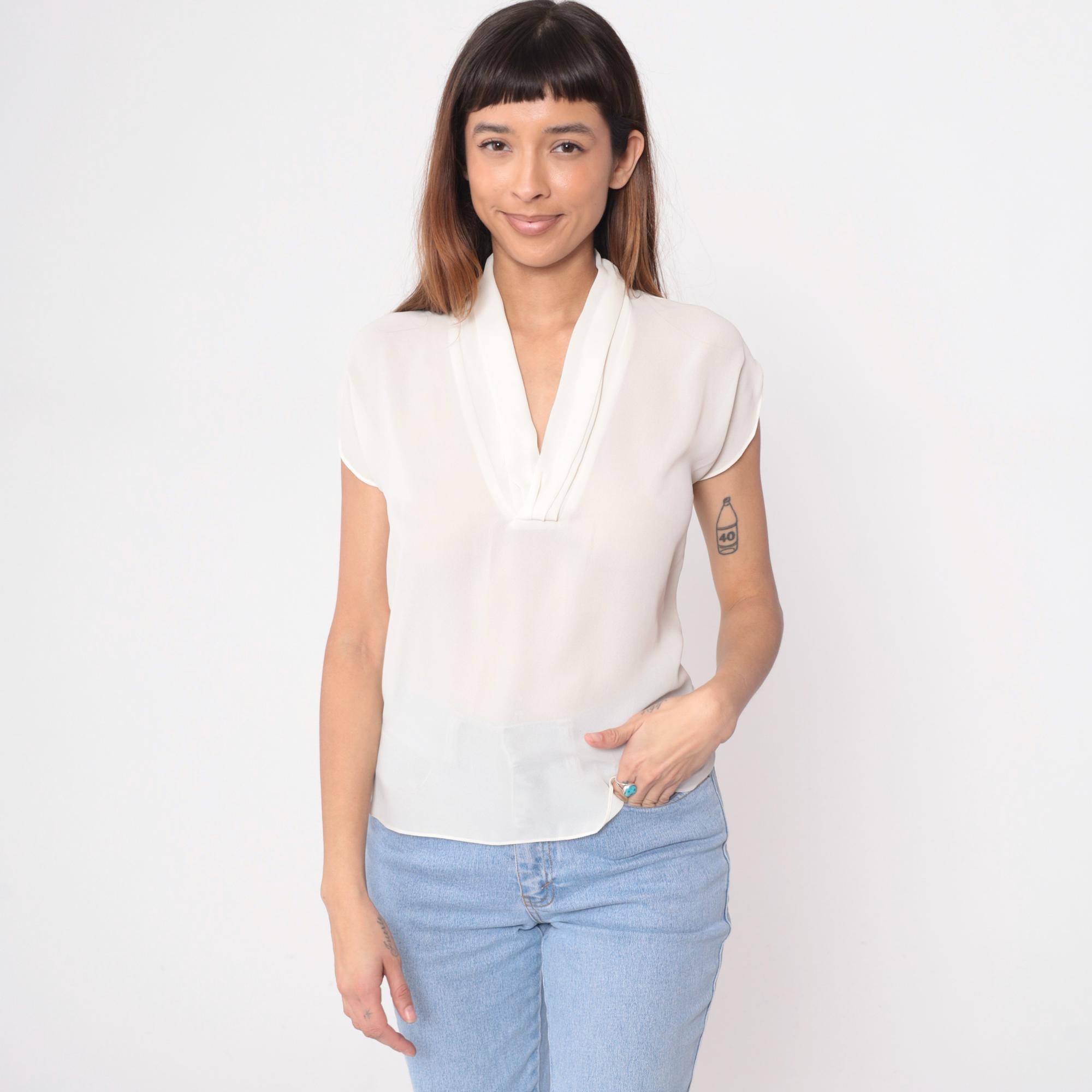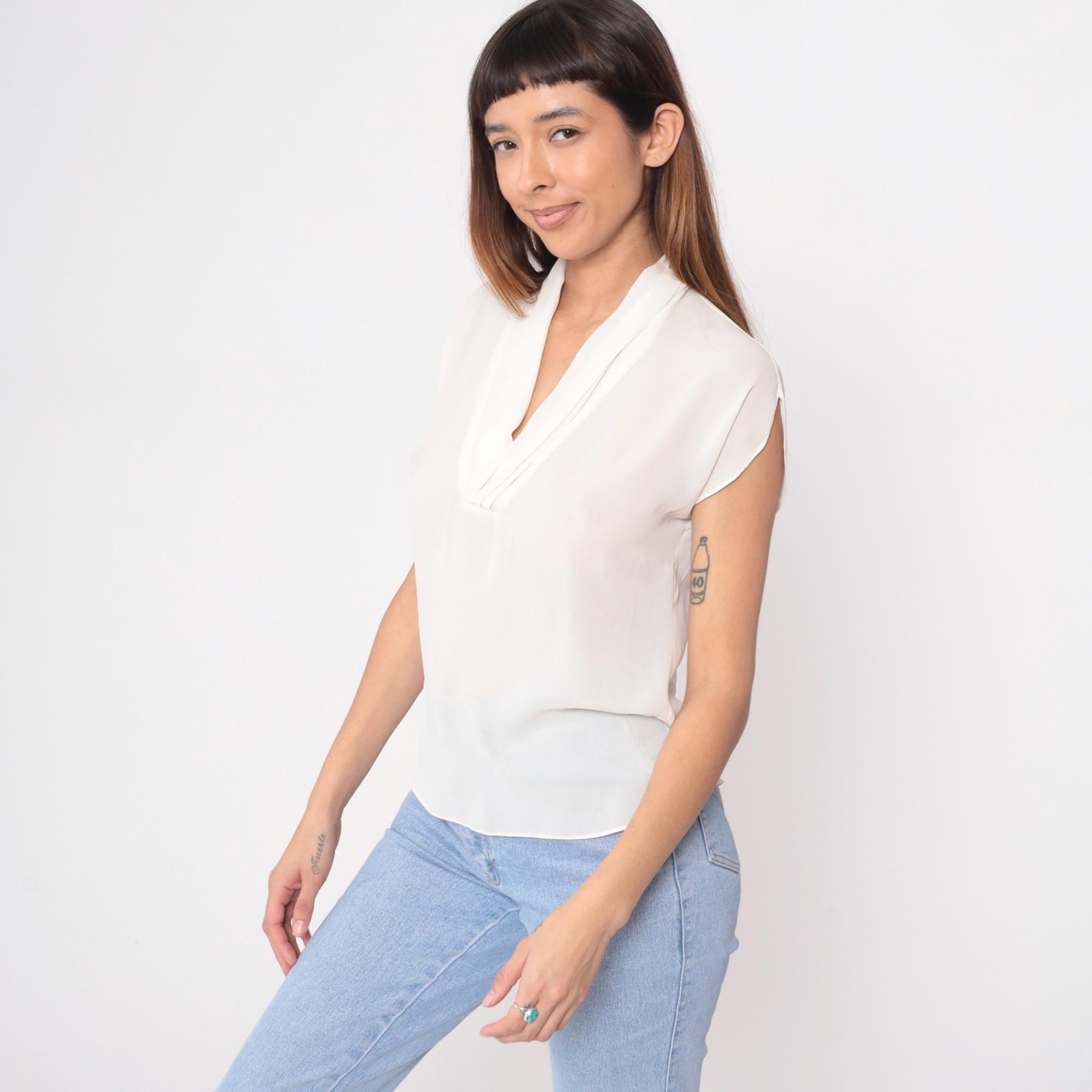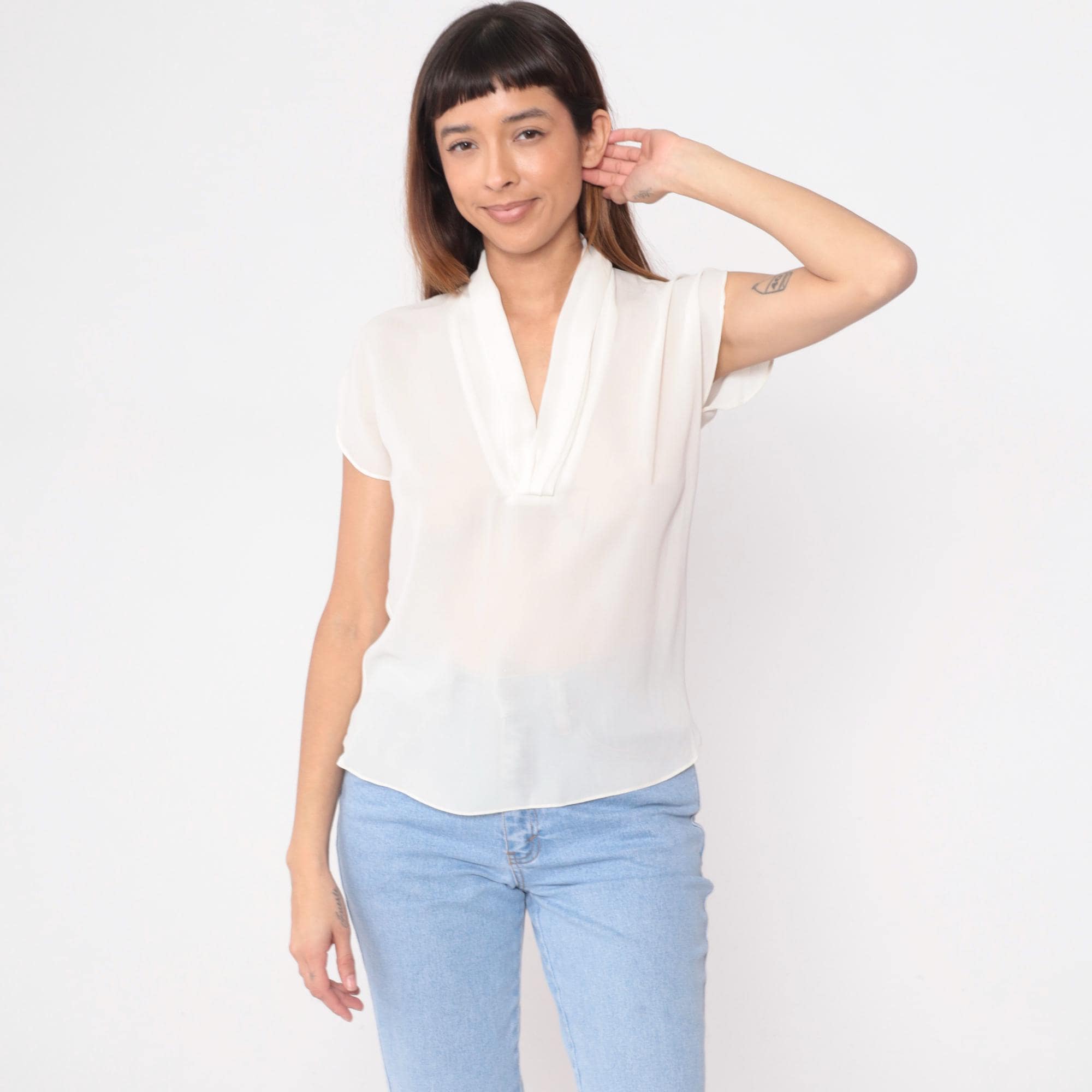 90s cream blouse with surplice v-neckline and shawl collar detail. Extended shoulder design with short cap sleeves. From Oui Petites.