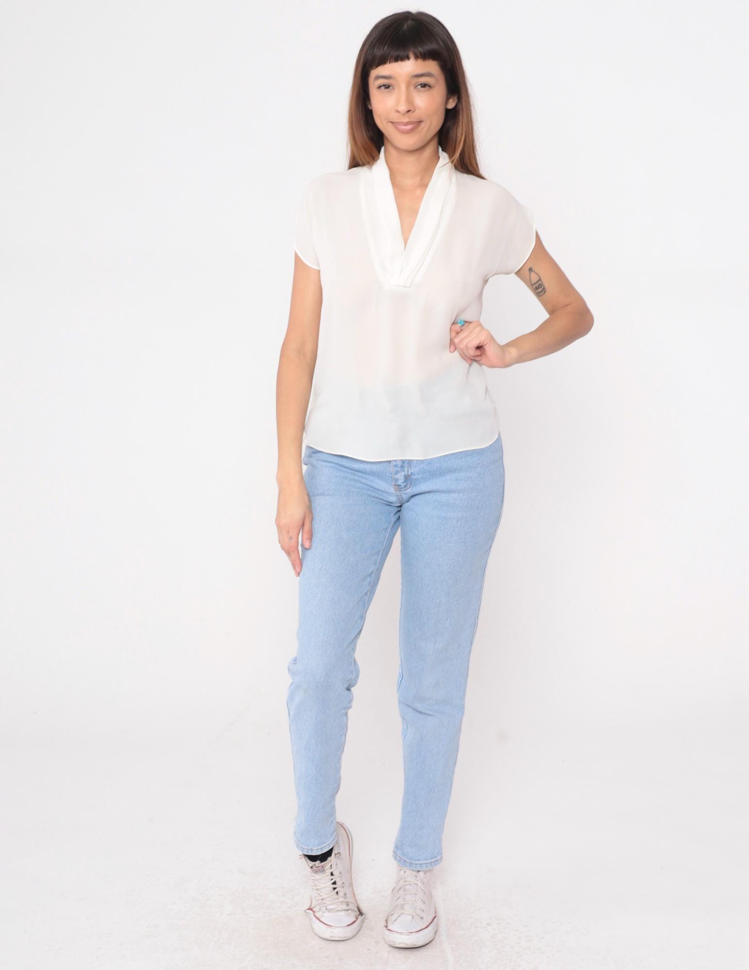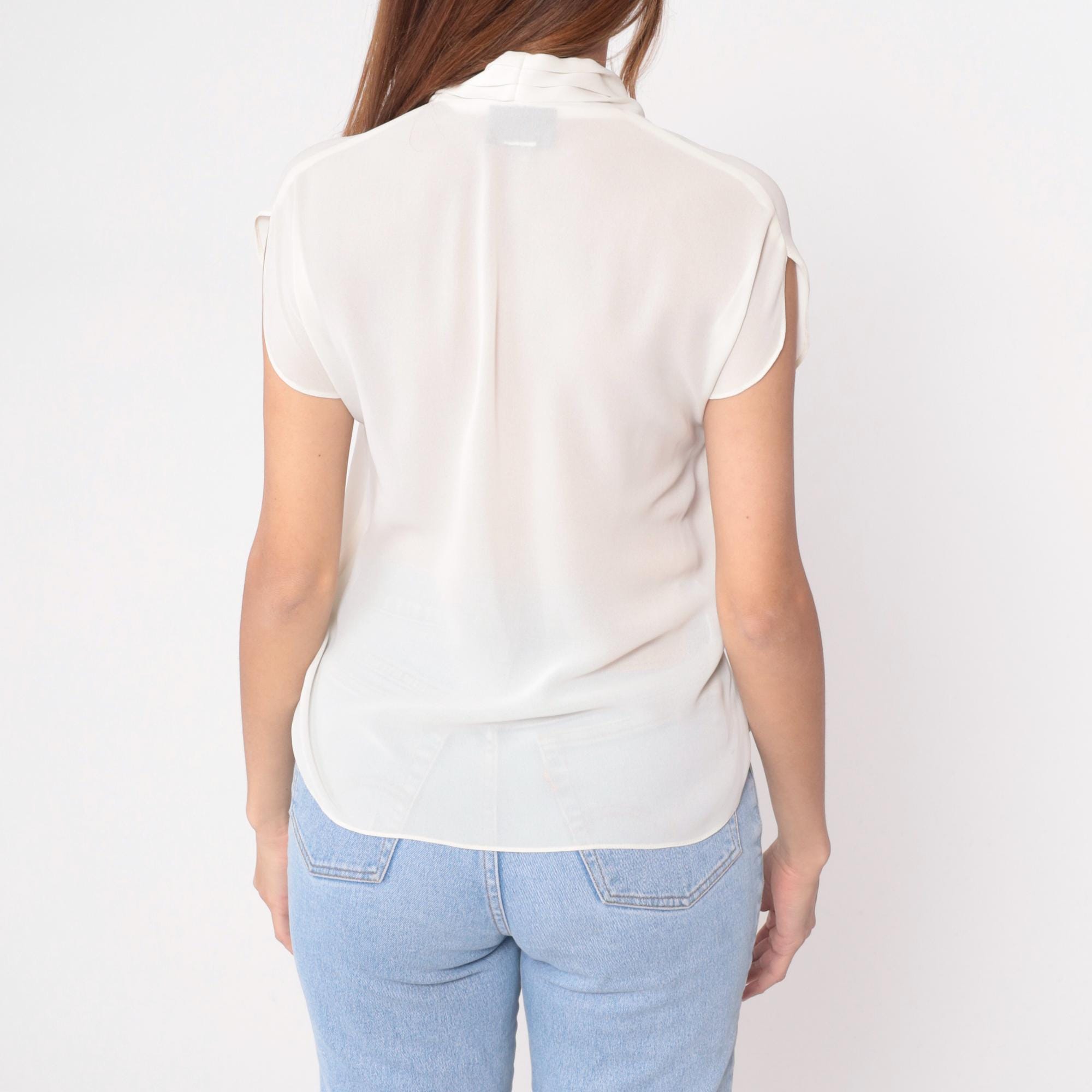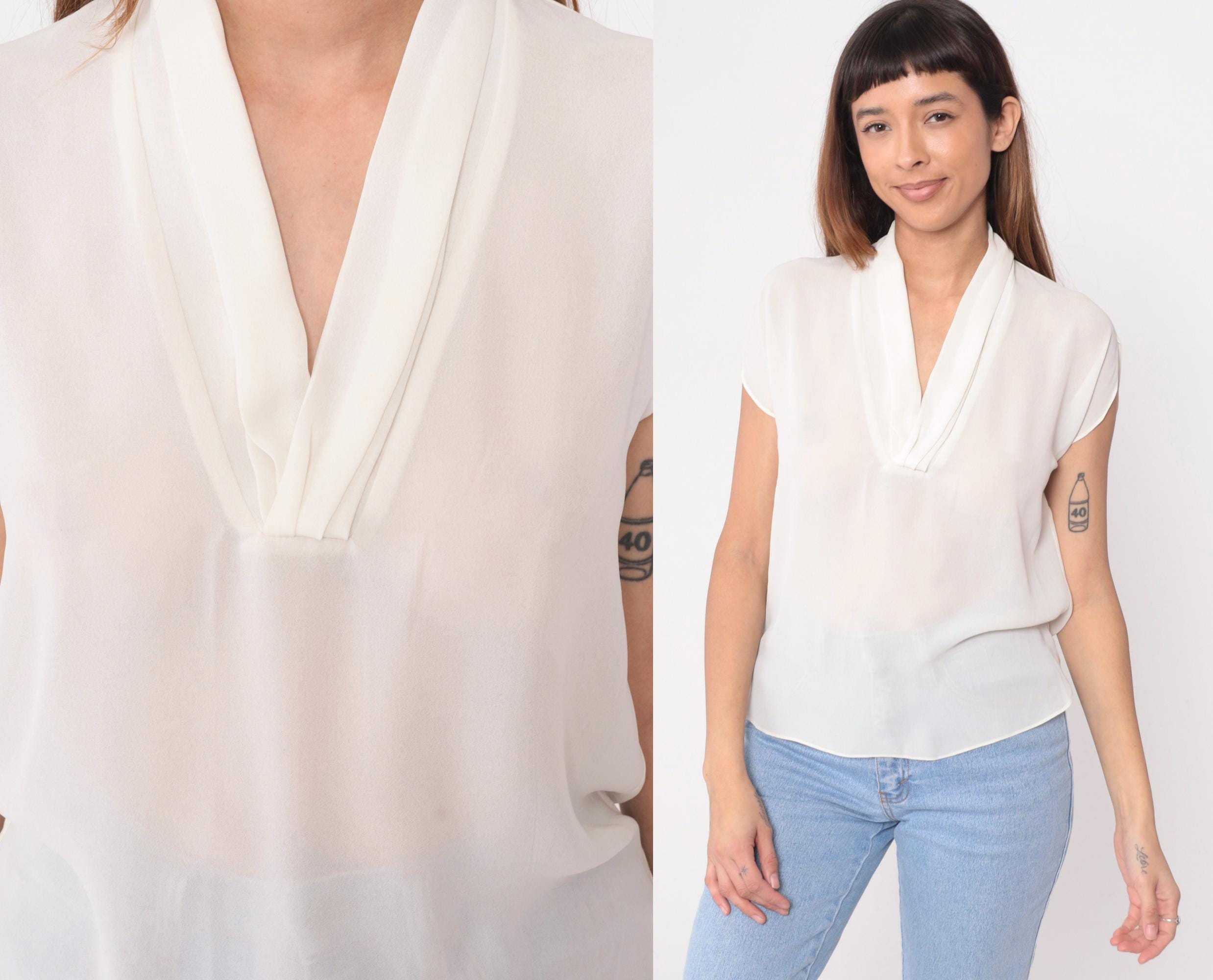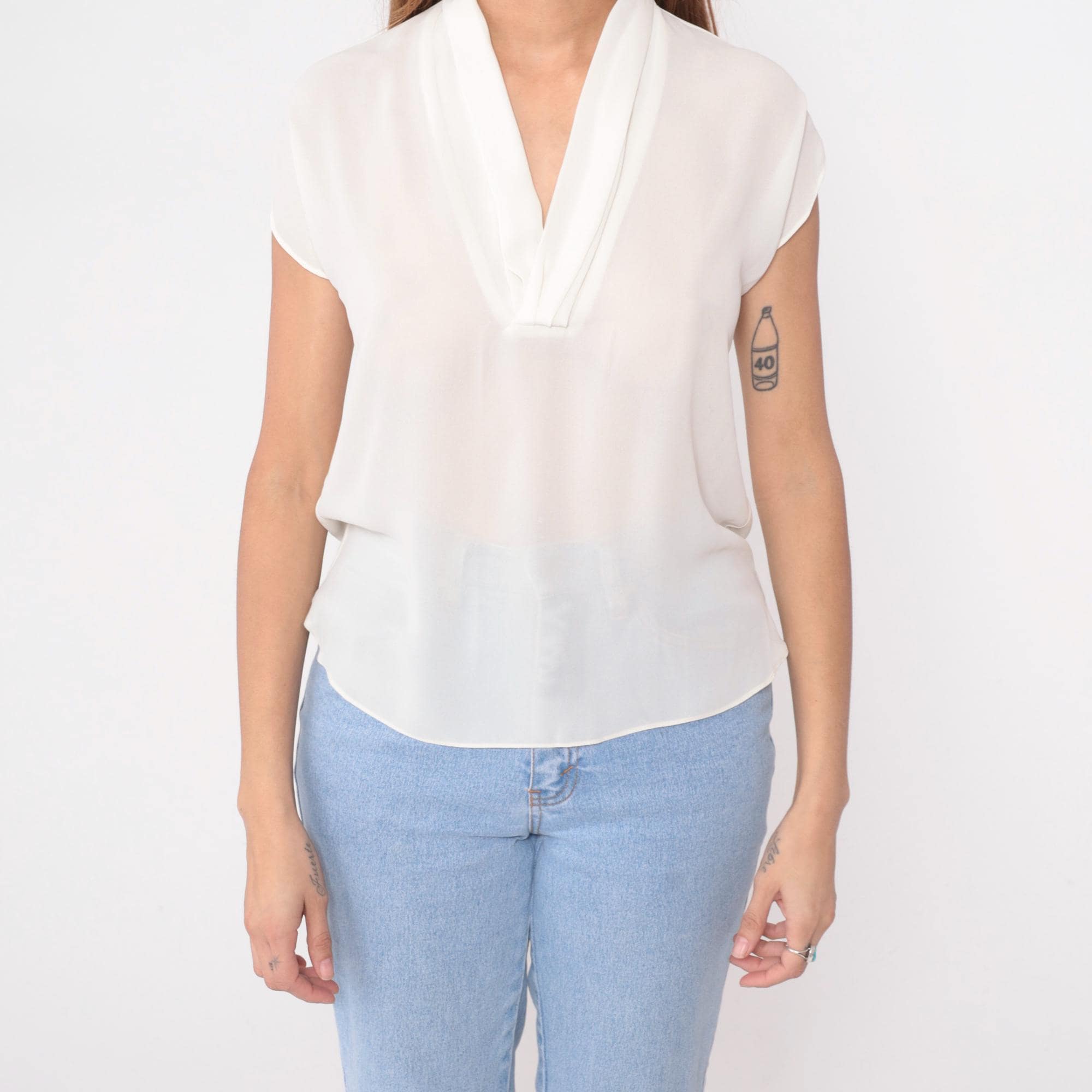 90s cream blouse with surplice v-neckline and shawl collar detail. Extended shoulder design with short cap sleeves. From Oui Petites.