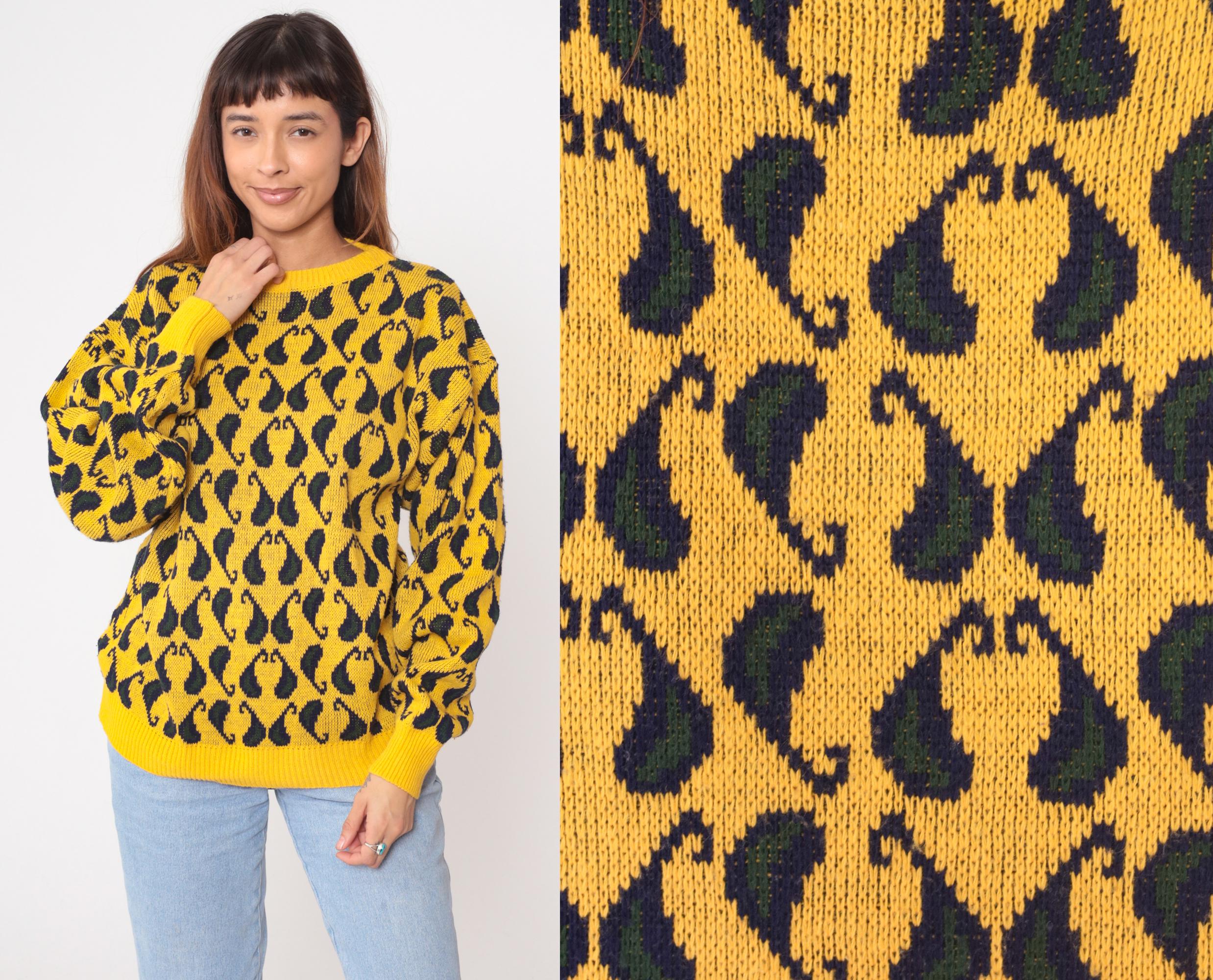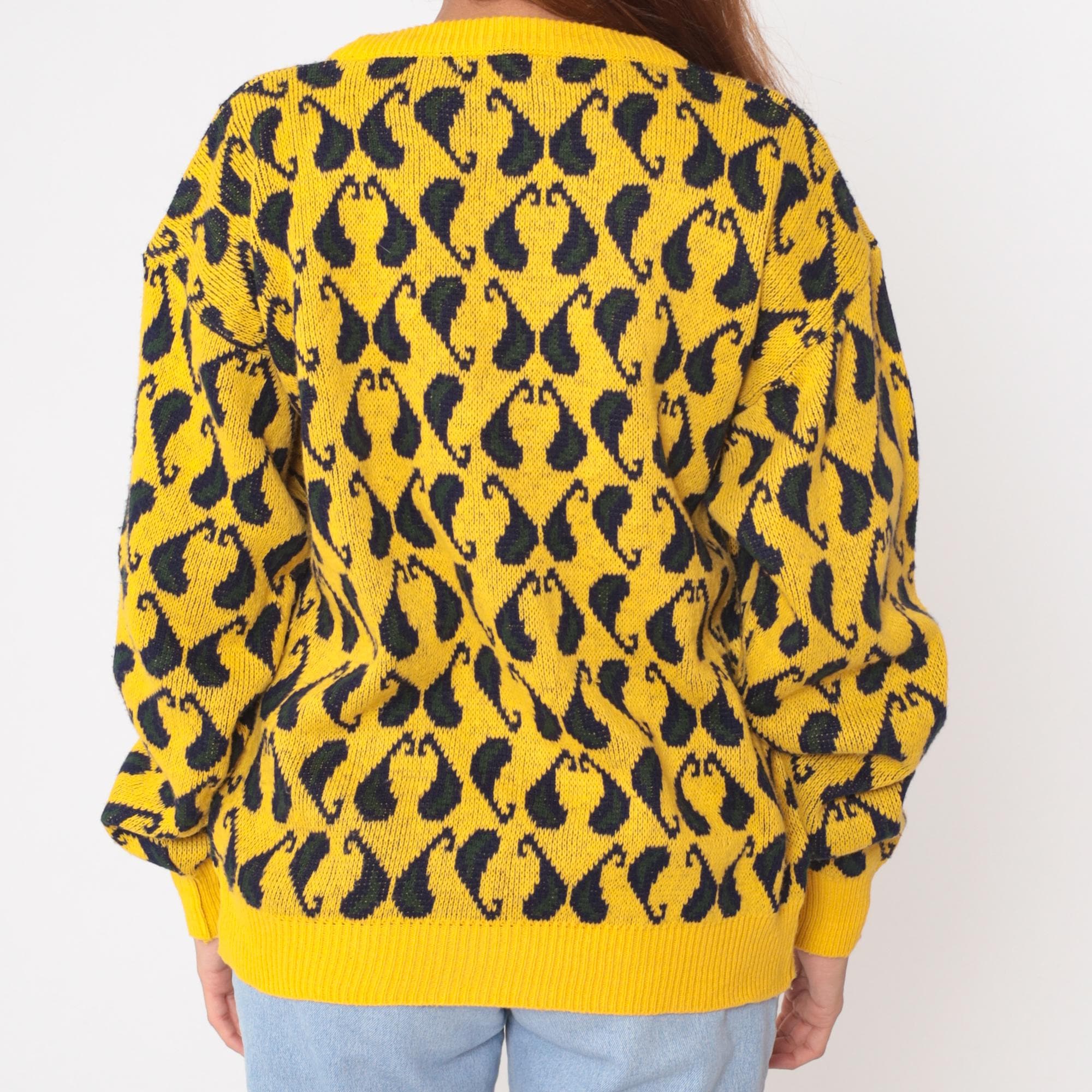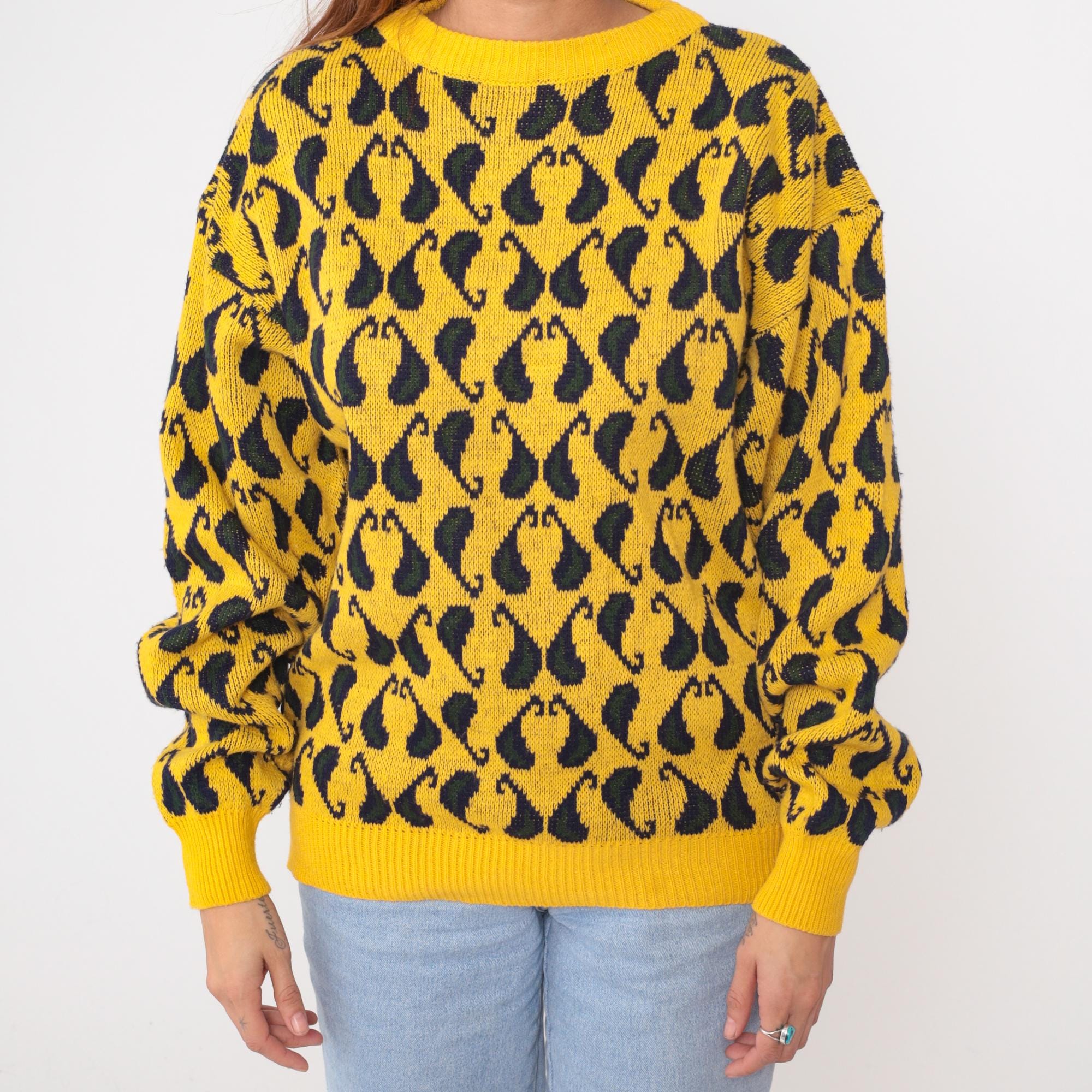 90s yellow and black paisley knit sweater with allover ikat-inspired pattern. Crew neckline, long sleeves, ribbed trim at collar, cuffs, and hem. Oversized fit. 85% acrylic, 15% wool.