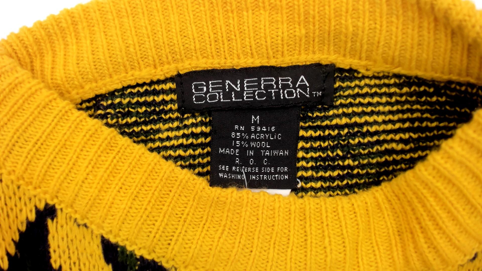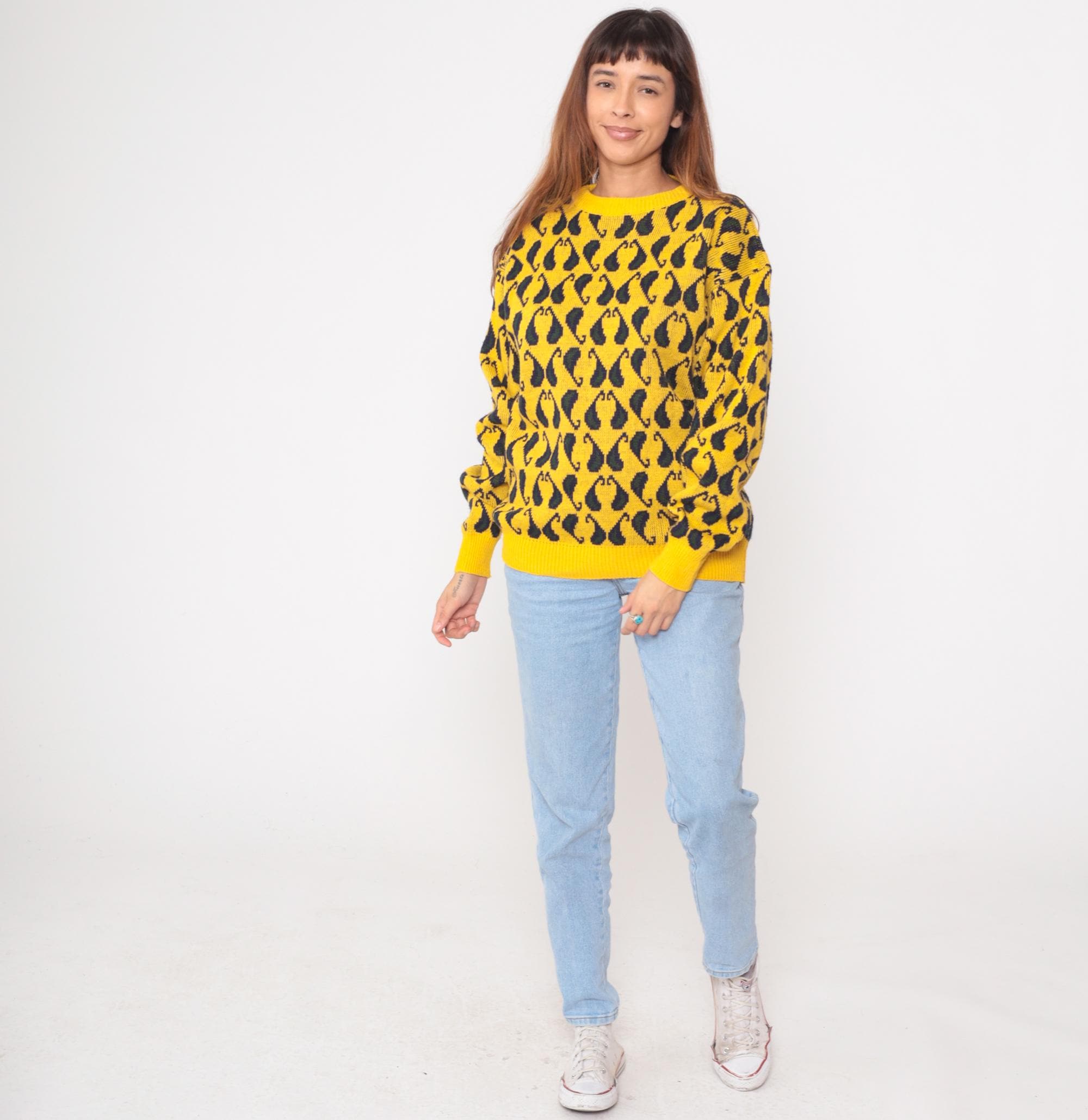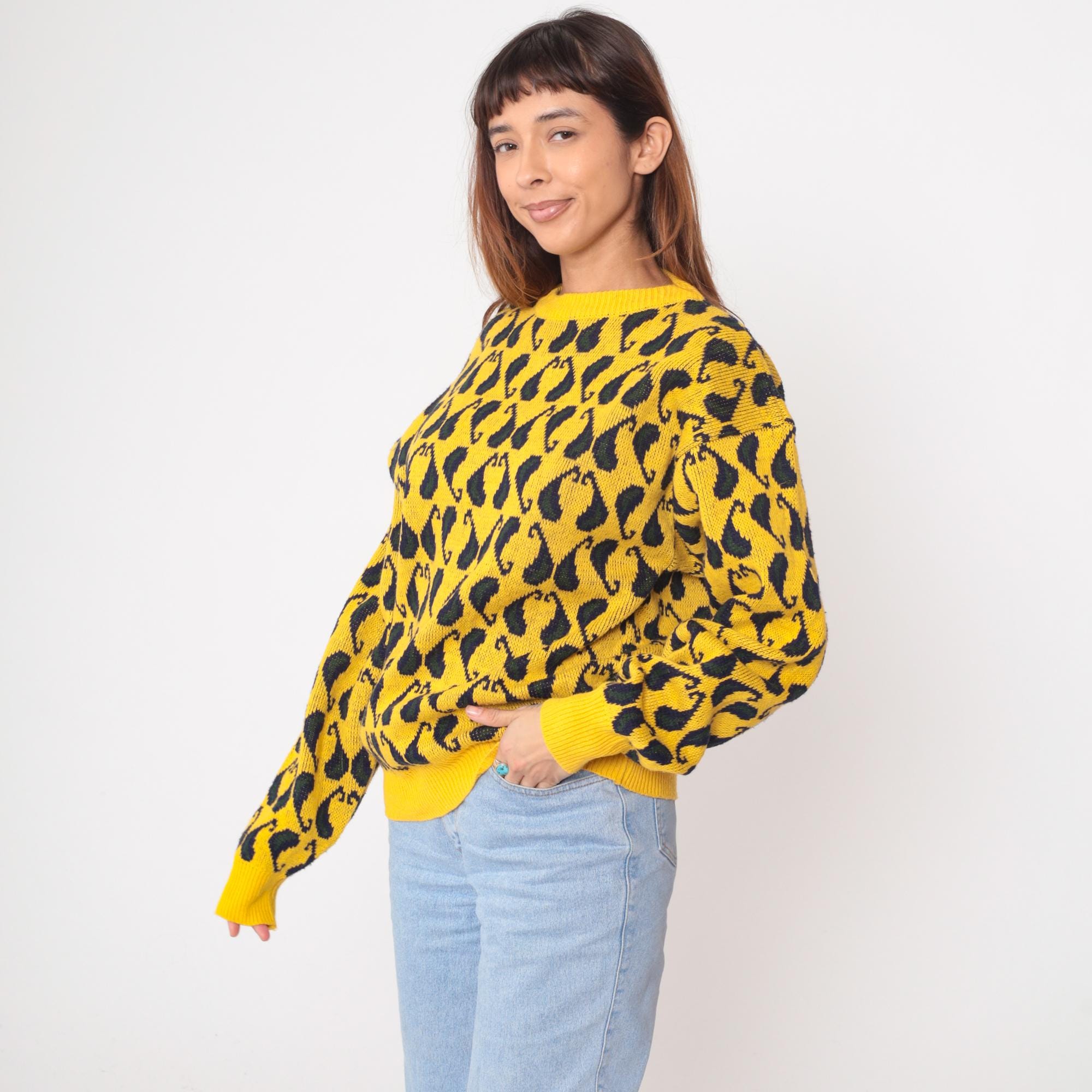 90s yellow and black paisley knit sweater with allover ikat-inspired pattern. Crew neckline, long sleeves, ribbed trim at collar, cuffs, and hem. Oversized fit. 85% acrylic, 15% wool.
