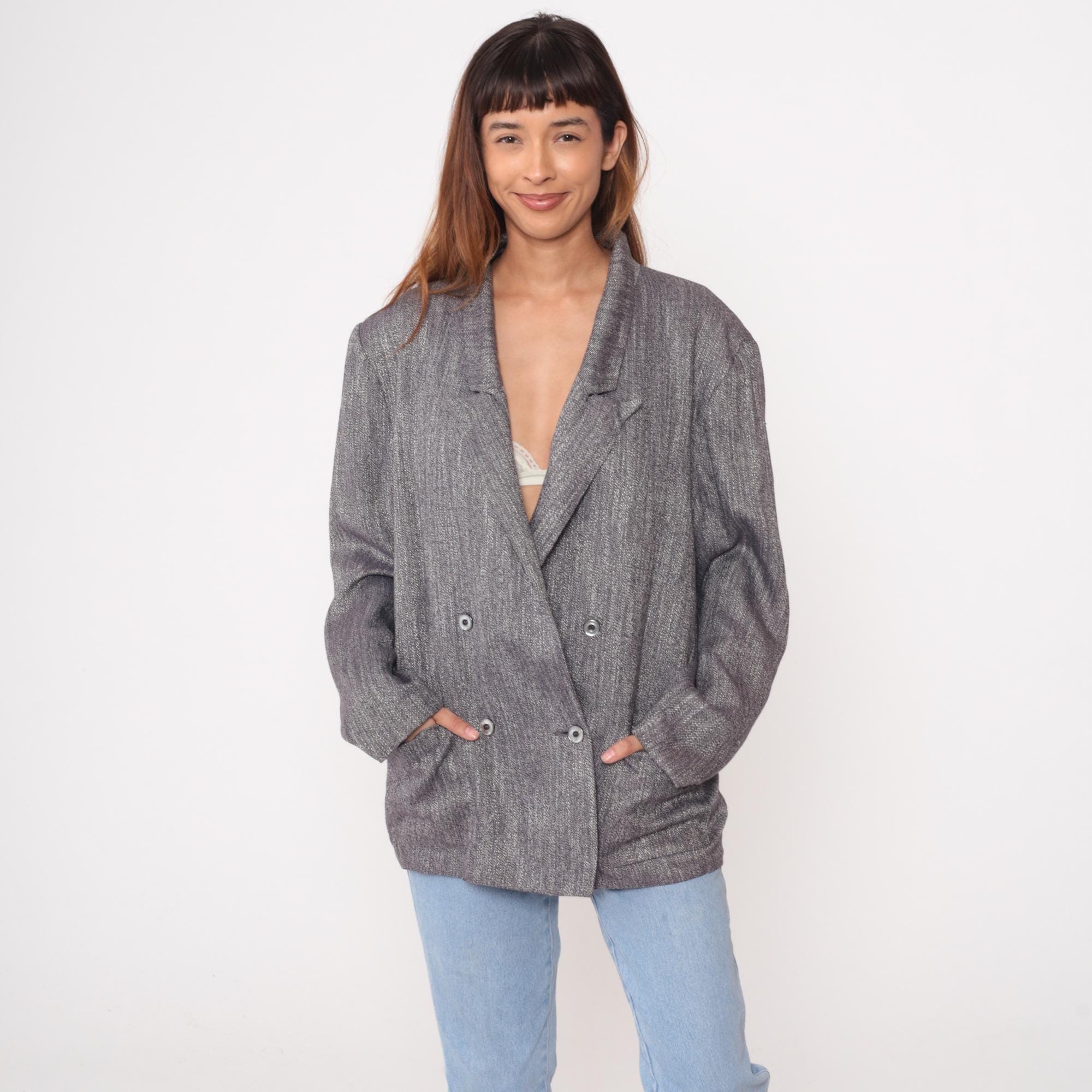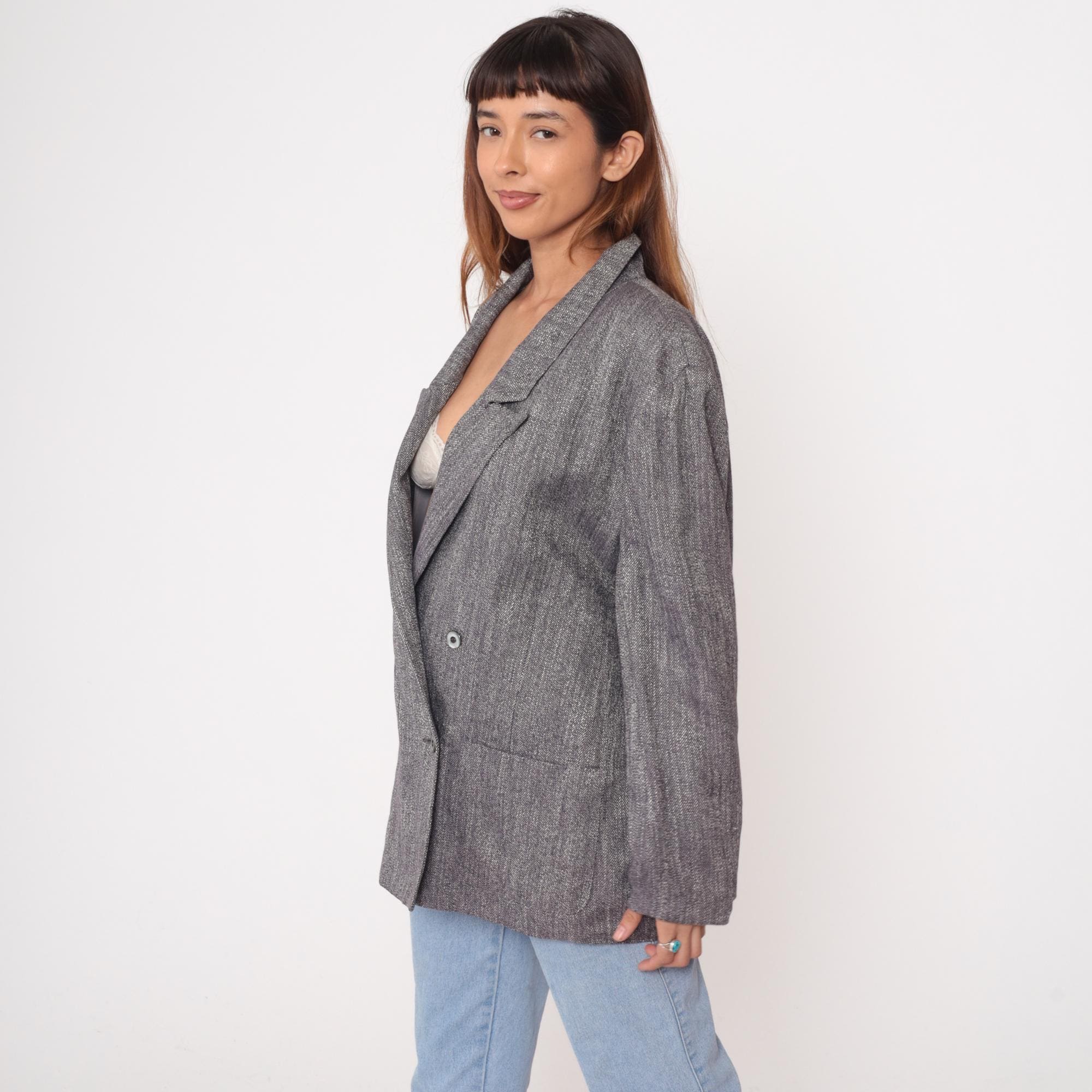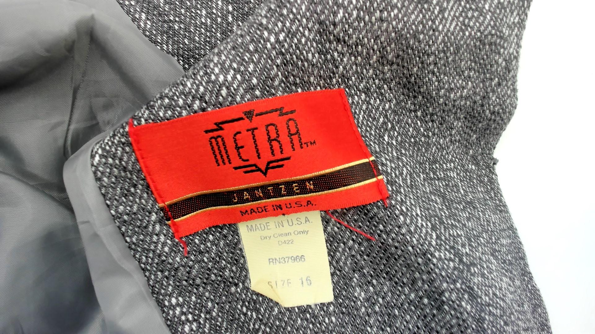 80s charcoal gray double-breasted blazer from metra by jantzen in textured salt and pepper woven fabric. Peak lapels, four button front closure, and front patch pockets.