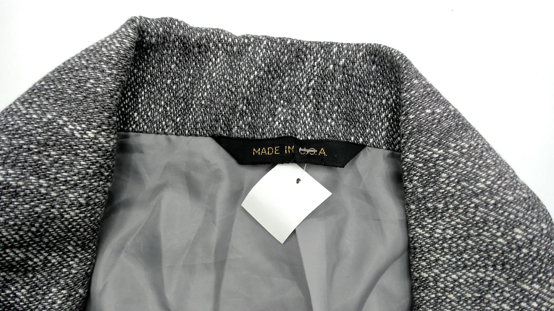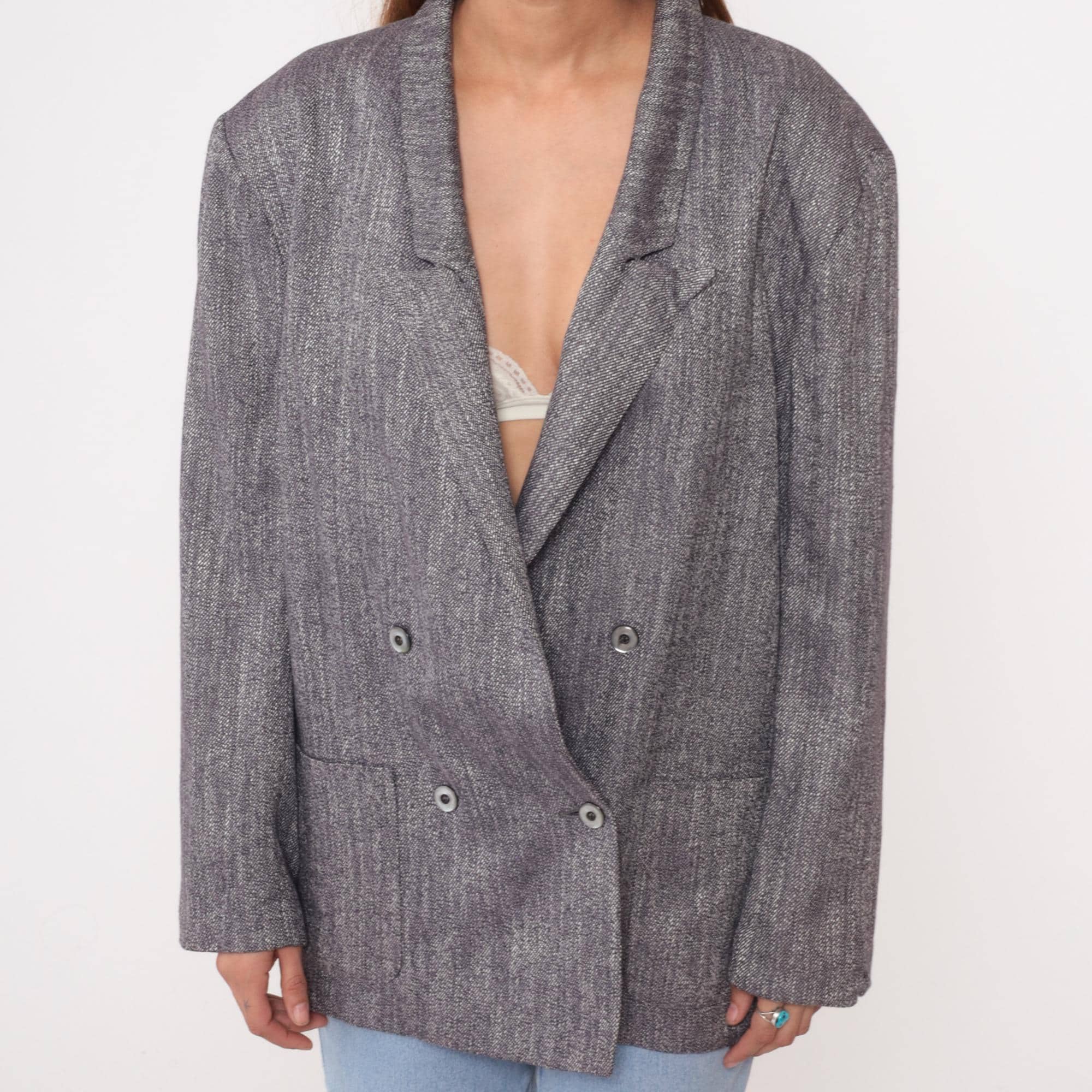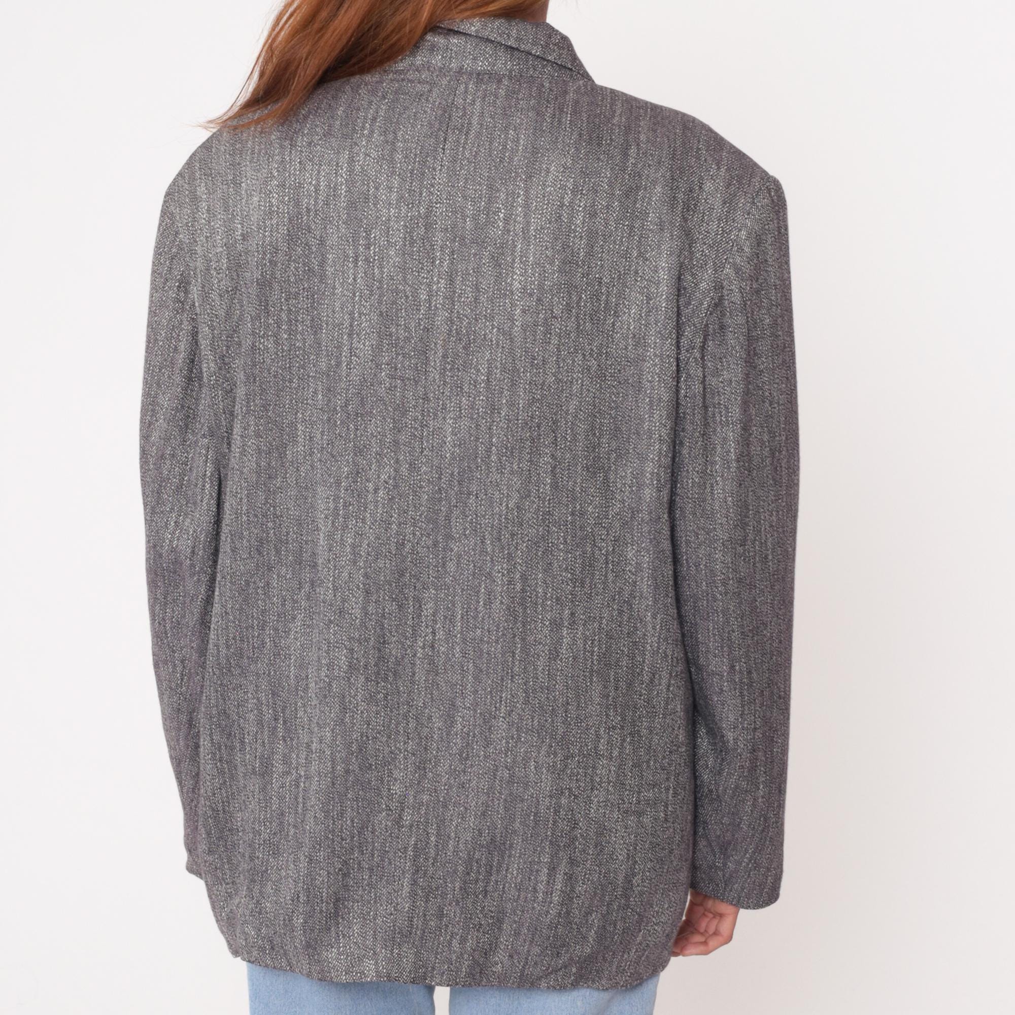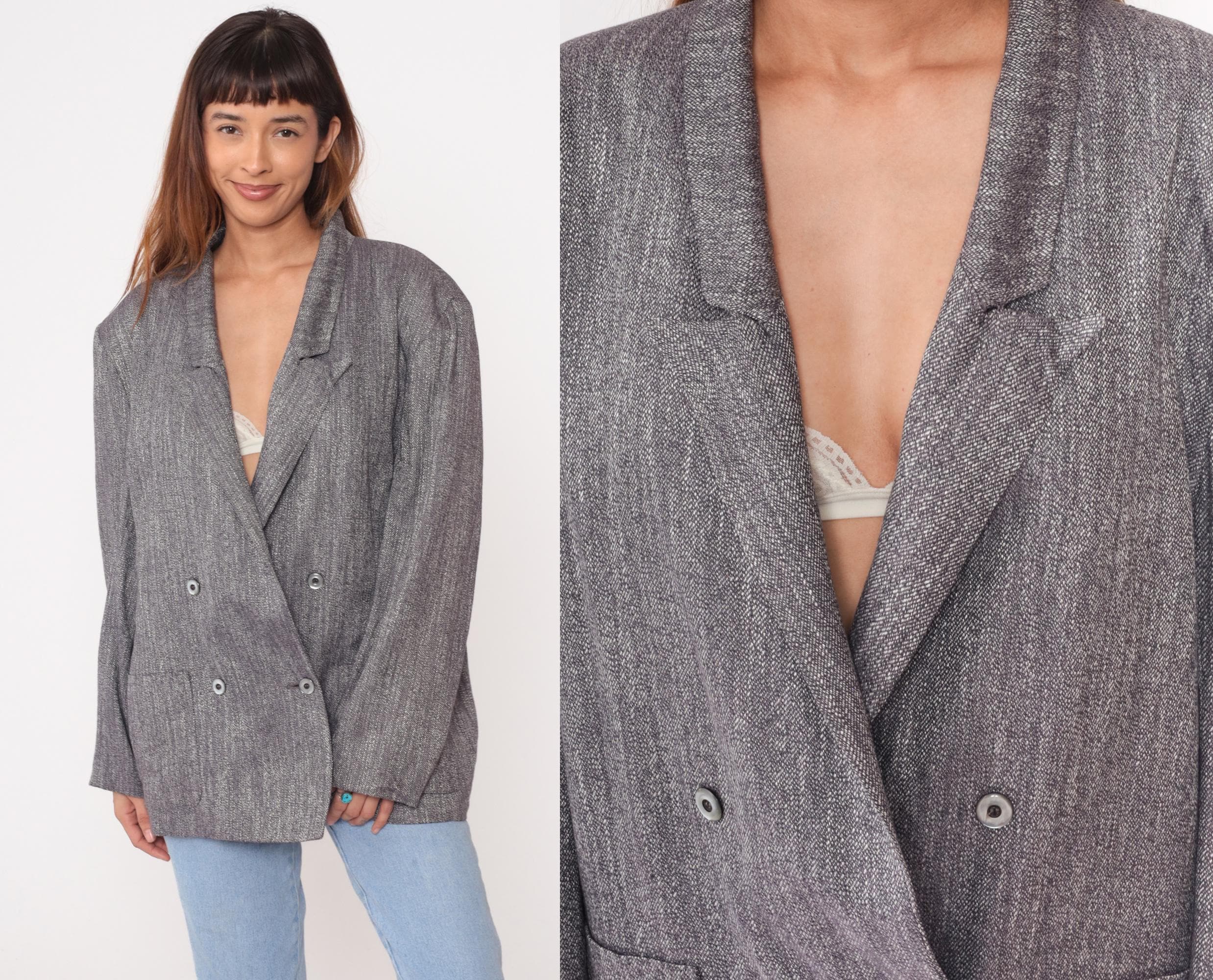 80s charcoal gray double-breasted blazer from metra by jantzen in textured salt and pepper woven fabric. Peak lapels, four button front closure, and front patch pockets.