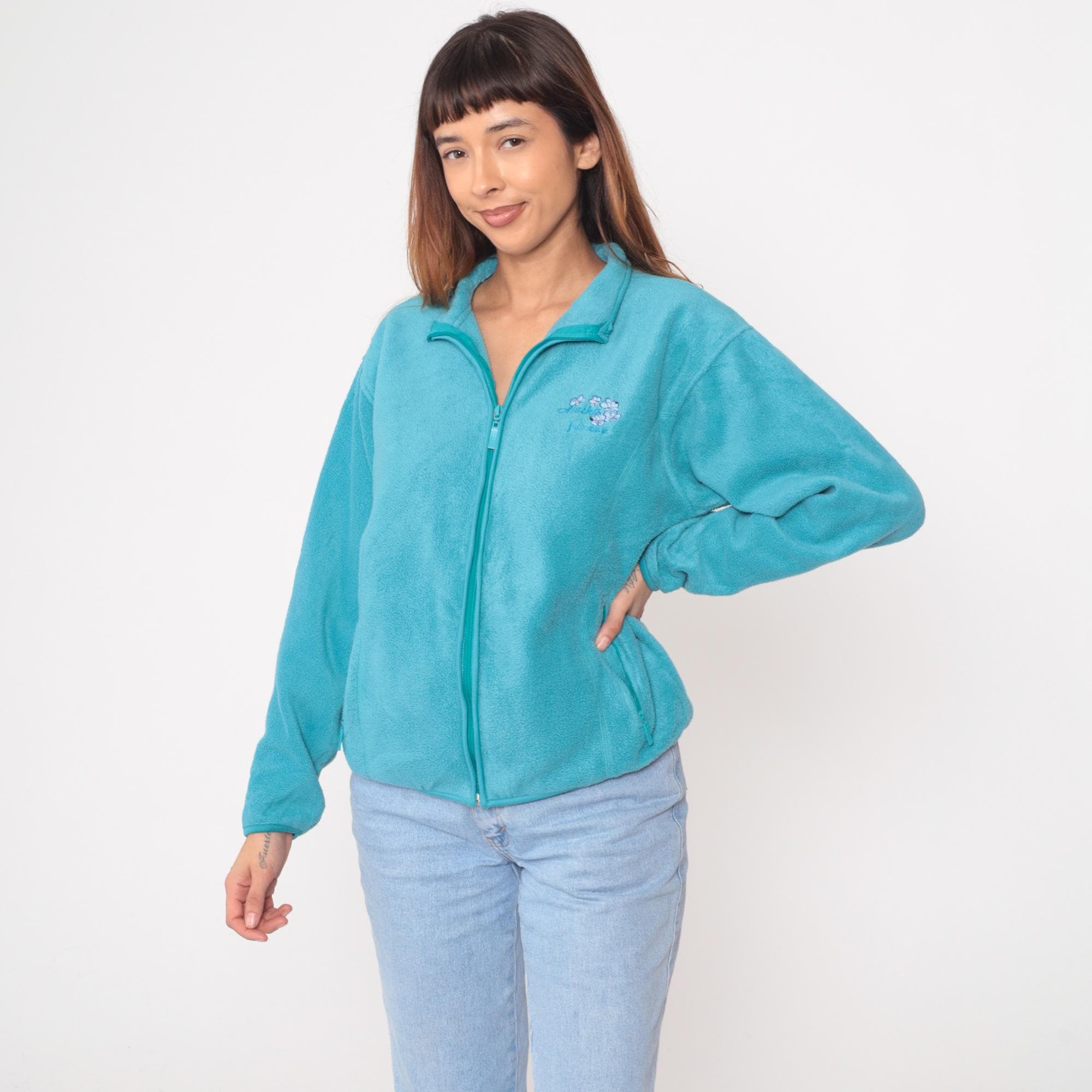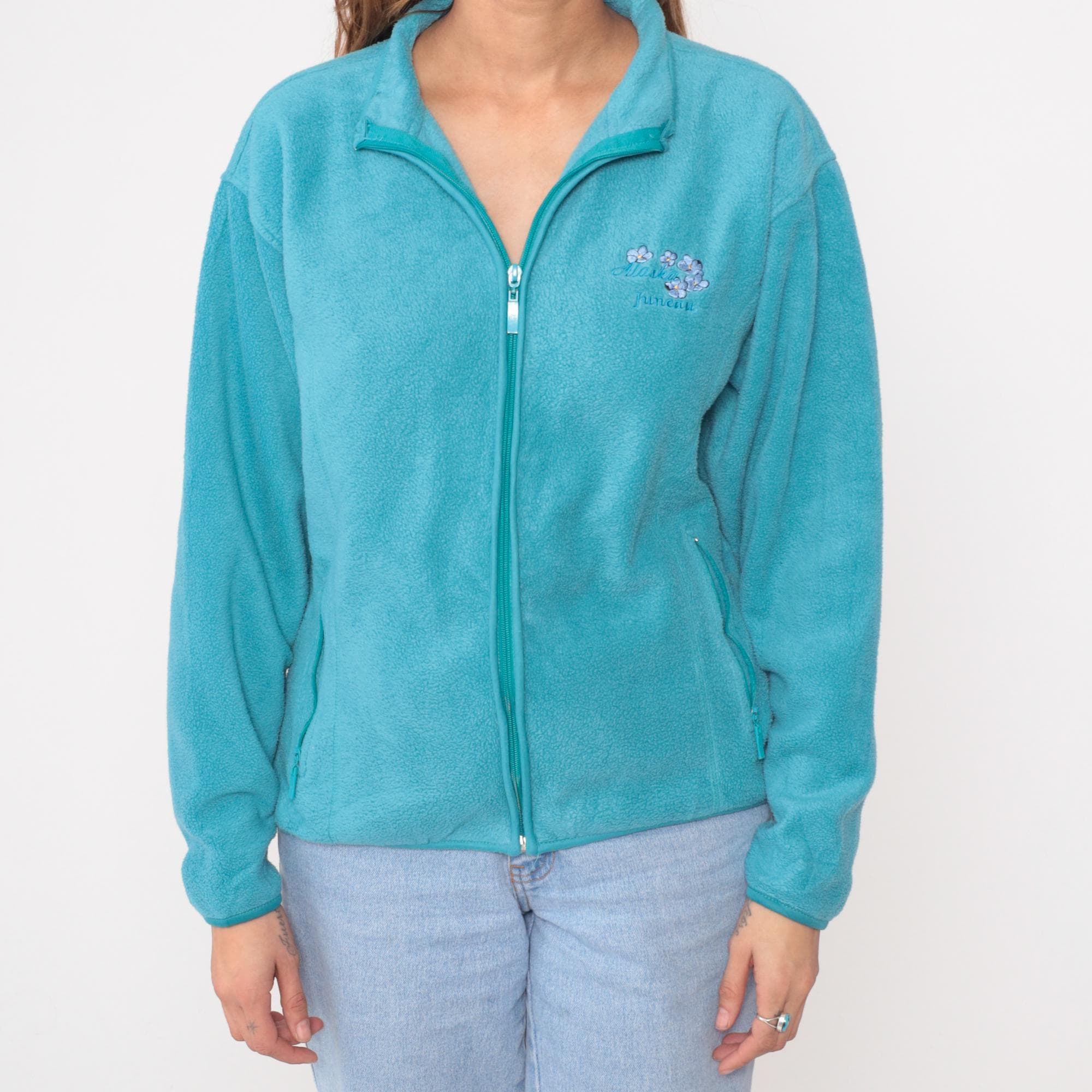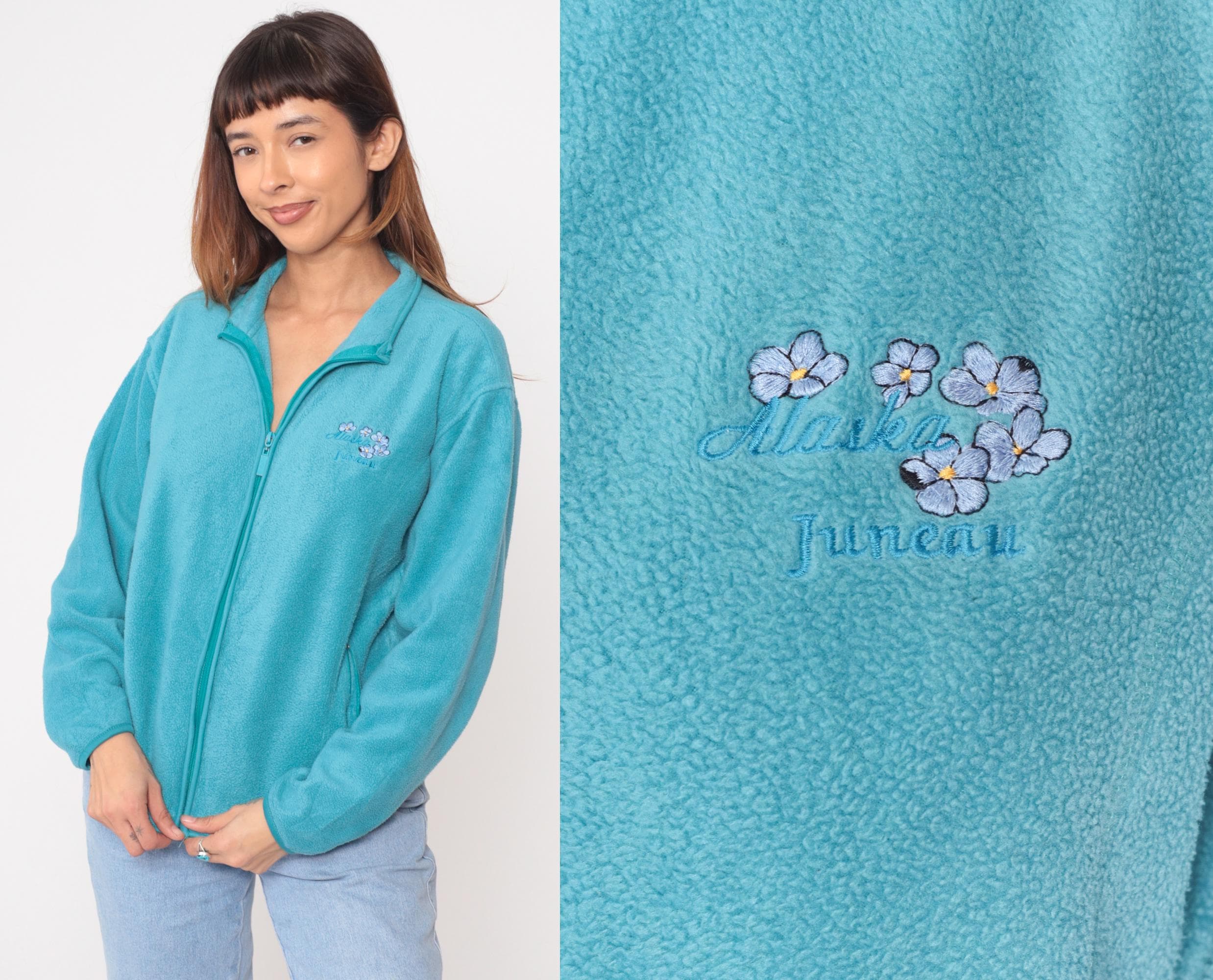 Y2K turquoise fleece jacket from dimco with embroidered floral design and "Juneau" text on left chest. Full front zipper closure, stand collar, long sleeves, and two zippered side pockets.