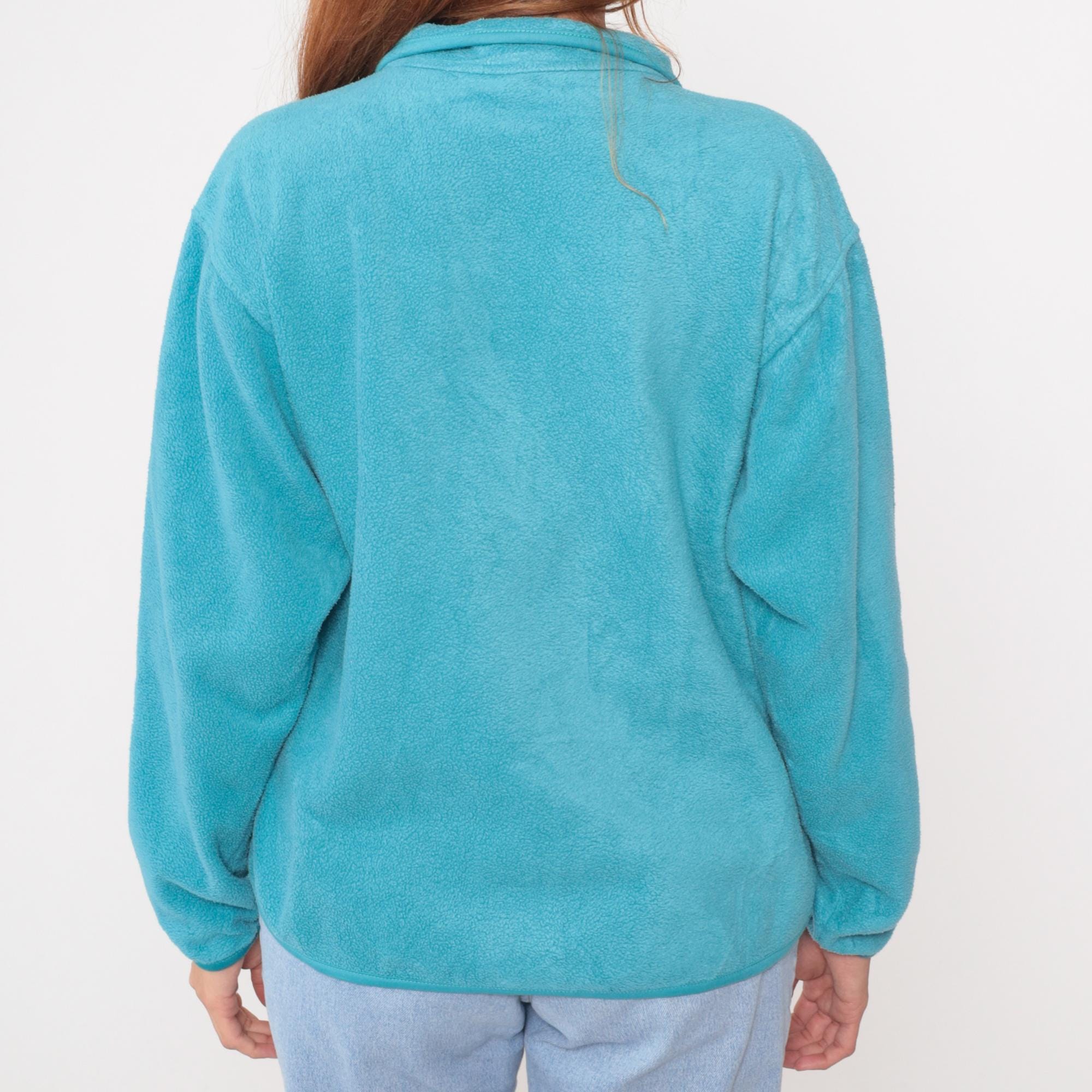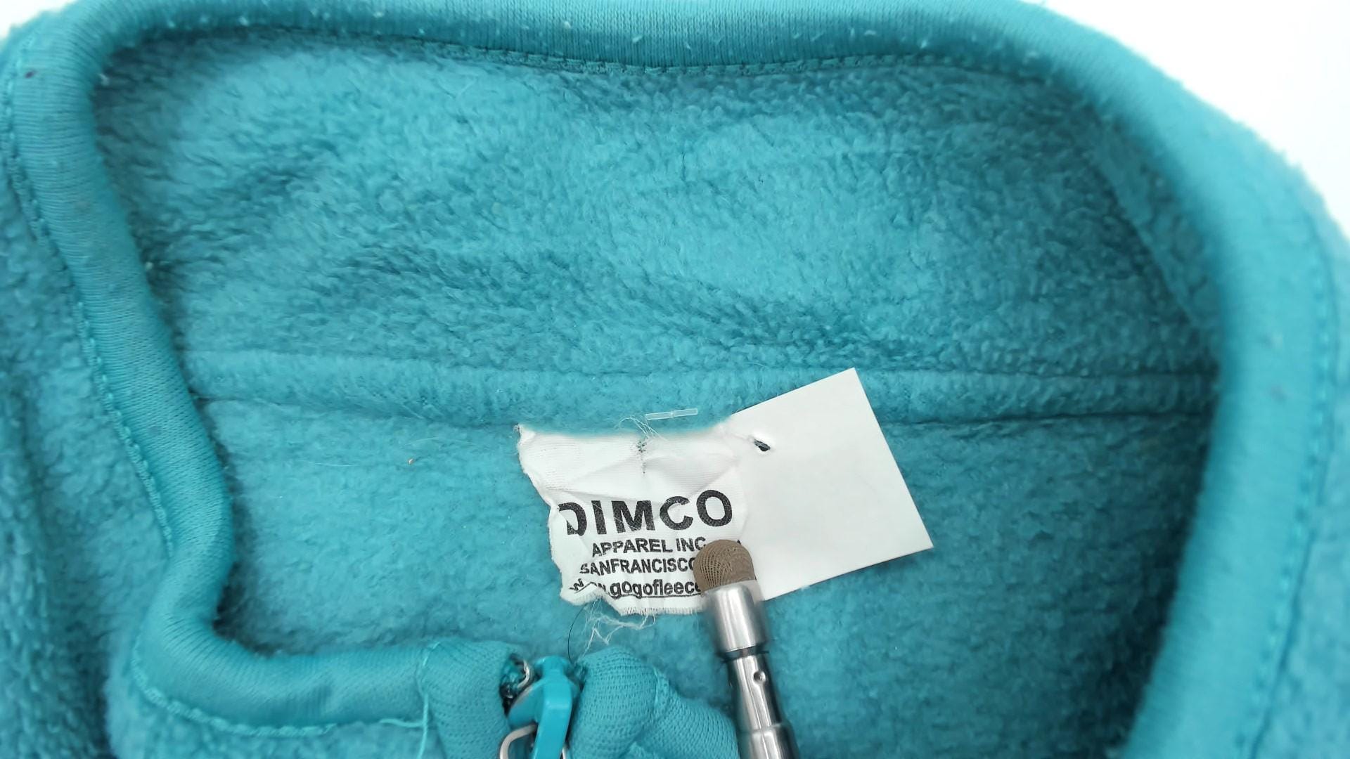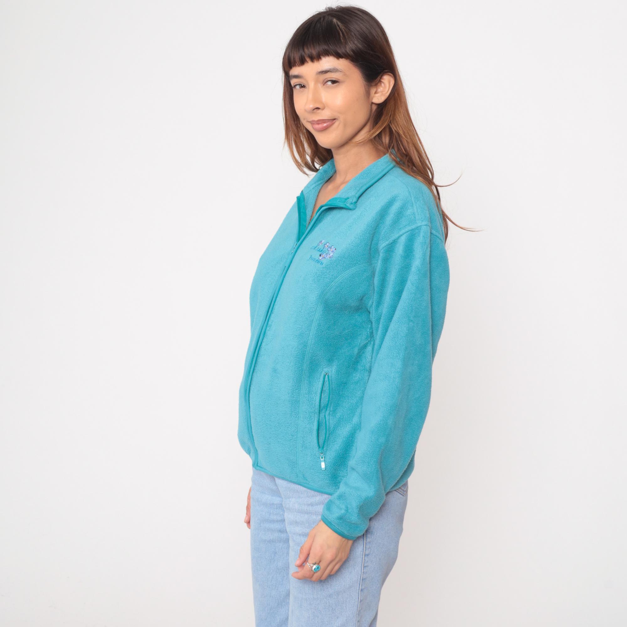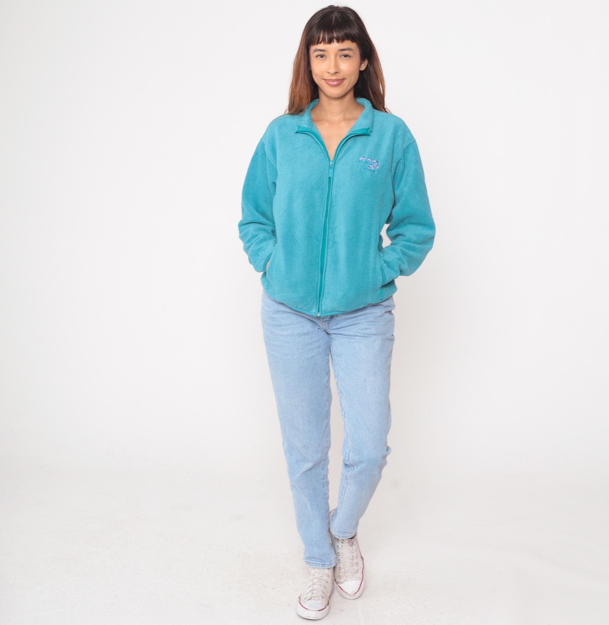 Y2K turquoise fleece jacket from dimco with embroidered floral design and "Juneau" text on left chest. Full front zipper closure, stand collar, long sleeves, and two zippered side pockets.