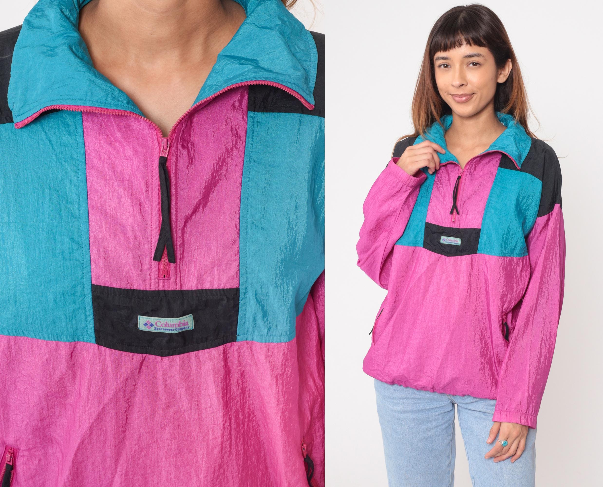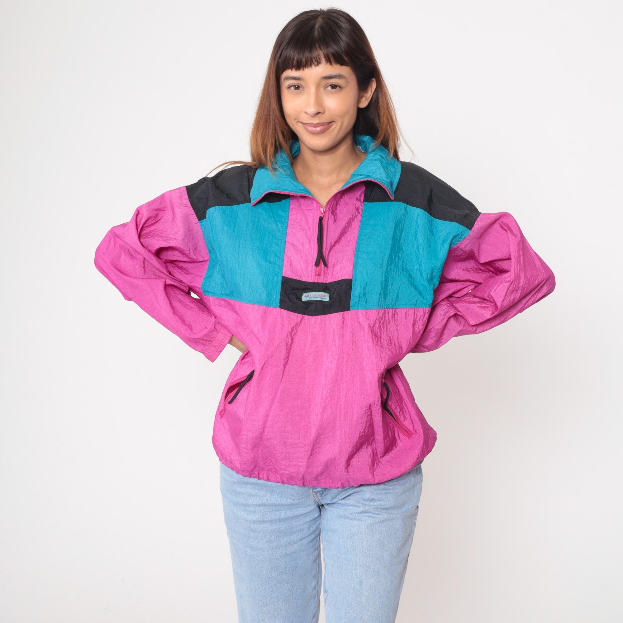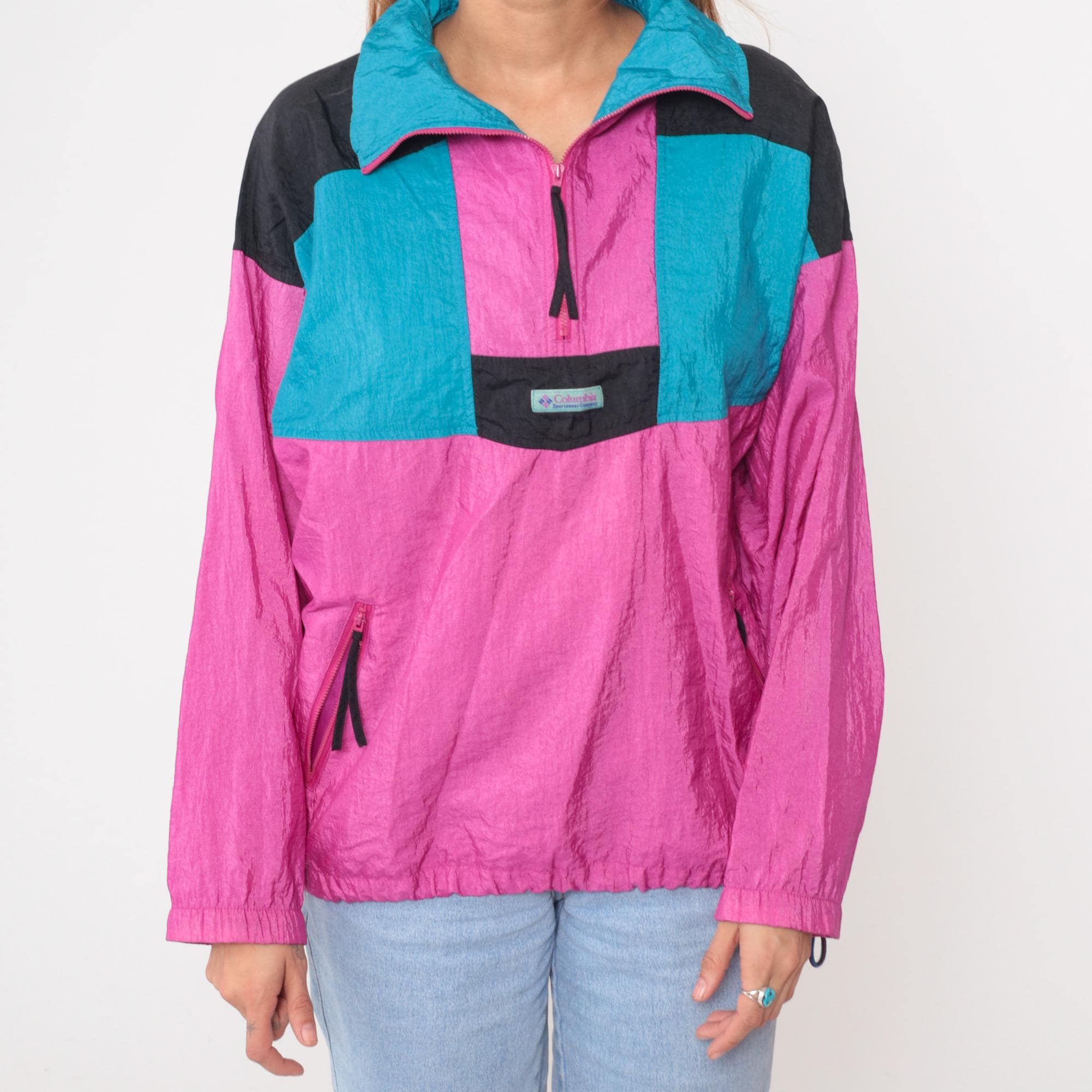 90s colorblock windbreaker pullover from Columbia in hot pink, turquoise, and black. Half-zip front closure with stand collar, long sleeves with elastic cuffs, elastic hem at waist. Chest pocket with Columbia label, side zipper pocket.