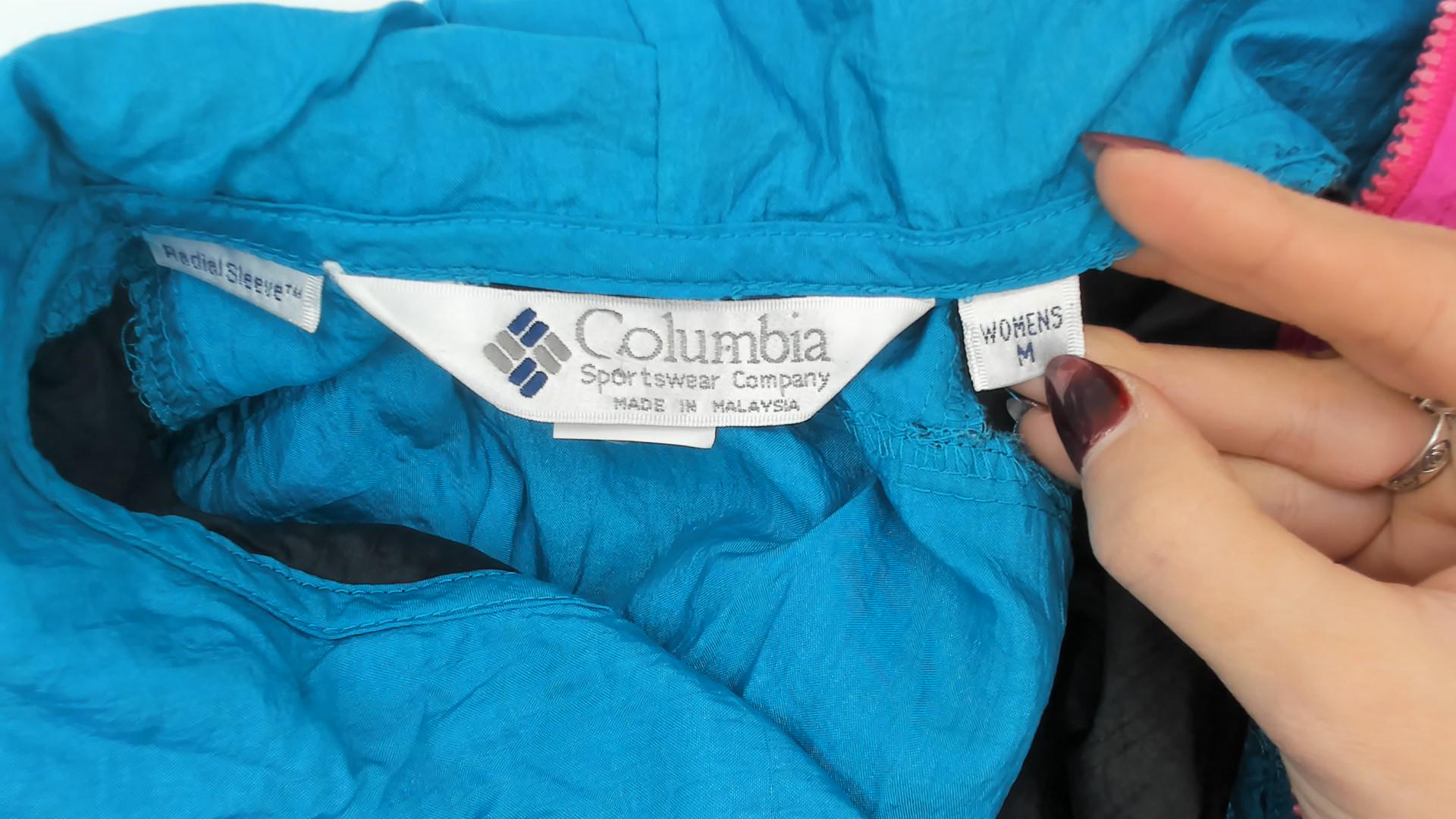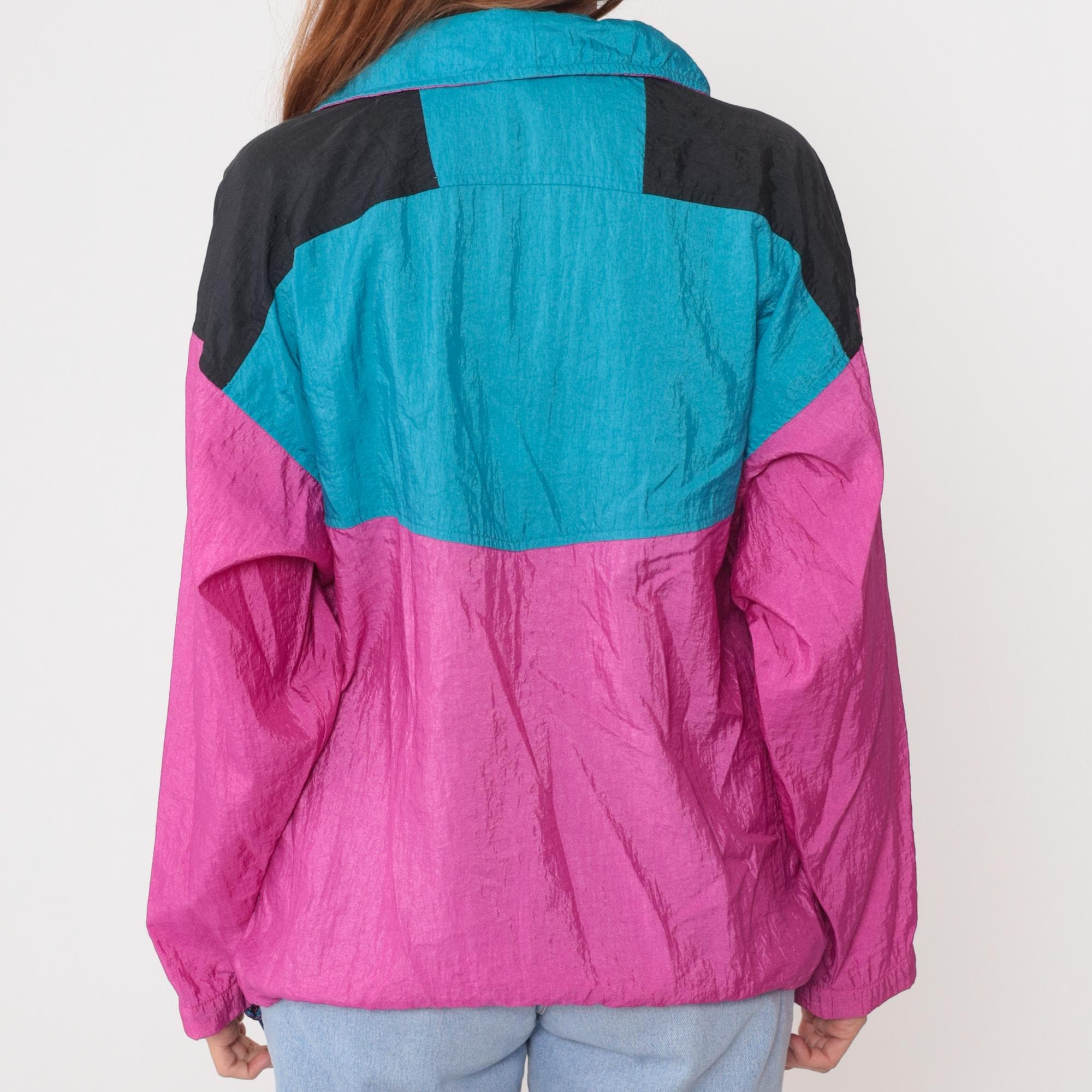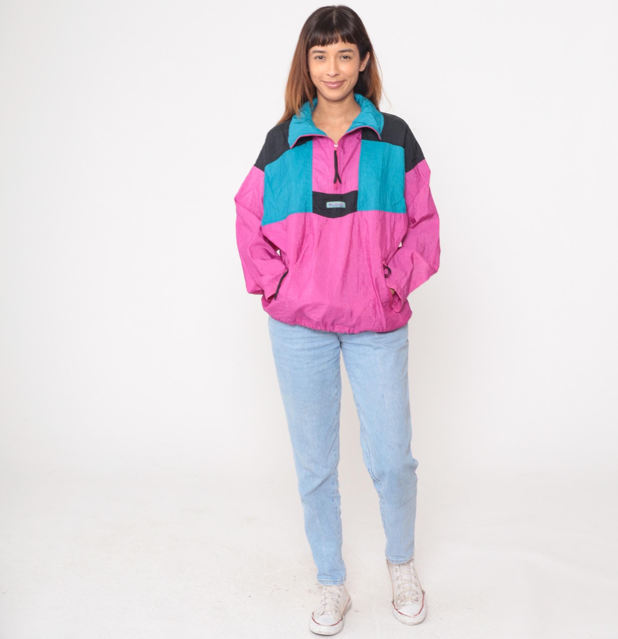90s colorblock windbreaker pullover from Columbia in hot pink, turquoise, and black. Half-zip front closure with stand collar, long sleeves with elastic cuffs, elastic hem at waist. Chest pocket with Columbia label, side zipper pocket.