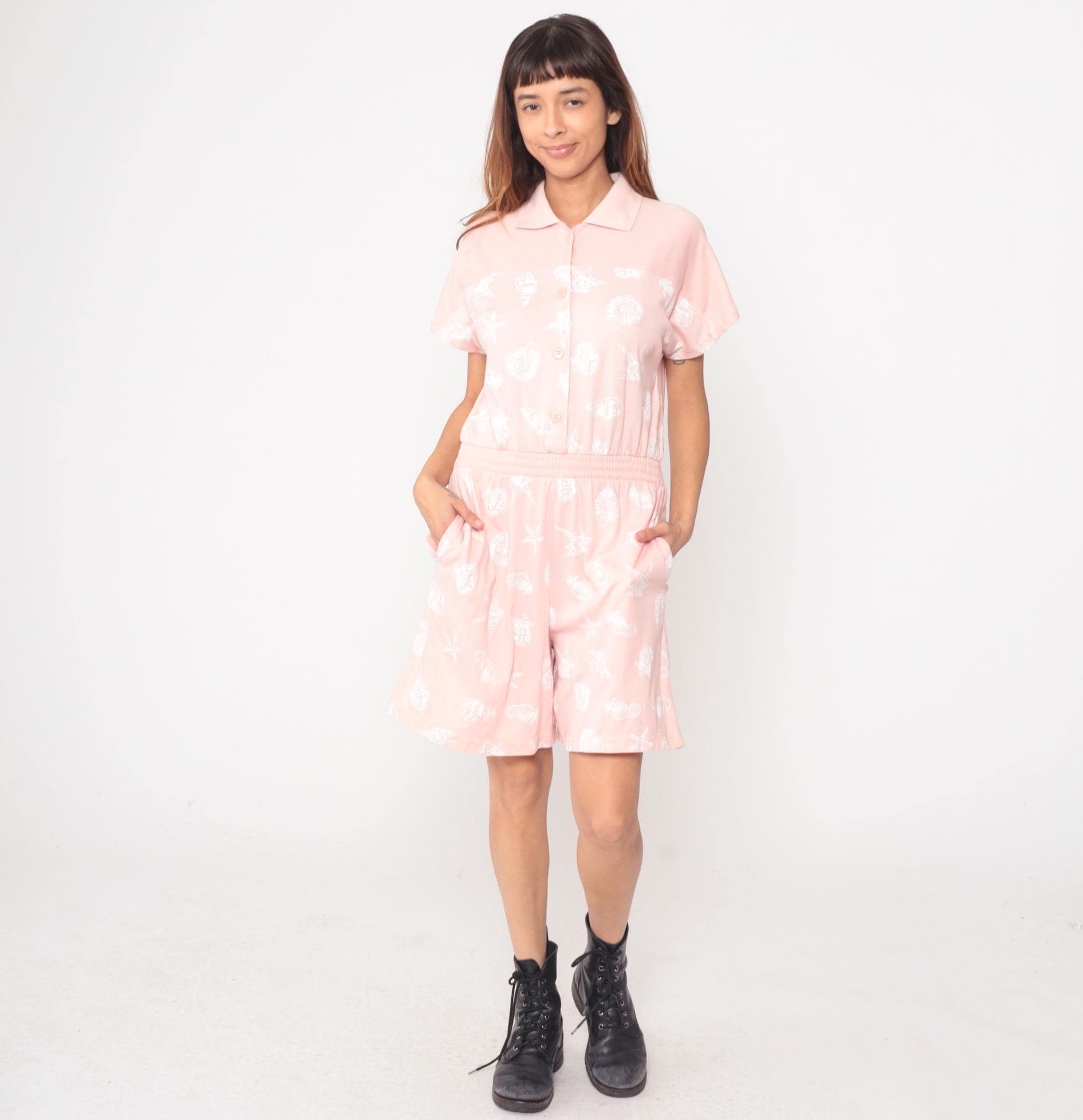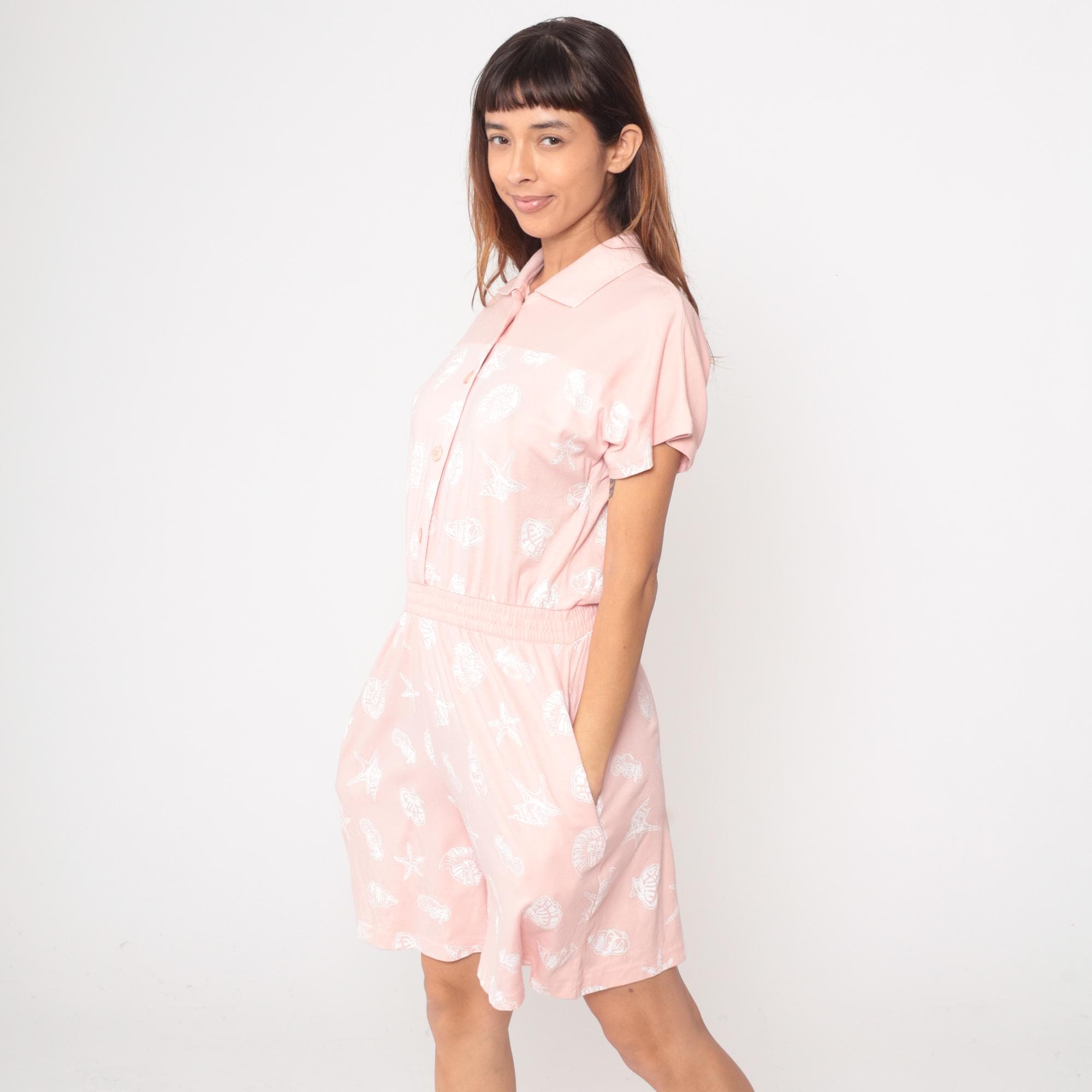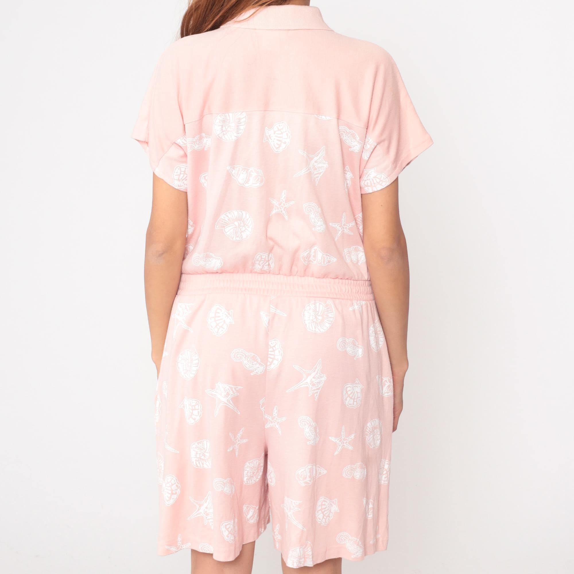 80s pale pink romper from Michael B LTD Petites with shawl collar, deep V-neckline, and short kimono sleeves. Belted waist with two patch pockets at hips.