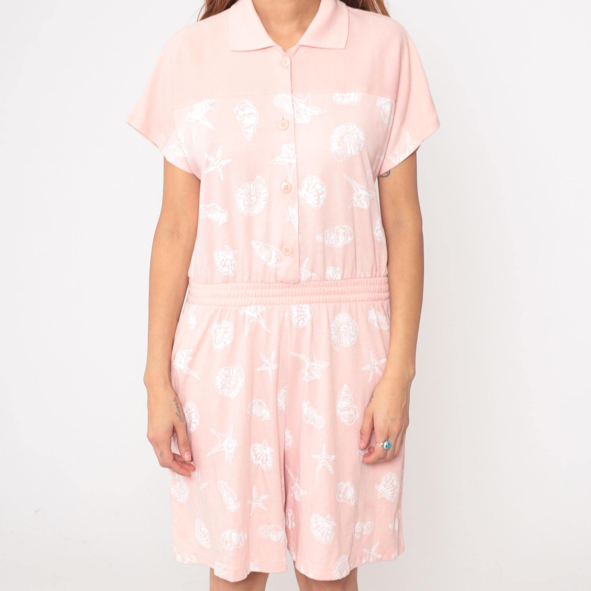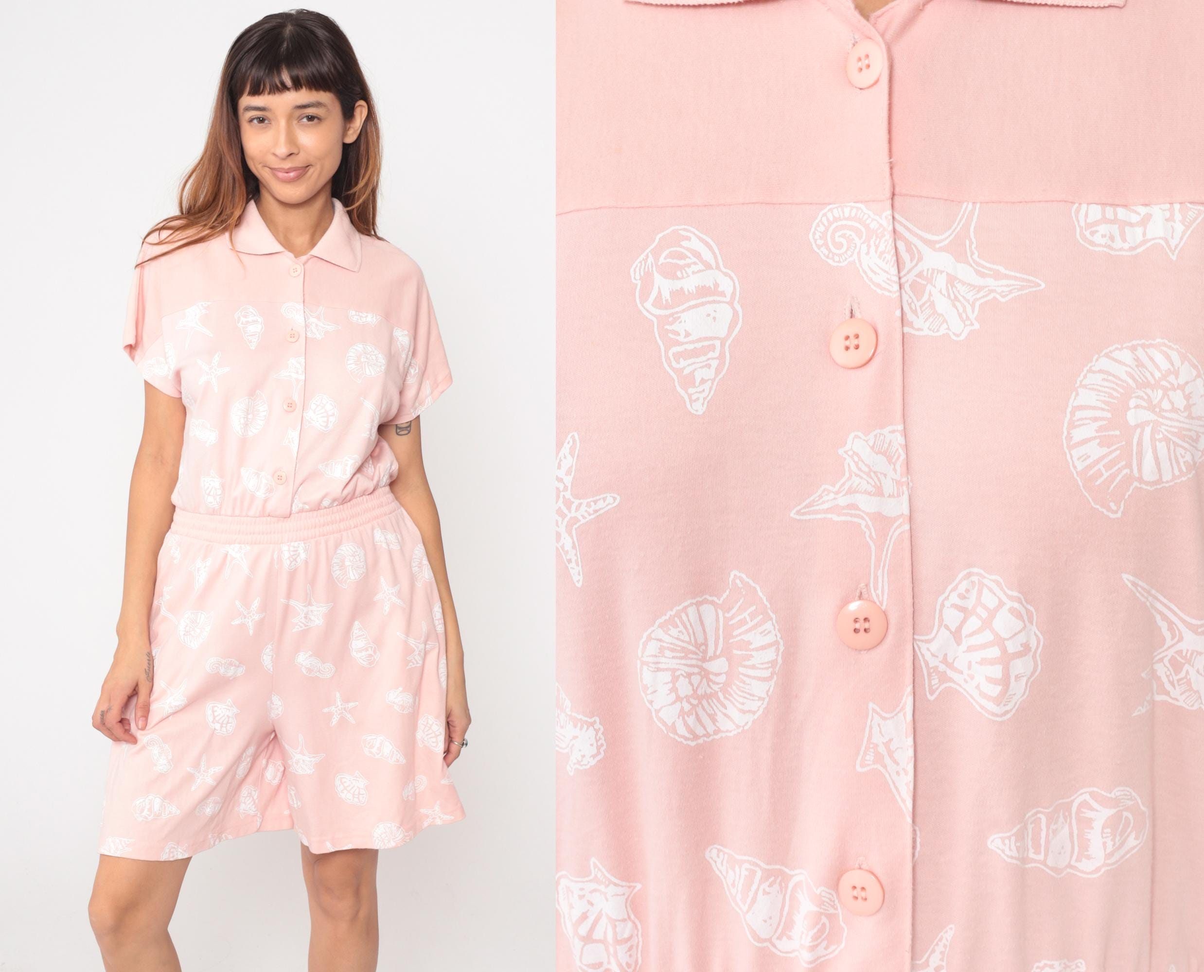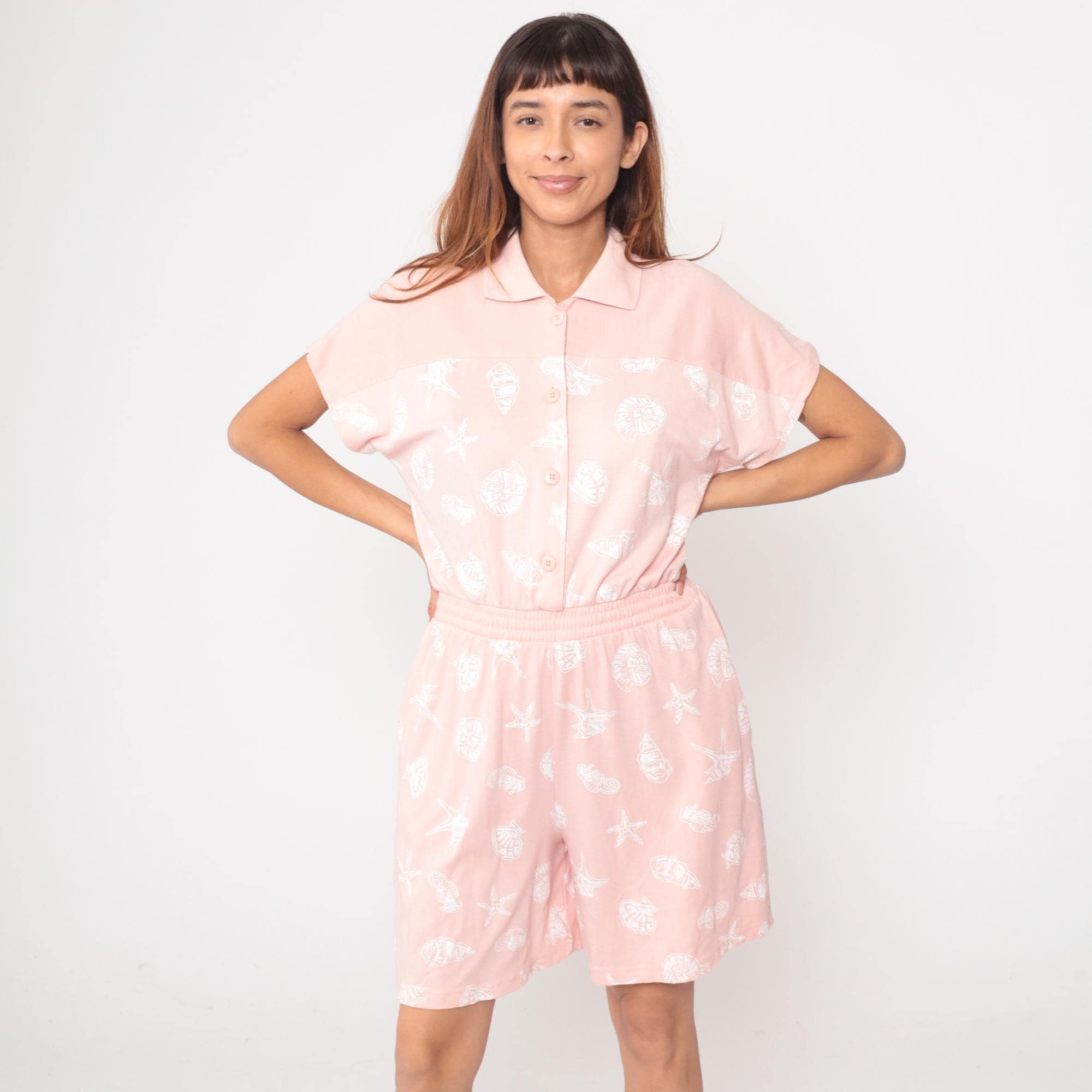 80s pale pink romper from Michael B LTD Petites with shawl collar, deep V-neckline, and short kimono sleeves. Belted waist with two patch pockets at hips.